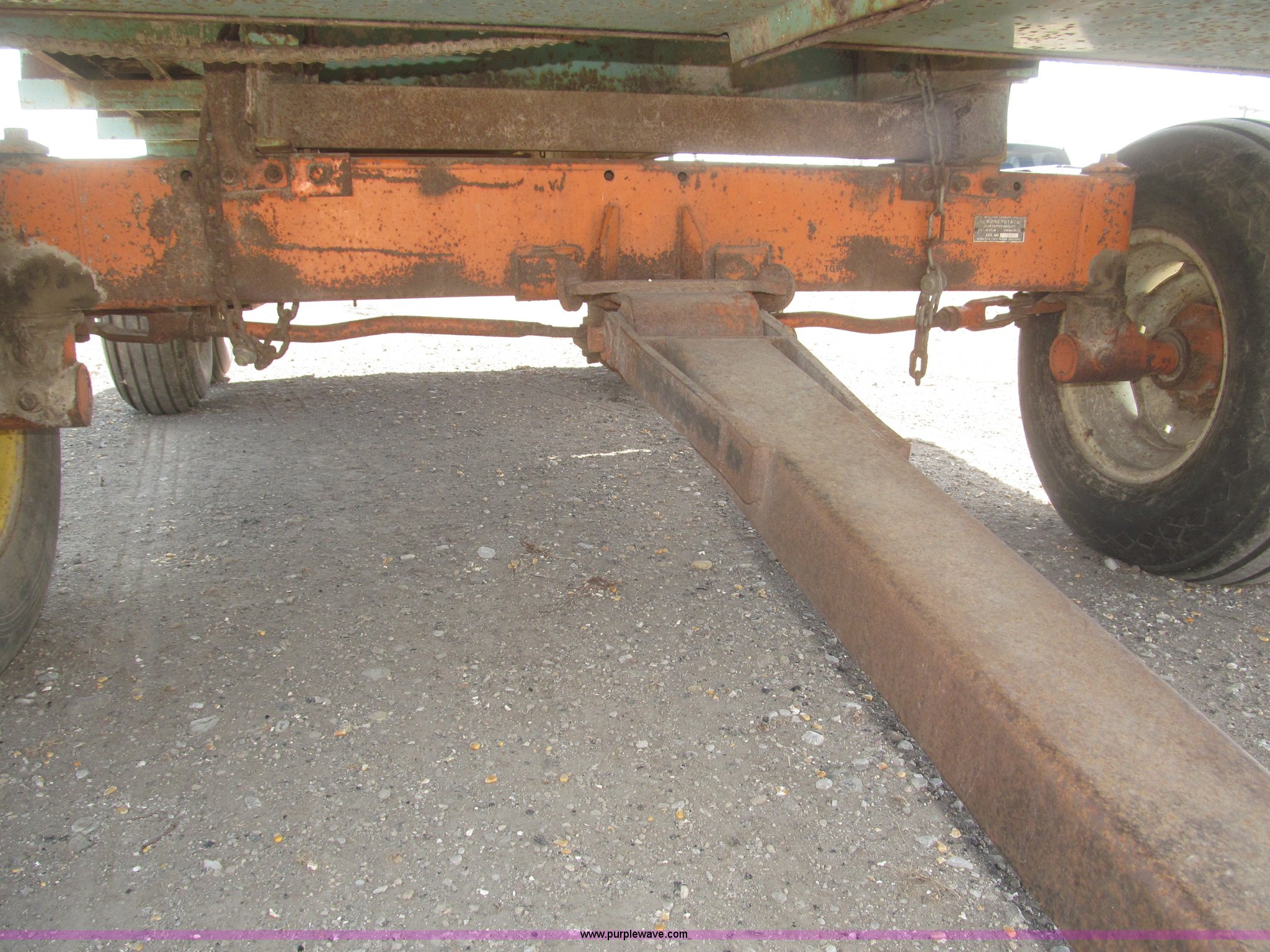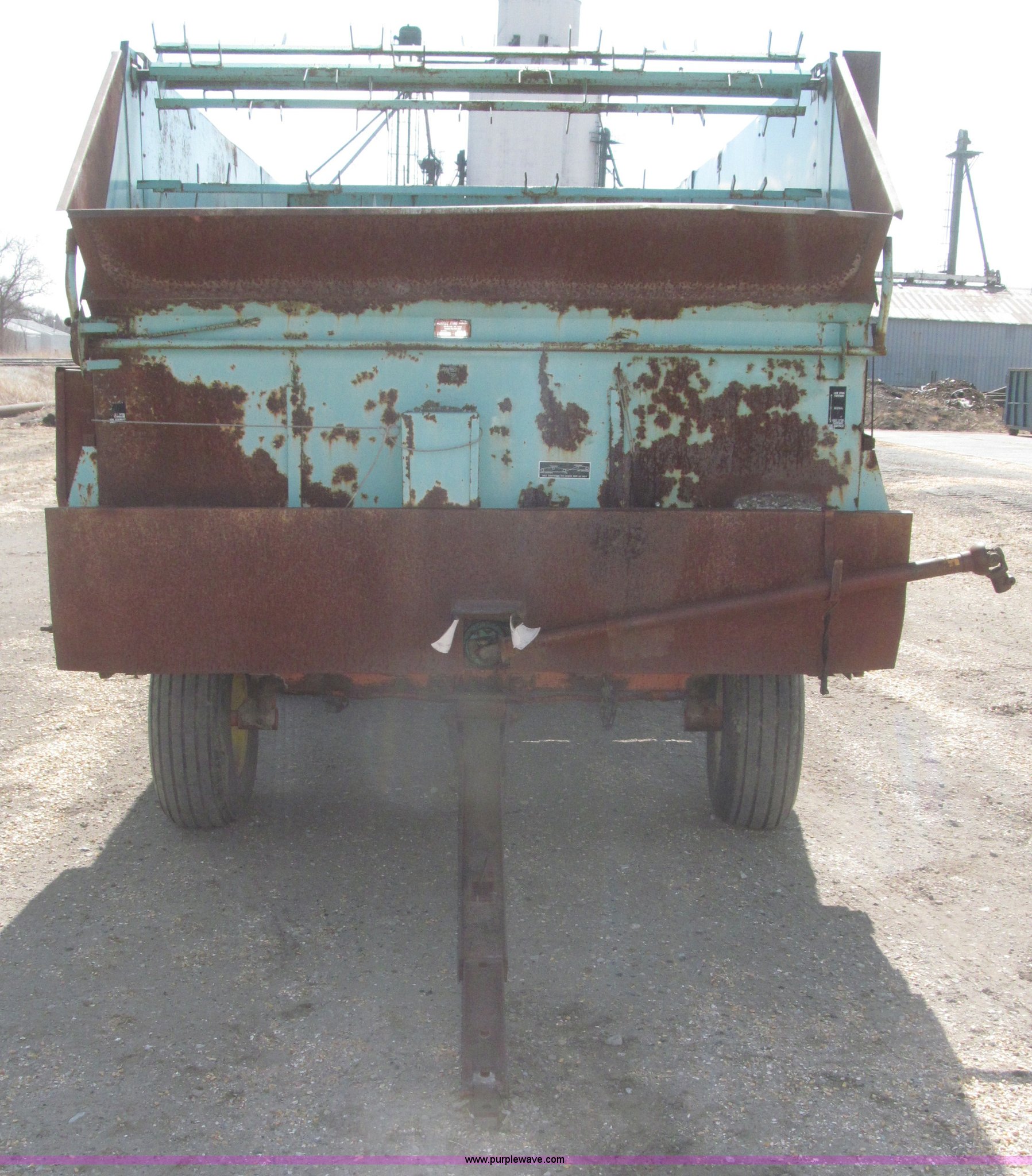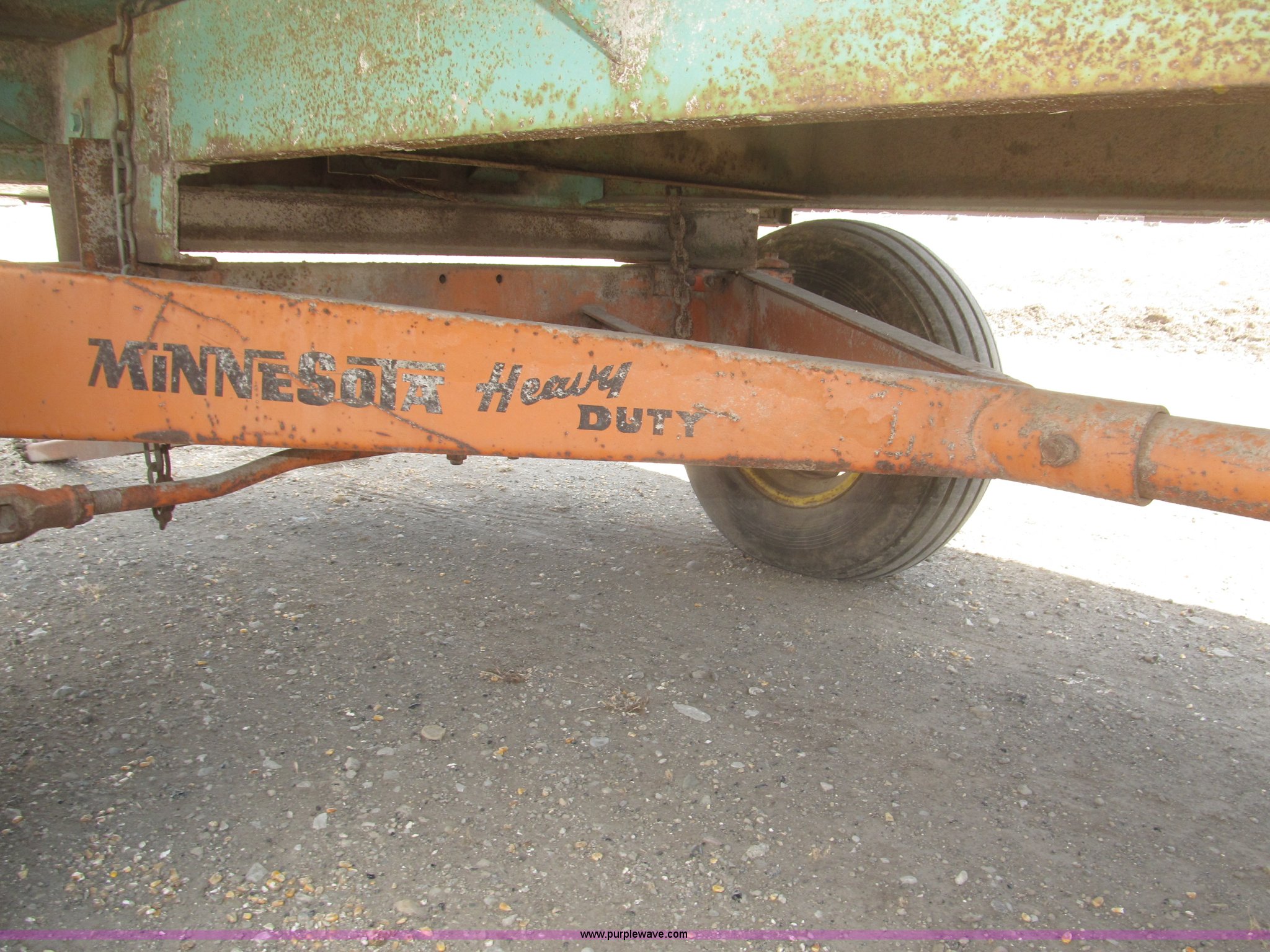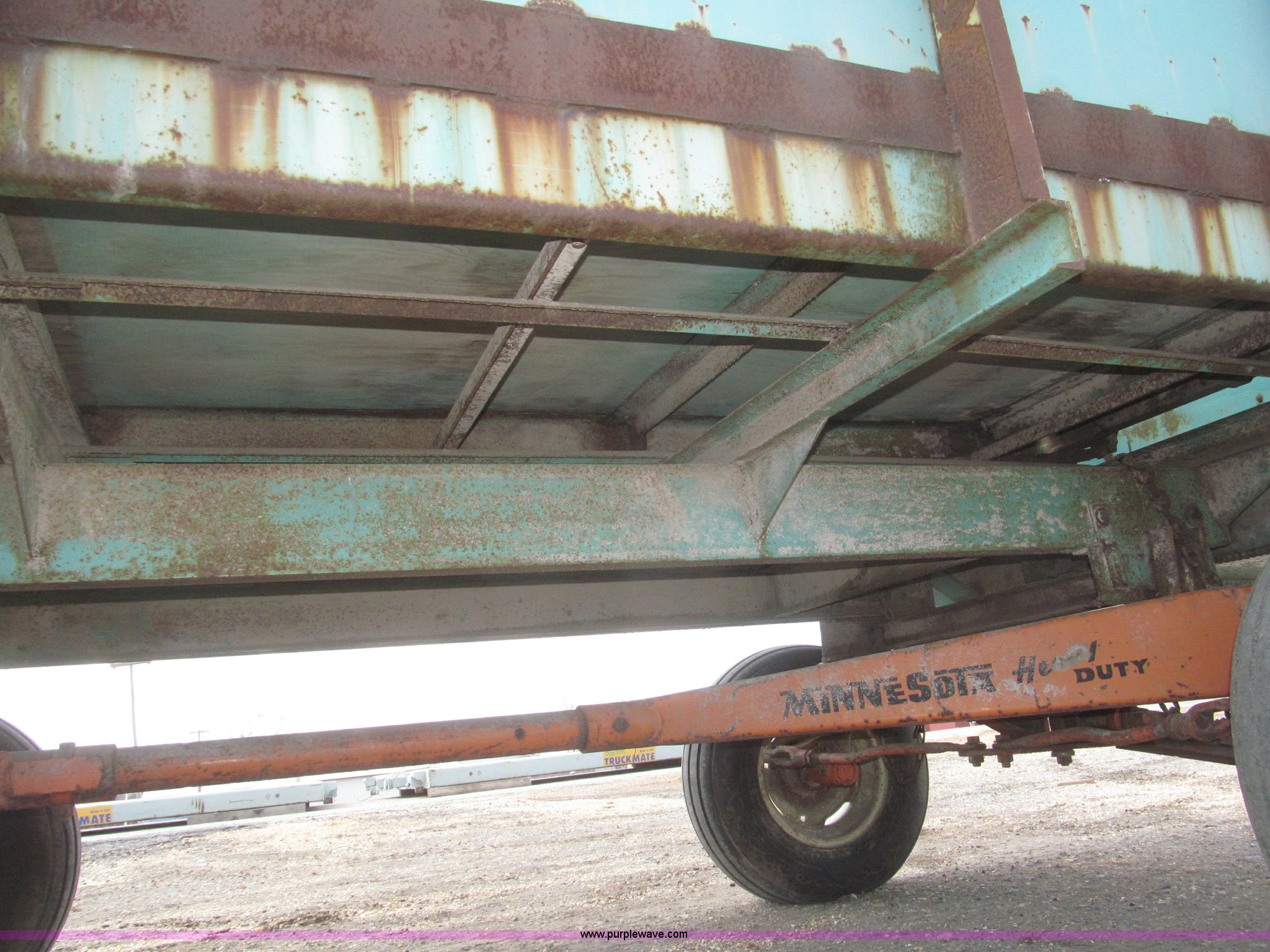 Purple Wave is selling a used Forage Head or Silage Handling in Iowa. This item is a Forage King A186 forage wagon with the following: 540 PTO, Two speed apron, Rear end gate, Approx. 16'L x 7'W O.D. box, Approx. 100"H ground to top of side rail, Adjustable length pin hitch tongue, Rear pin hitch, Minneota Tandem 12 running gear, Model12078, Six hole steel wheels, 11L-15 tires, Tires cracking, Floor showing wear, Serial 1068