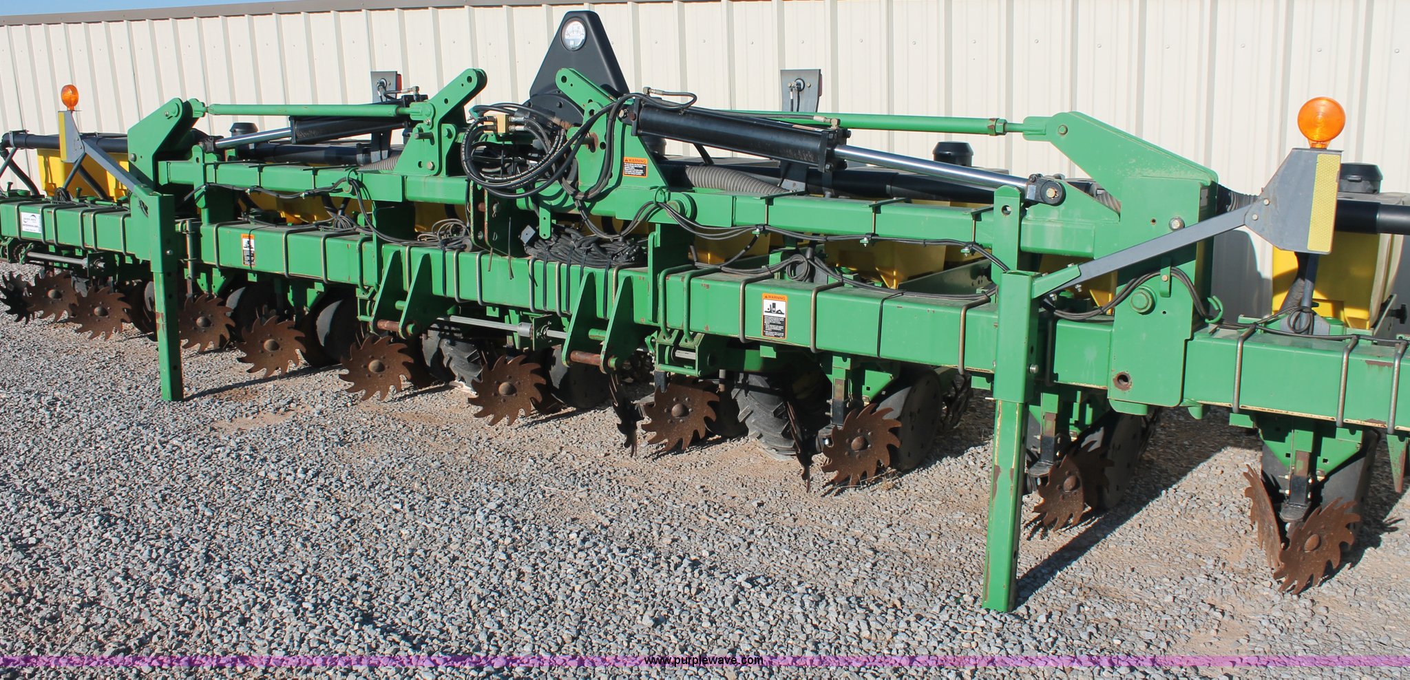 Purple Wave is selling a used Planter in Oklahoma. This item is a 2000 John Deere 1720 Integral Stack-Fold planter with the following: 23' toolbar, 12 rows, 30" spacing, MaxEmerge Plus vacumeter row units, John Deere Computer-Trak 150 monitor, Serial ADMC150033469, Individual seed hoppers, Insecticide boxes, Vacuum meters, Ground driven metering system, Adjustable down pressure springs, Sunco Sabertooth row cleaners, Jingle disk openers, Schlagel Posi close wheels, T-handle adjustable, Three point, Hydraulic stack and fold, 15" x 4.5" dual press wheels, 7.6-15SL tires, Serial A01720R690198, Unit# 81034