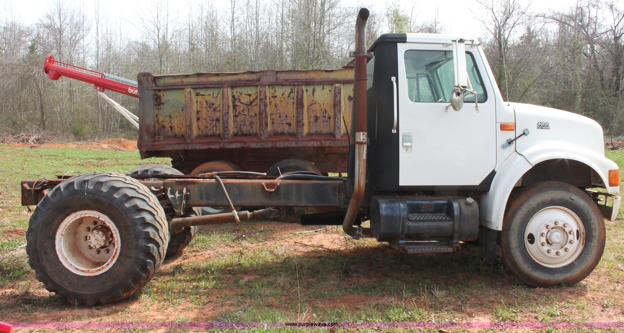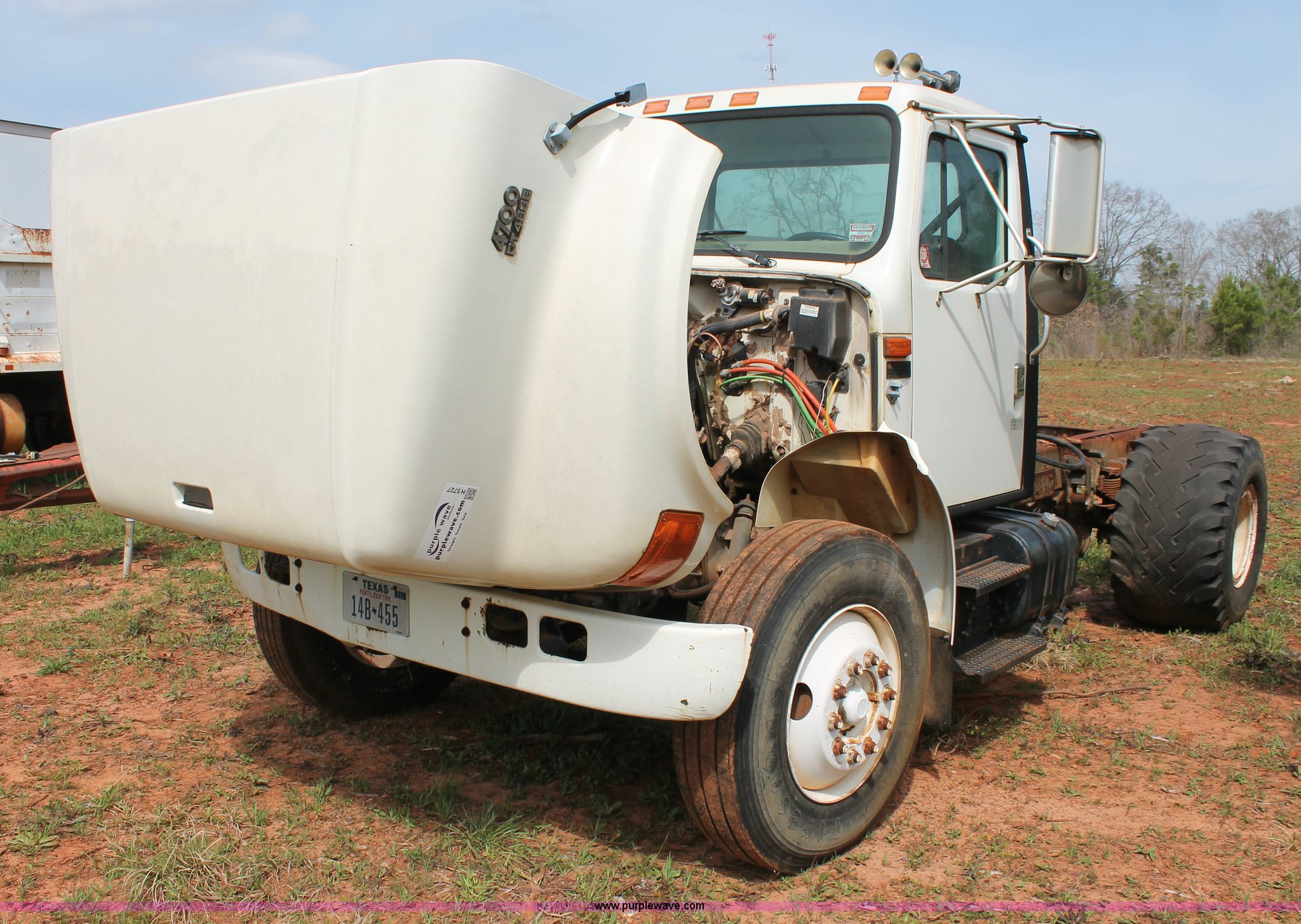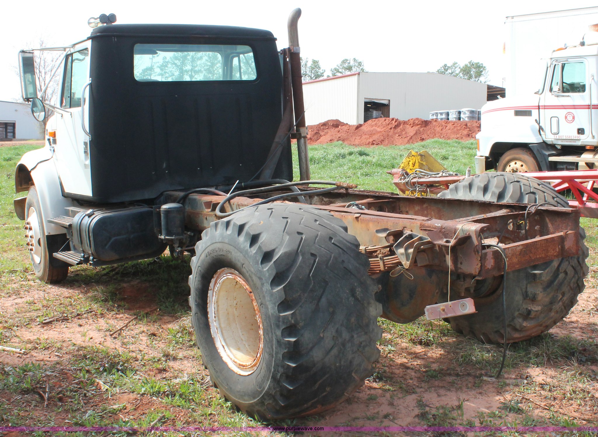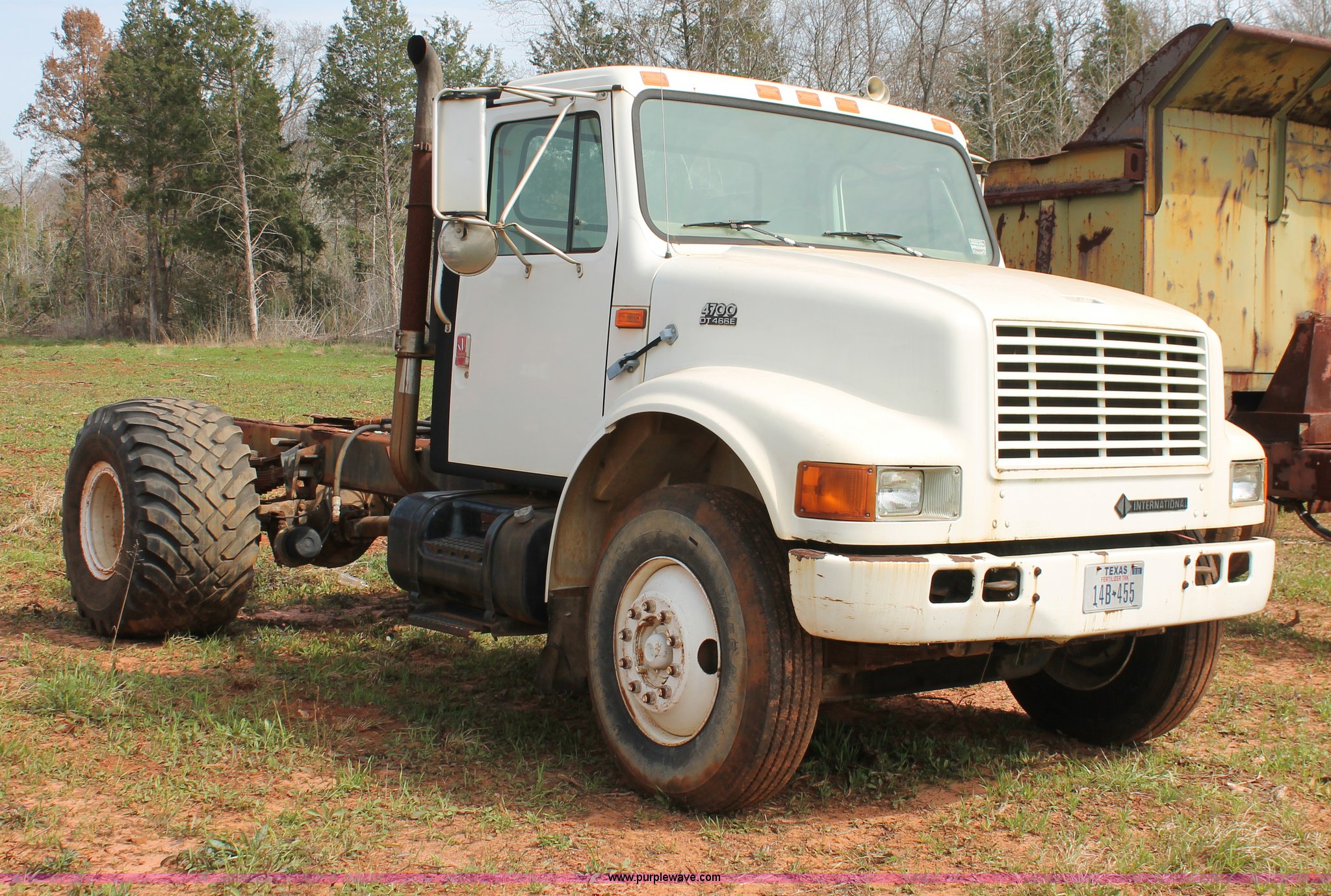 Purple Wave is selling a used Truck Chassis in Texas. This item is a 1999 International 4700 truck cab and chassis with the following: 86,354 miles on odometer, International DT466E 7.6L L6 diesel engine, International six speed plus manual transmission, AC and heat, Cruise, AM/FM, Air suspension seat, Impulse brake controller, Dual fuel tanks, 50 and 35 gallon capacities, Single rear exhaust stack, Spring suspension, Air brakes, 170" wheelbase, Firestone FS507 11R22.5 front tires, Primex Terra Blaster 48x25.00-20 rear tires, Unknown running condition