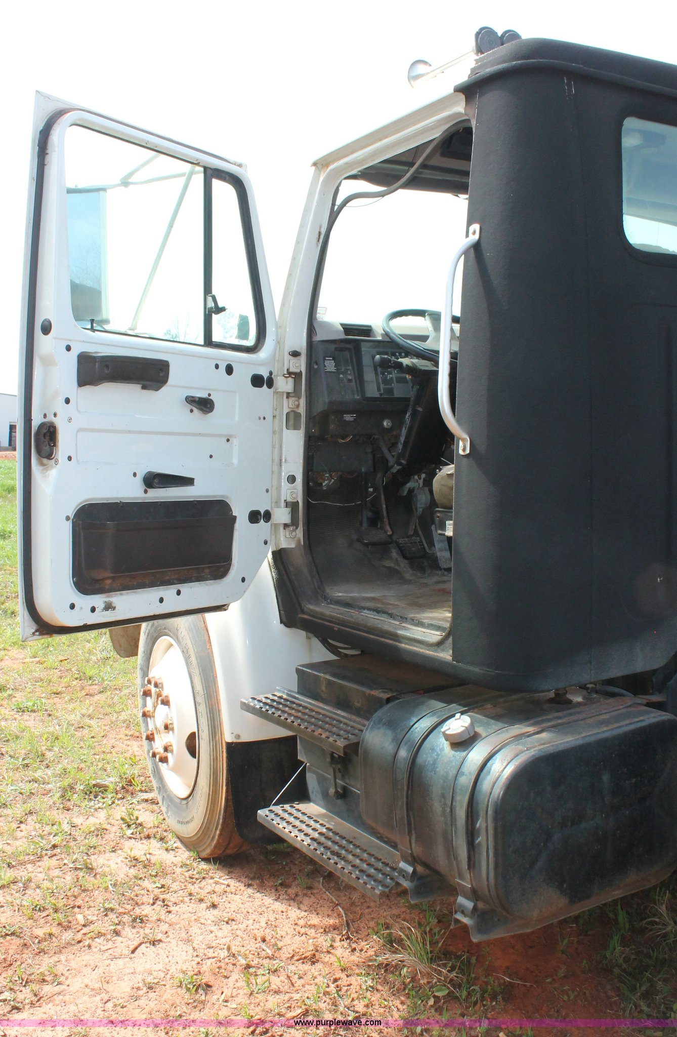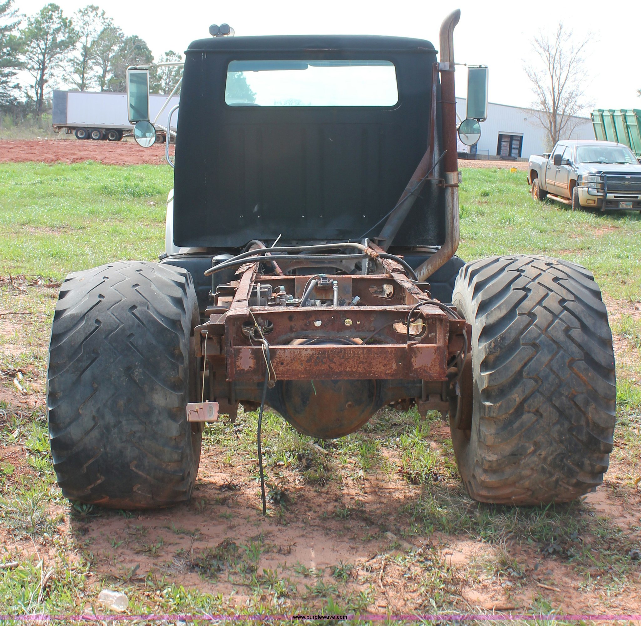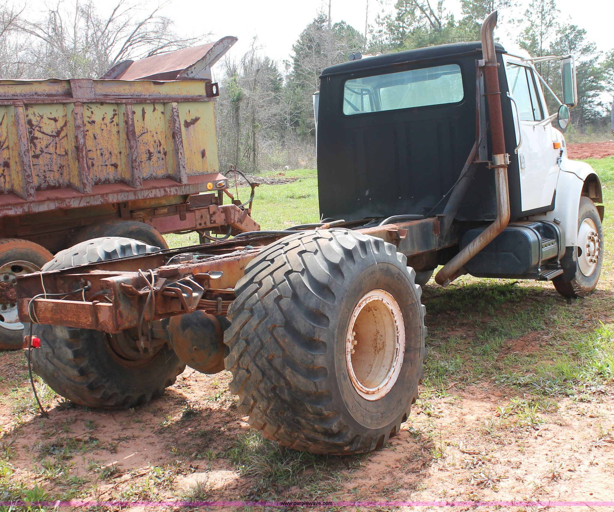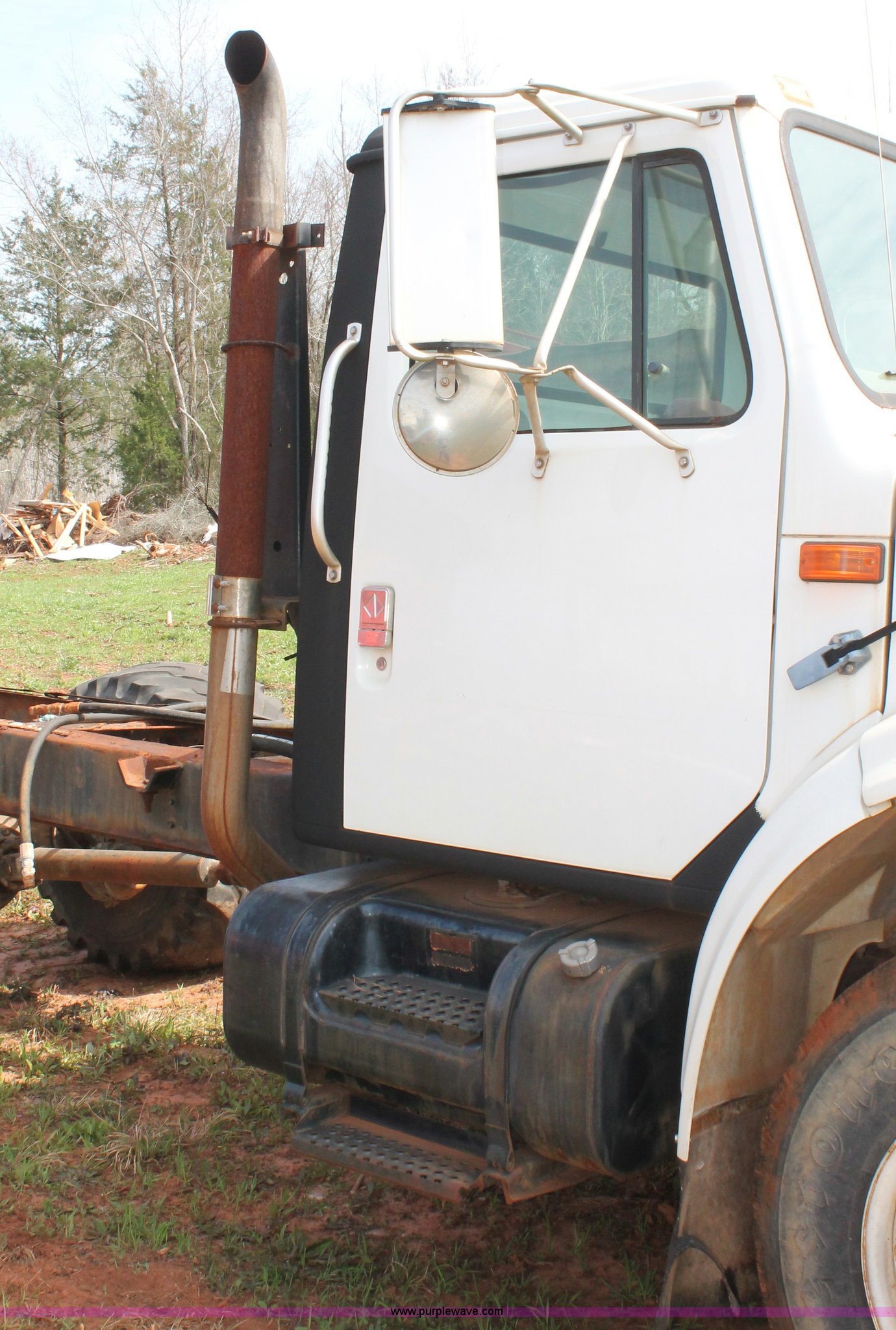 Purple Wave is selling a used Truck Chassis in Texas. This item is a 1999 International 4700 truck cab and chassis with the following: 86,354 miles on odometer, International DT466E 7.6L L6 diesel engine, International six speed plus manual transmission, AC and heat, Cruise, AM/FM, Air suspension seat, Impulse brake controller, Dual fuel tanks, 50 and 35 gallon capacities, Single rear exhaust stack, Spring suspension, Air brakes, 170" wheelbase, Firestone FS507 11R22.5 front tires, Primex Terra Blaster 48x25.00-20 rear tires, Unknown running condition