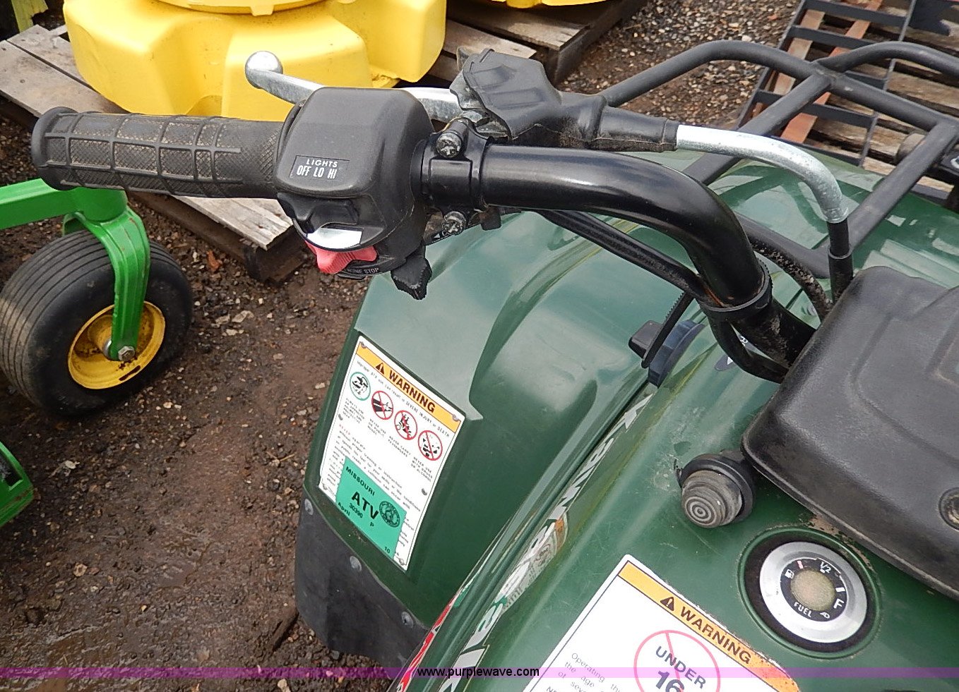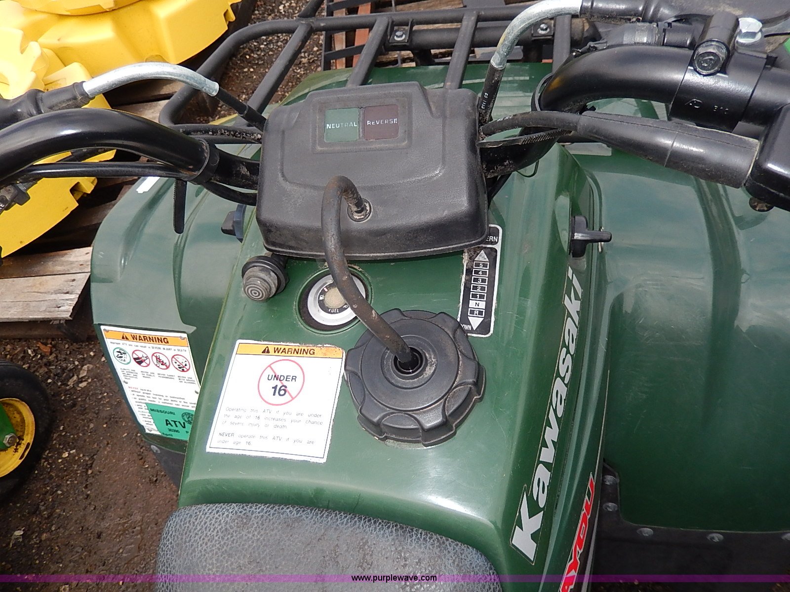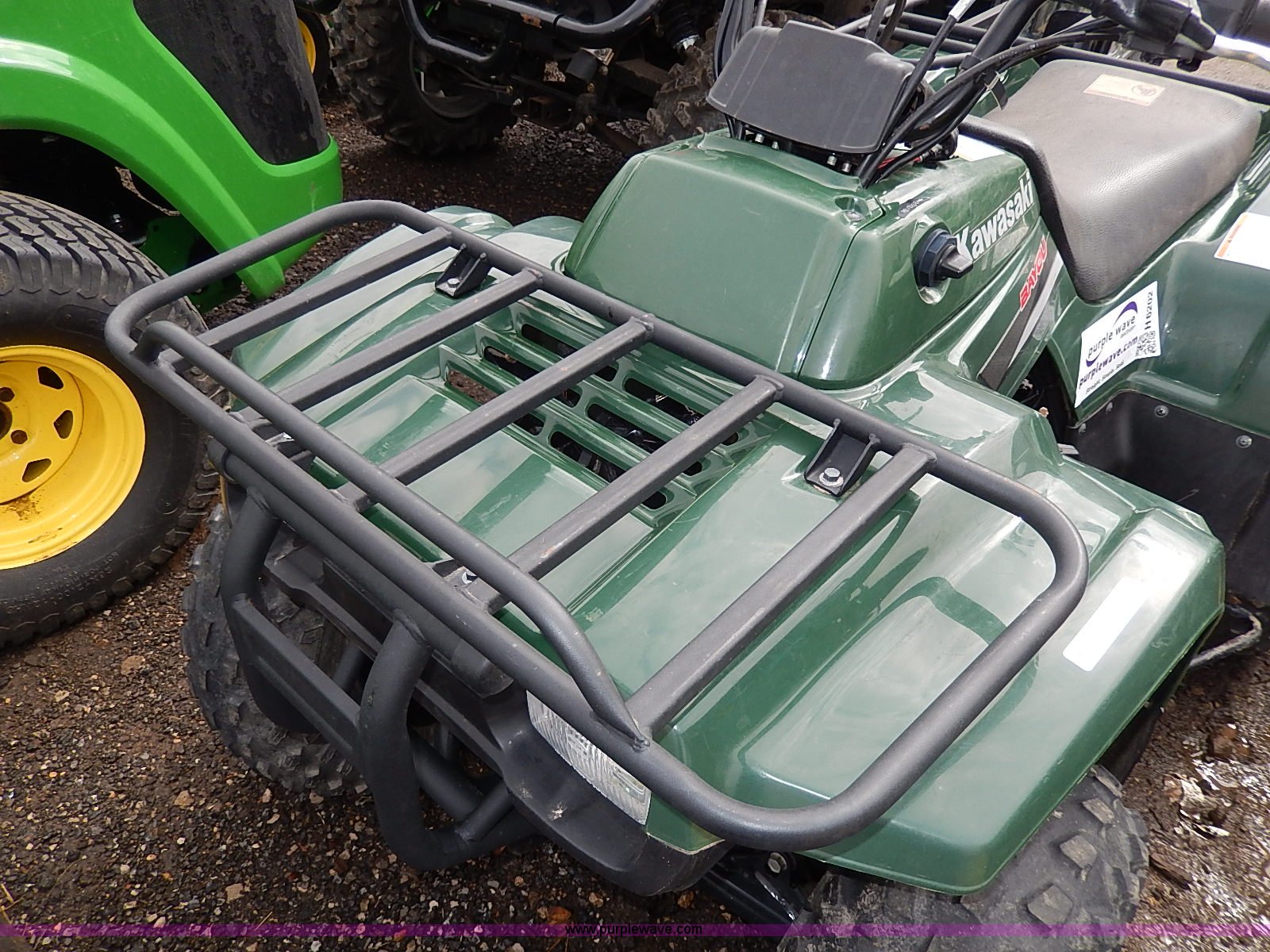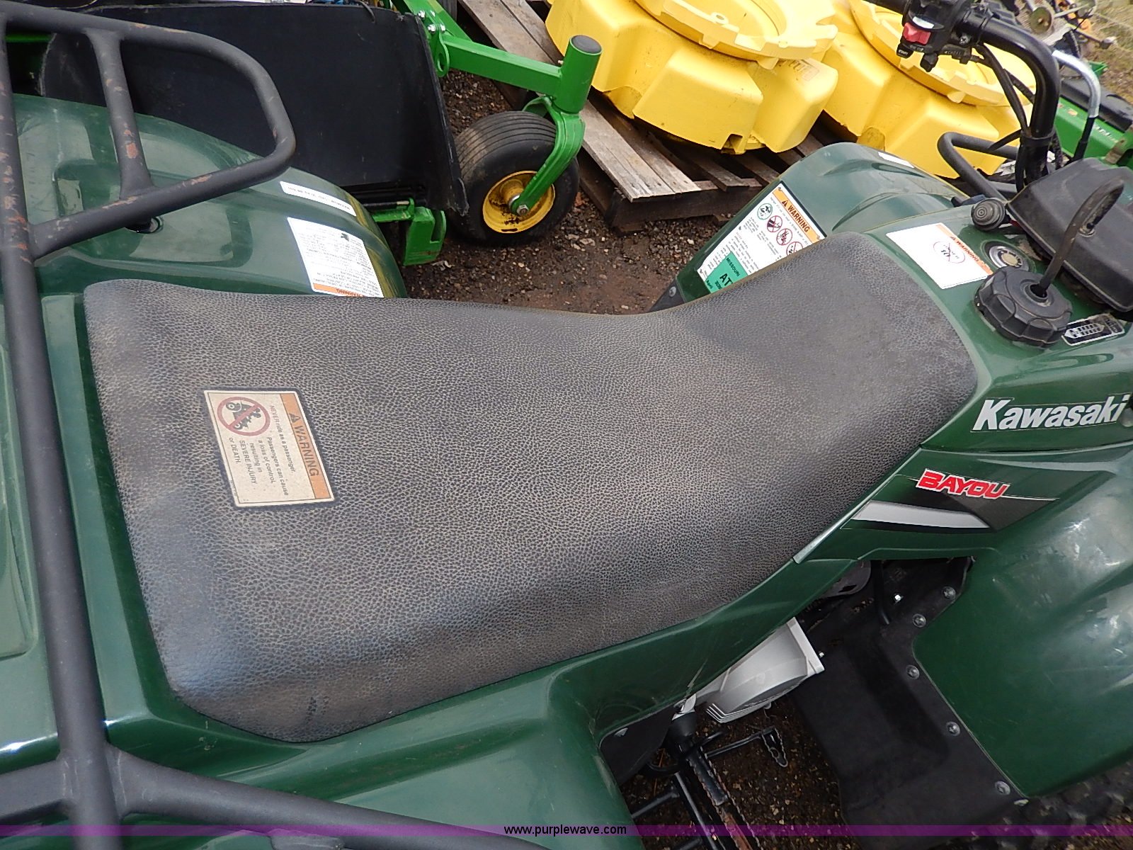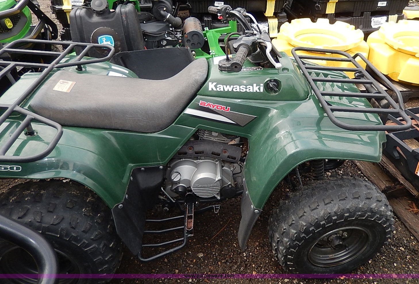Purple Wave is selling a used ATV in Missouri. This item is a 2007 Kawasaki Bayou 250 ATV with the following: Kawasaki gas engine, Five speed transmission, Electric start, Start button has been rewired, Rear hitch, 21x3-5 front tires, 22x10.00-10 rear tires, Weak battery