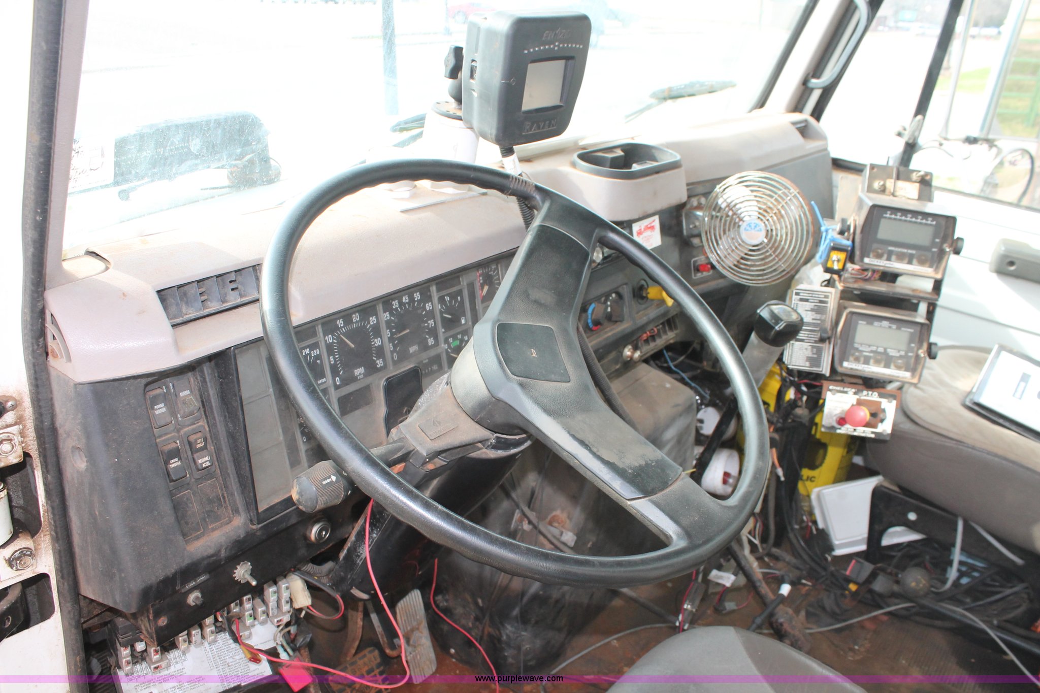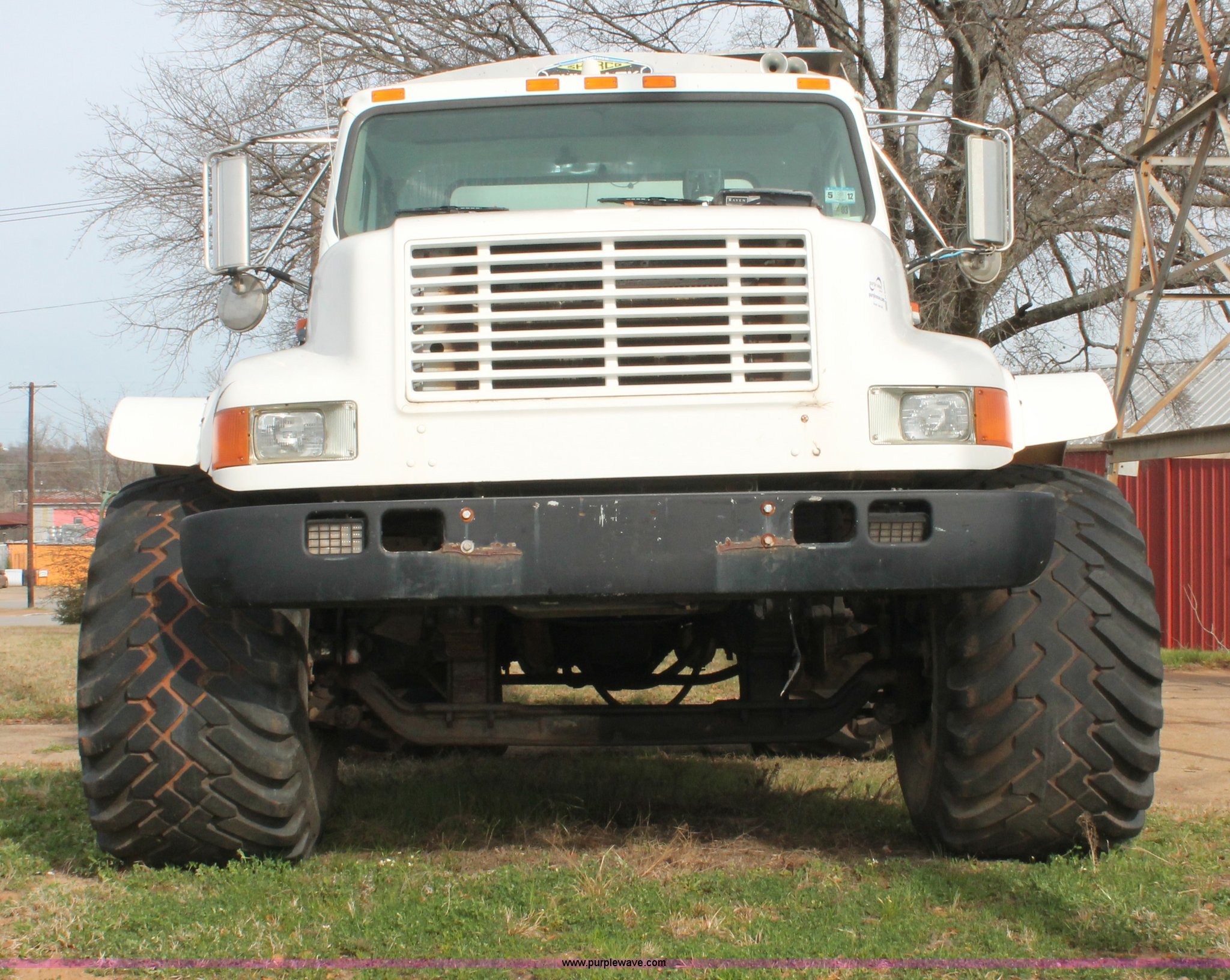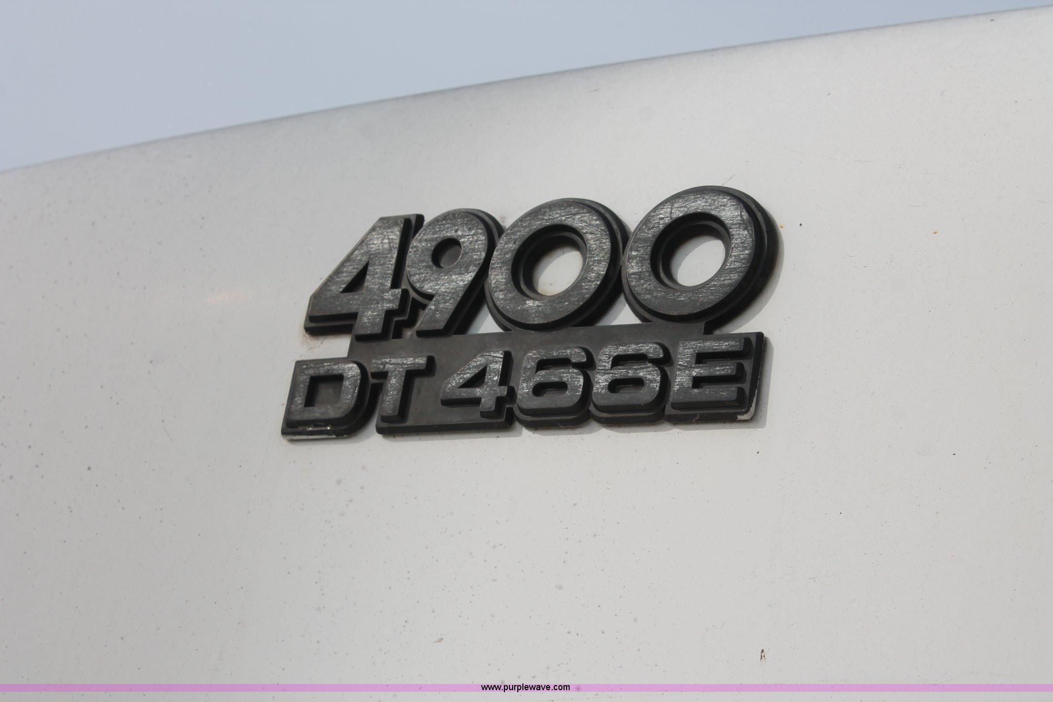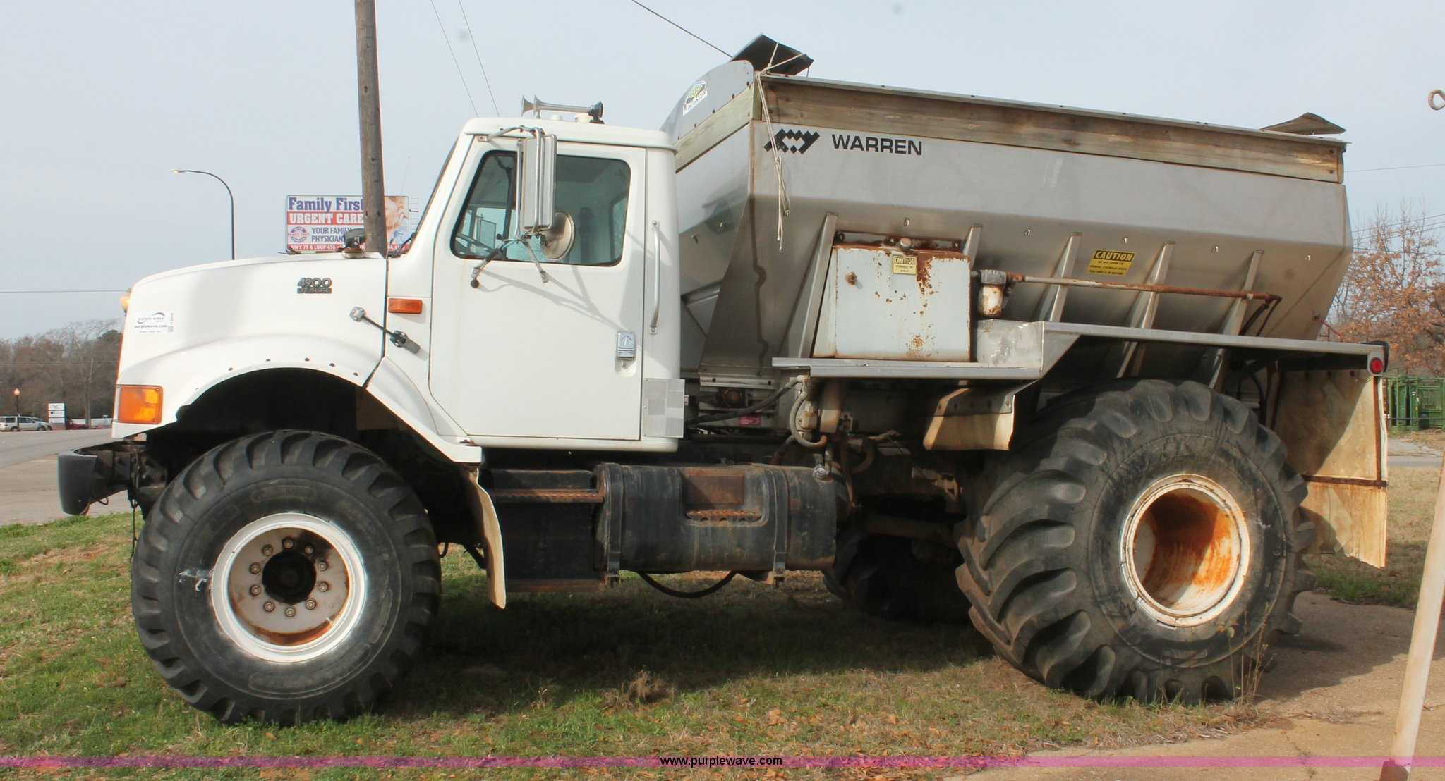 Purple Wave is selling a used Applicator Truck in Texas. This item is a 1996 International 4900 floater spreader truck with the following: 299,673 miles on odometer, International DT466HT 7.6L L6 diesel engine, 210 HP, Eaton Road Ranger six speed manual transmission, AC and heat, Cruise, Pioneer AM/FM/CD, Remote, Air suspension seat, Power windows, Block heater, Cold start, Dickie John application control system, Model DJCSS100, Monitor system, Model DJCMS100, Raven Envizio Plus guidance system, Manual included, Warren stainless steel box, 16"W linked belt, Chain drive, 24" dual spinner spreader, Shur-Lok rollover tarp, Wet kit, Foam applicator, Dual 50 gallon fuel tanks, PTO, Spring suspension, Air brakes, 160" wheelbase, Primex Terra Blaster 48x25.00-20 front tires, Primex Terra Turbo 66x43.00-25 rear tires, Rear tire low, will hold air
