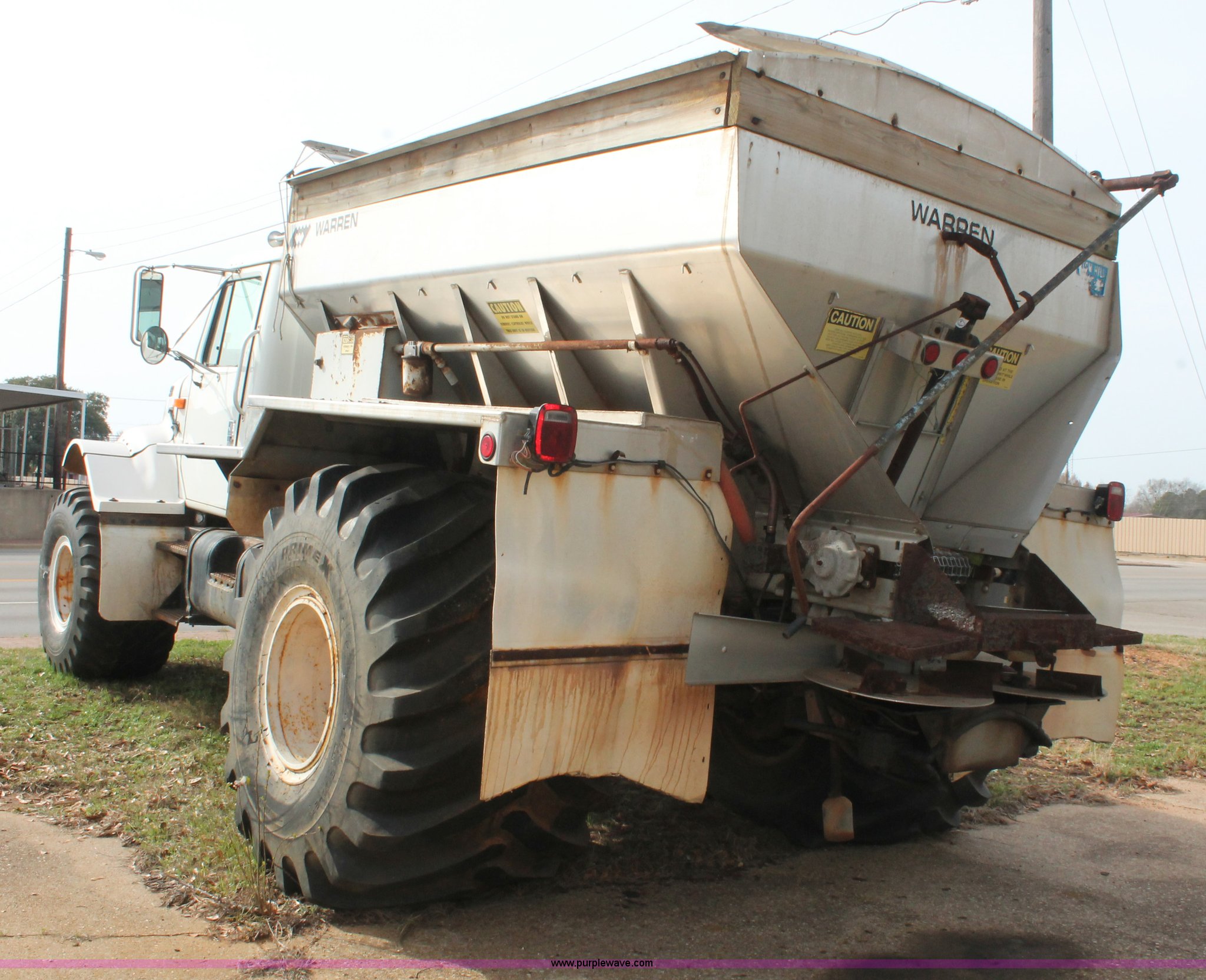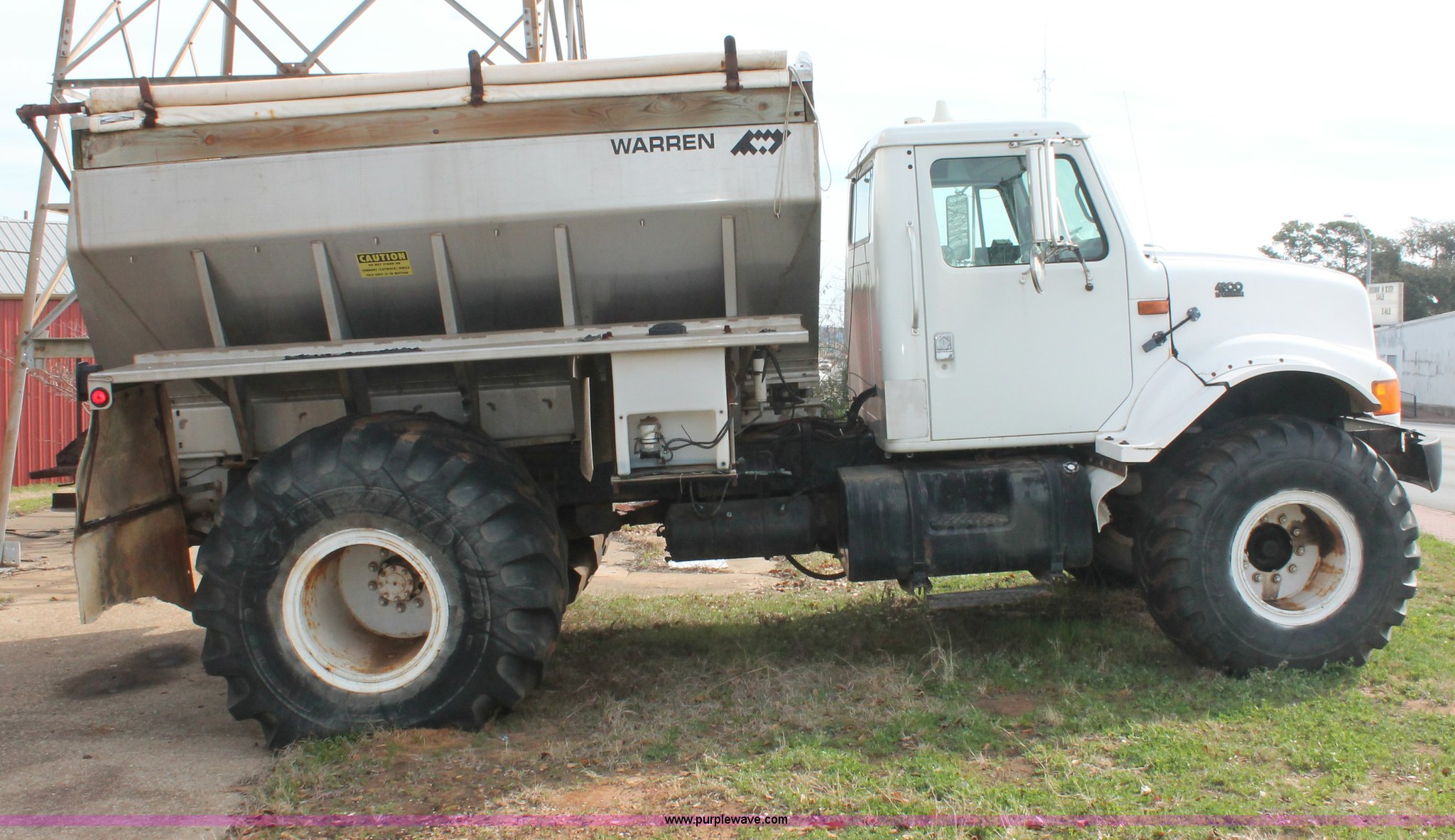 1996 International 4900 floater spreader truck. 299,673 miles on odometer, International DT466HT 7.6L L6 diesel engine 210 HP, Eaton Road Ranger six speed manual transmission, AC and heat, Cruise, Pioneer AM/FM/CD Remote, Air suspension seat, Power windows, Block heater, Cold start, Dickie John application control system Model DJCSS100, Monitor system Model DJCMS100, Raven Envizio Plus guidance system Manual included, Warren stainless steel box 16"W linked belt, Chain drive, 24" dual spinner spreader, Shur-Lok rollover tarp, Wet kit, Foam applicator, Dual 50 gallon fuel tanks, PTO, Spring suspension , Air brakes, 160" wheelbase, Primex Terra Blaster 48x25.00-20 front tires, Primex Terra Turbo 66x43.00-25 rear tires Rear tire low, will hold air. 1HTSDAAN1TH304993. Jacksonville, TX 75766