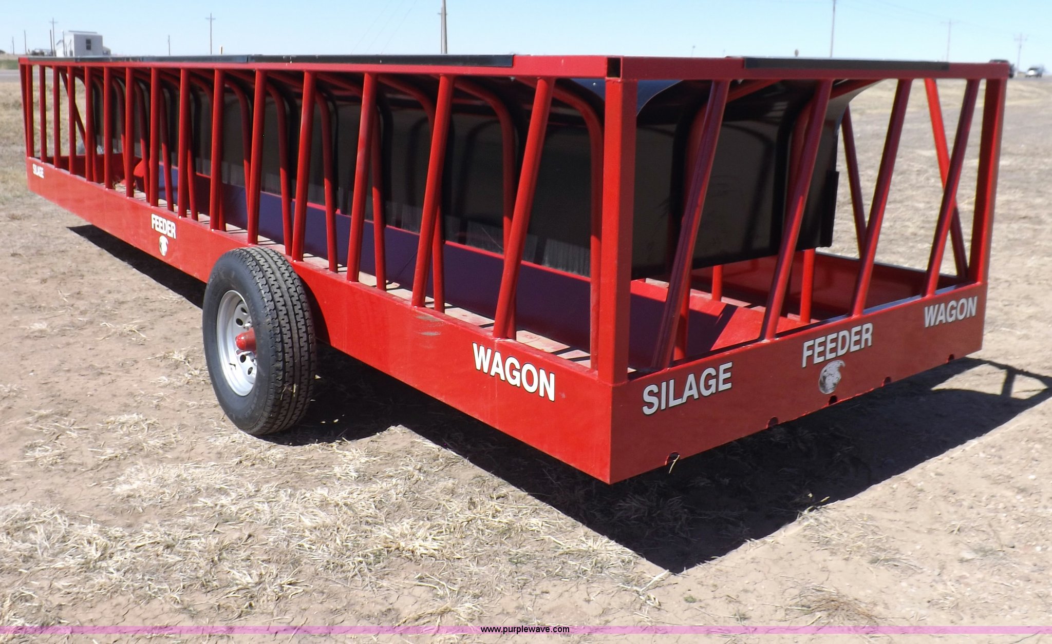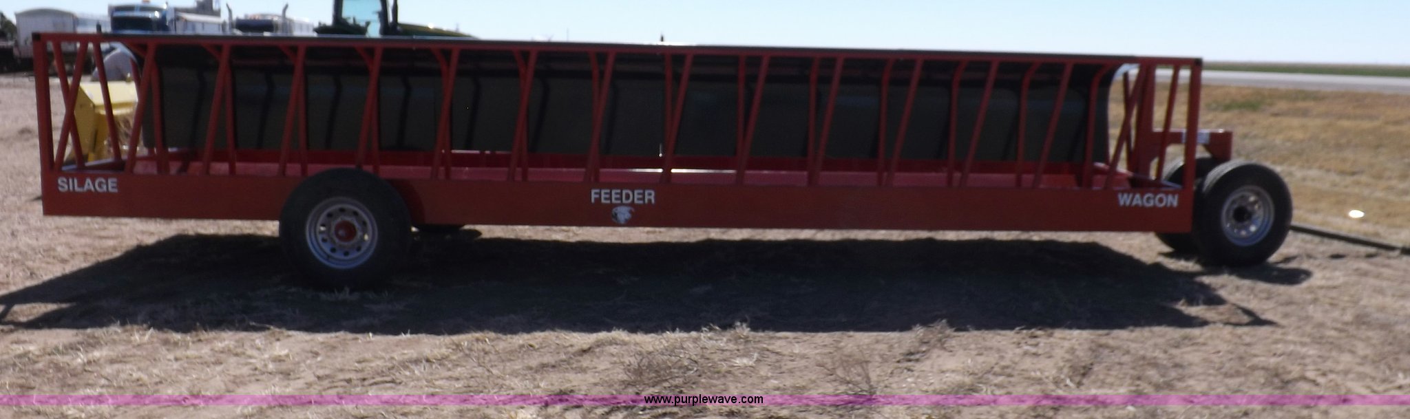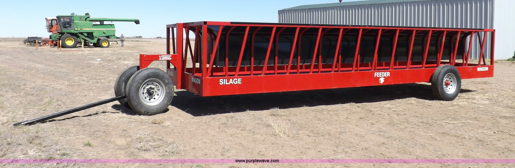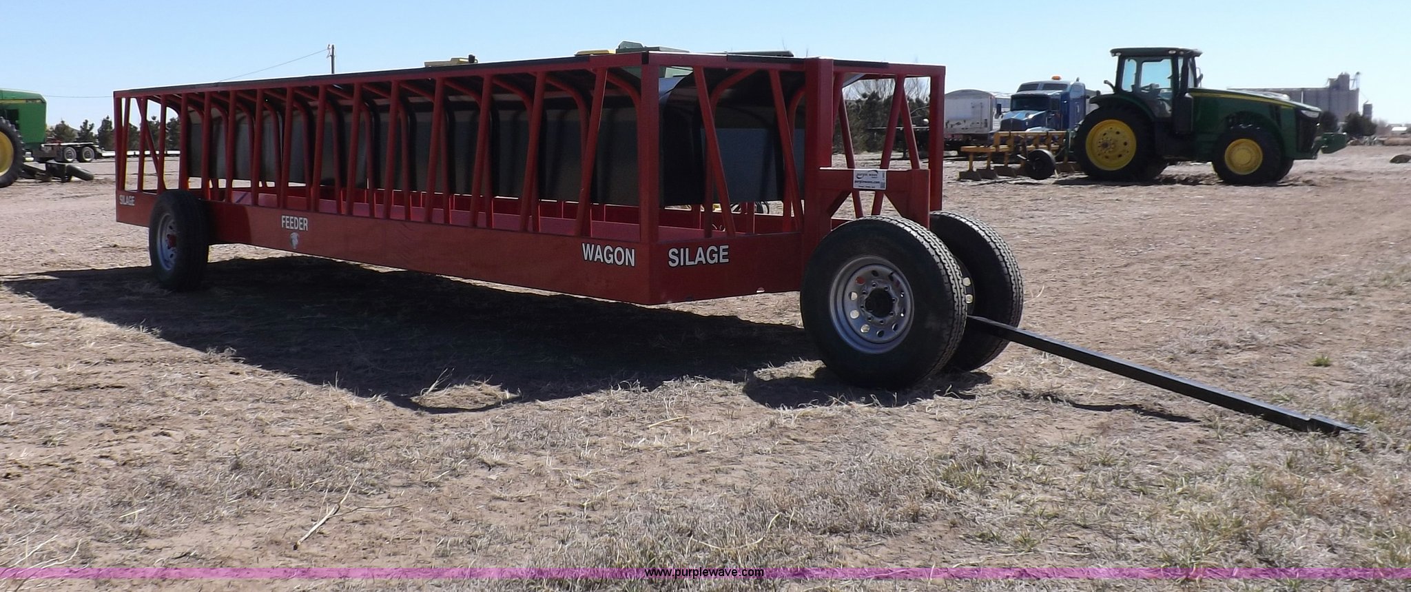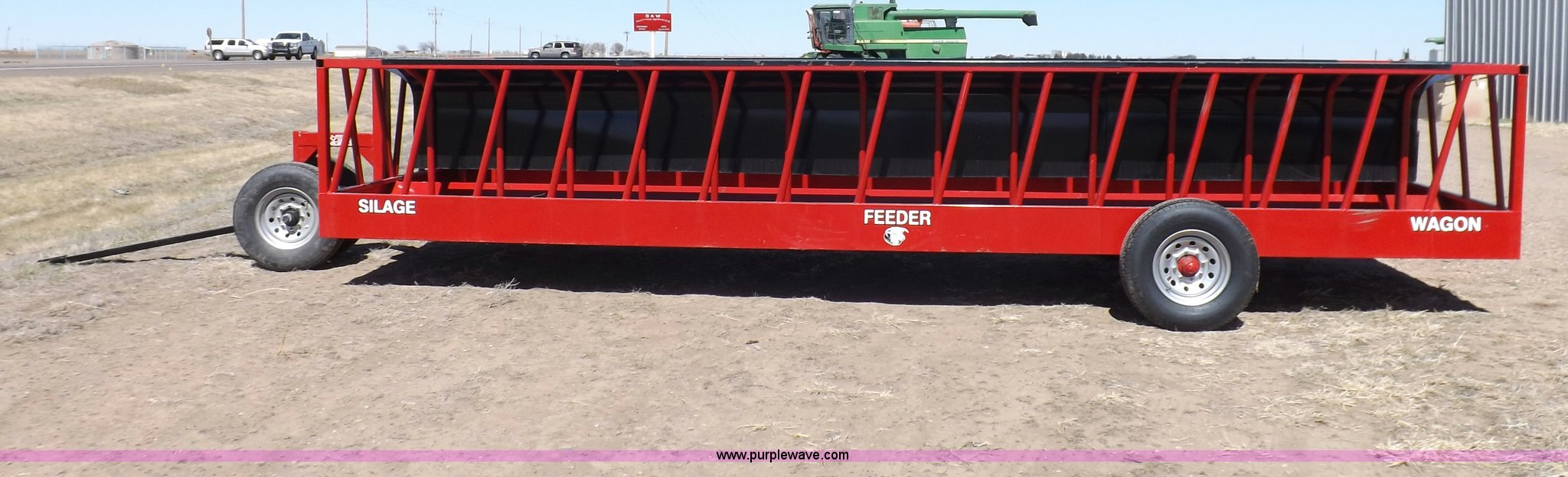 Purple Wave is selling a used Livestock Equip. in Kansas. This item is a Silage feeder wagon with the following: 24'L x 81"W x 5'H, 2.5" x 2.5" tubing and 1.5" pipe construction, 6'4" tongue, 3/4" hitch pin coupling, Gravity fed, Center diverter, 16" head stall spacing, Moisture drains, 235/80R16 tires