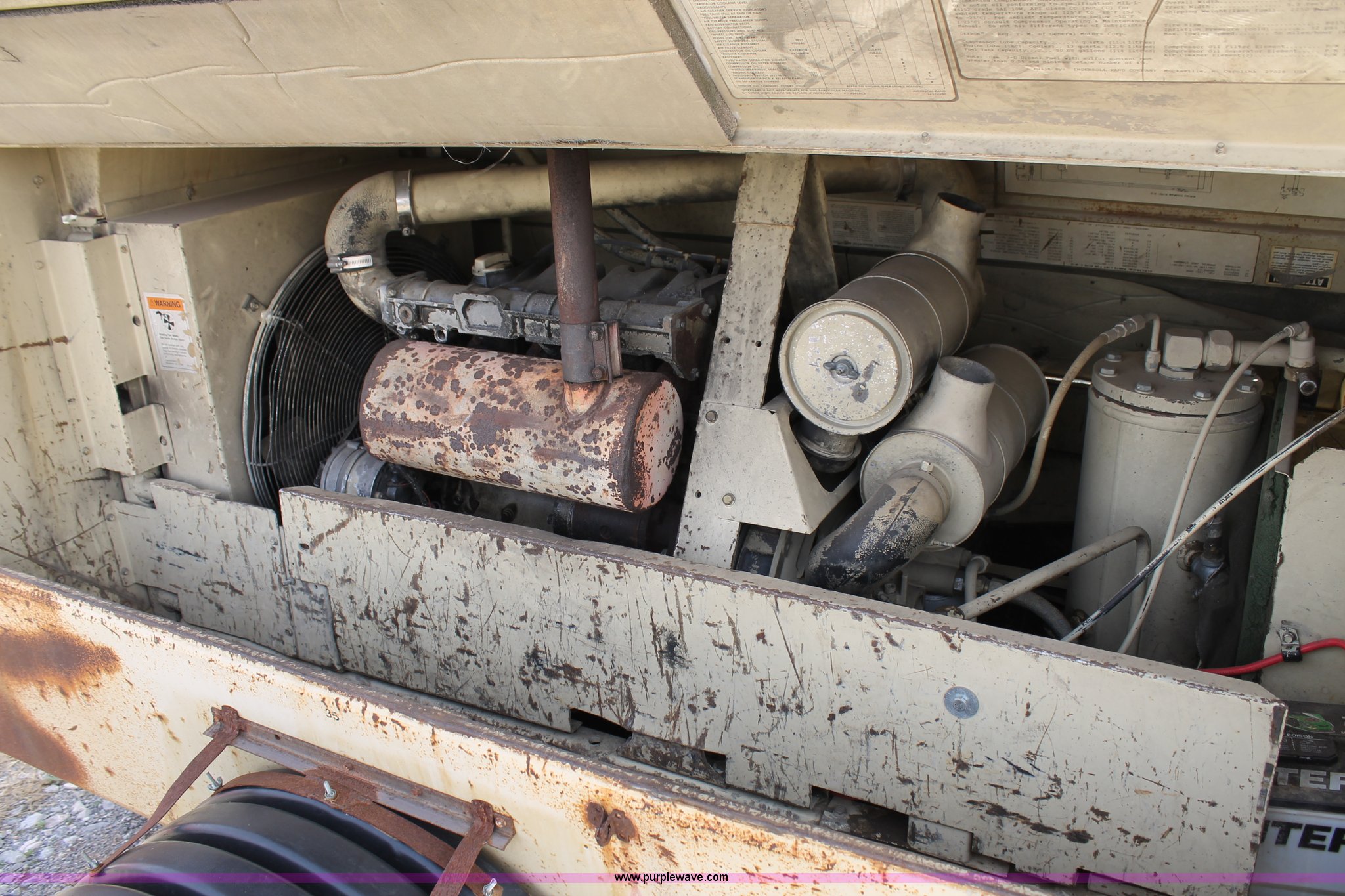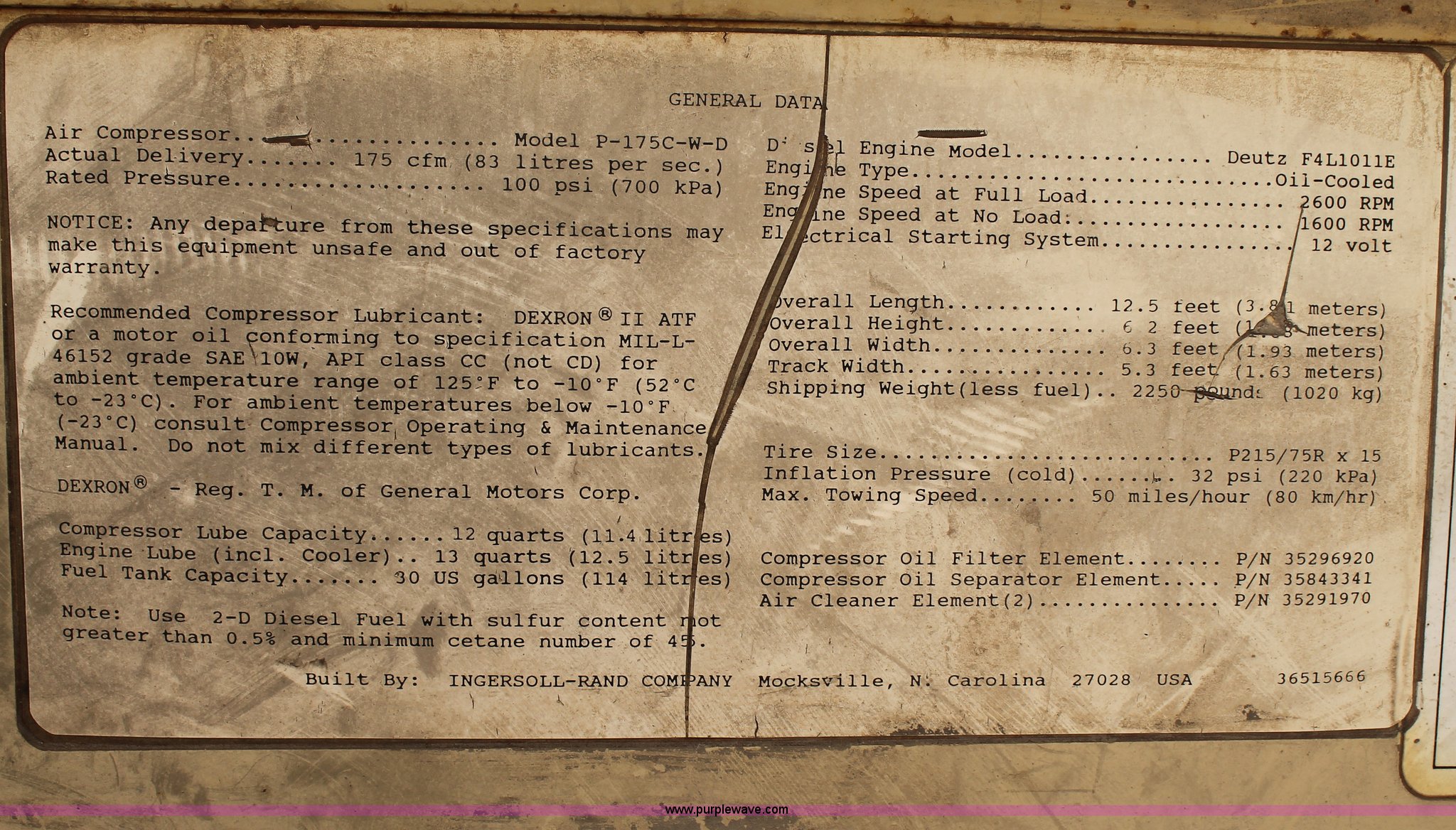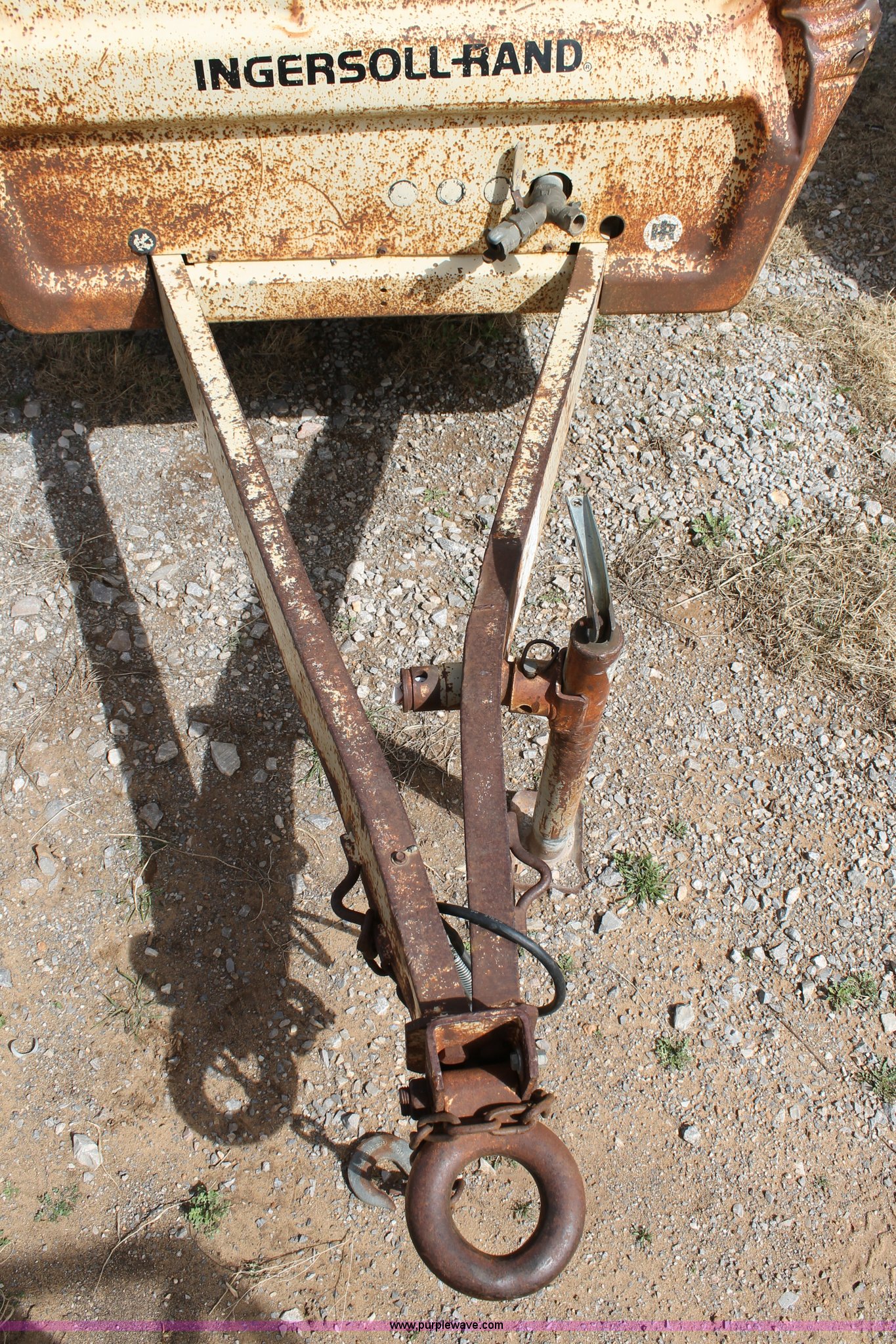 Purple Wave is selling a used Air Compressor in Oklahoma. This item is a Ingersoll Rand 175 air compressor with the following: 2,900 hours on meter, Deutz oil cooled four cylinder diesel engine, Dual outlets, Tongue mounted jack, Pintle hitch, 205/75R14 tires, Serial 189453U91324