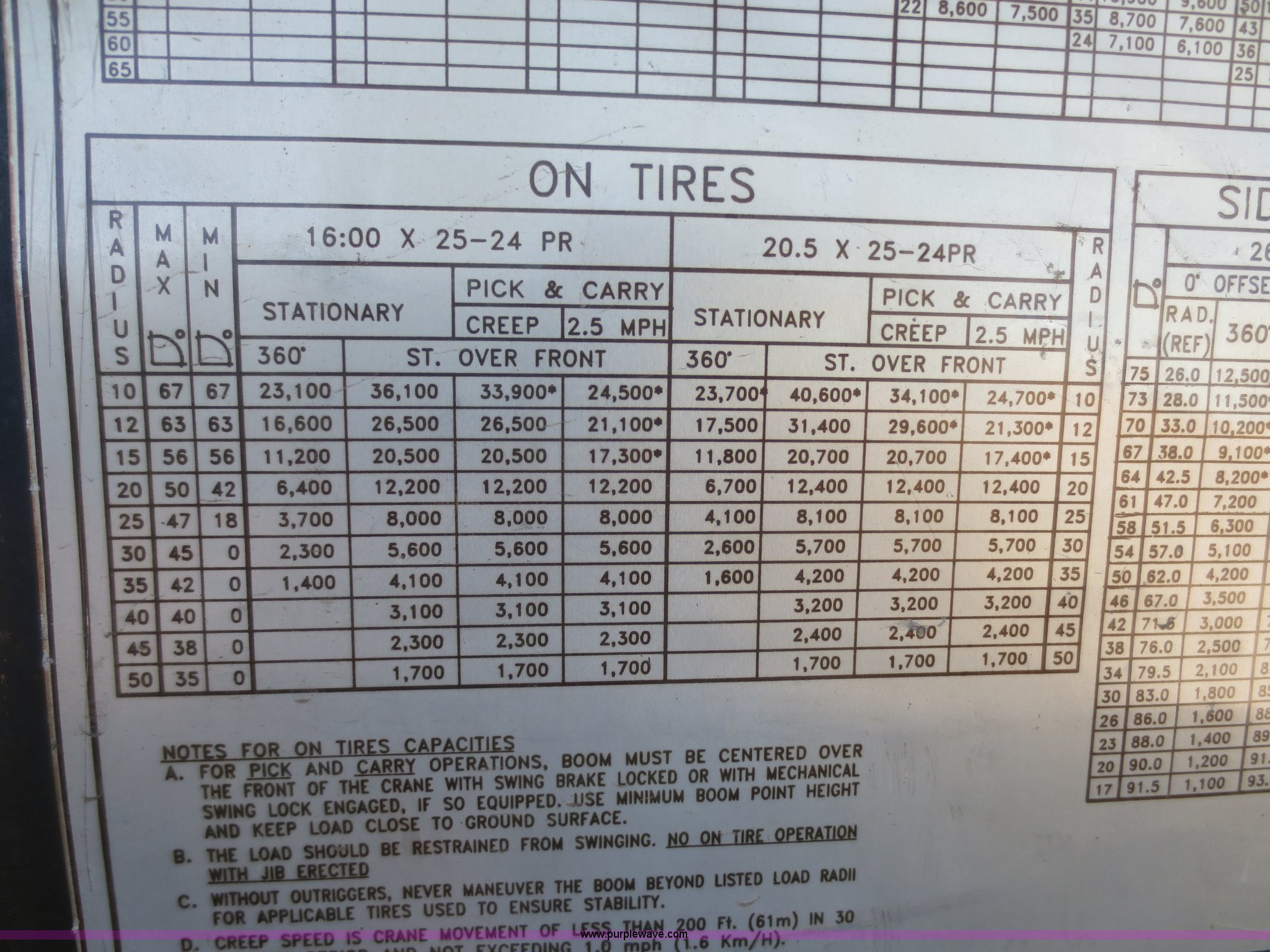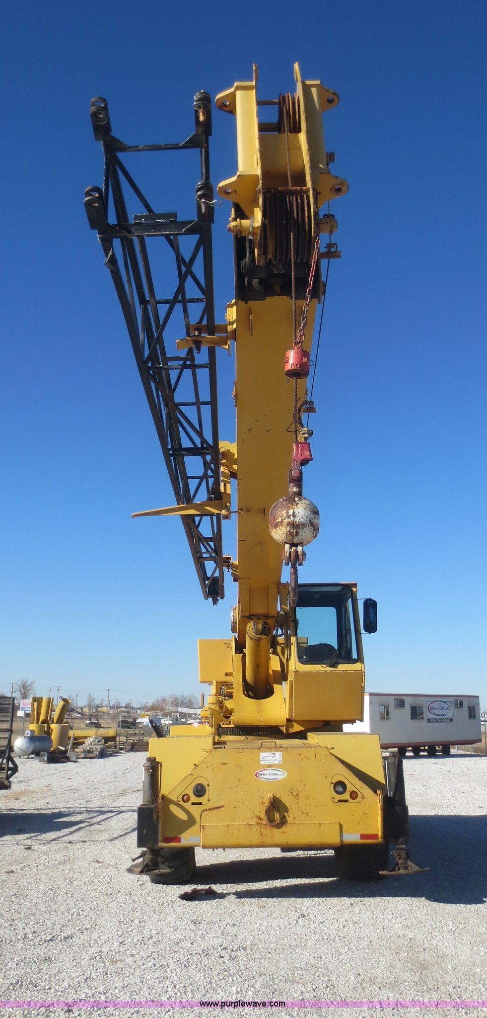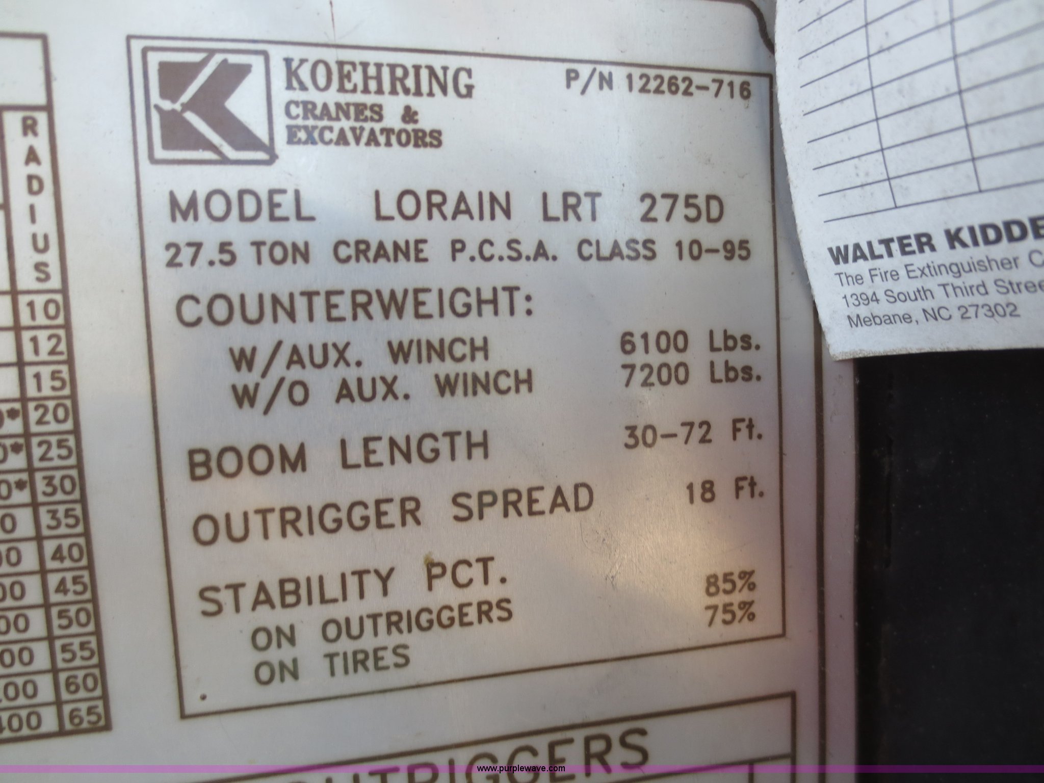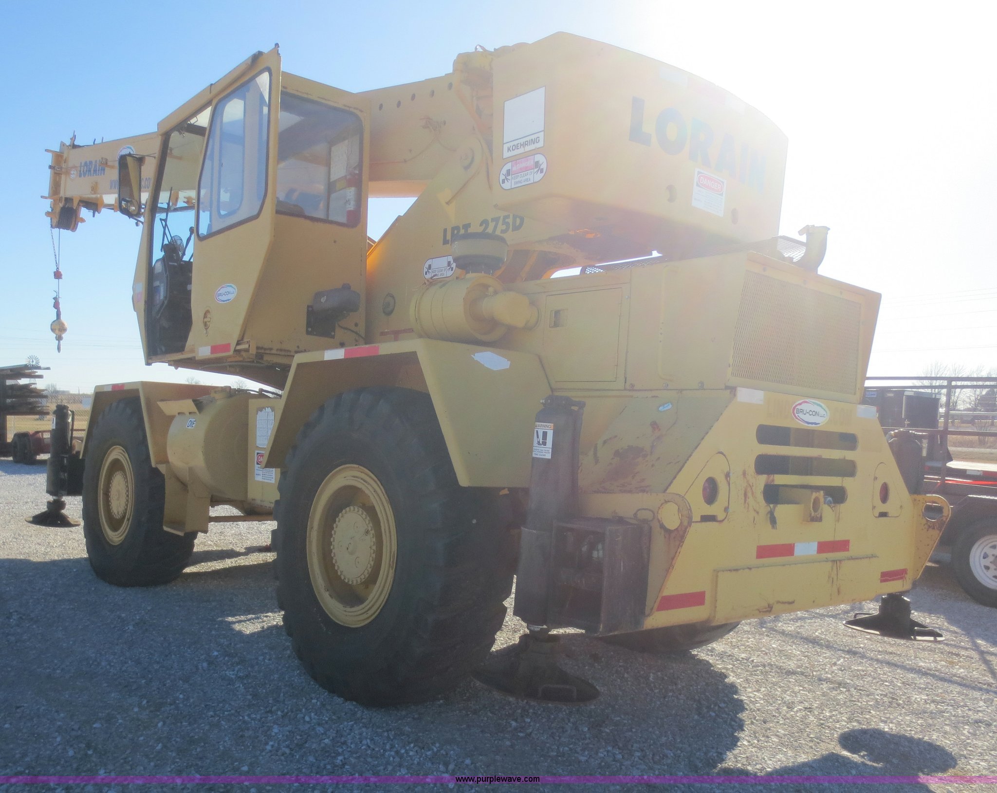 Purple Wave is selling a used Carry Deck Crane in Oklahoma. This item is a 1990 Lorain LRT275D crane with the following: 2,454 hours on meter, Cummins 5.9L turbo diesel engine, Four wheel drive, Two wheel, four wheel, and crab steer, 72' three section full power boom, 26' jib, 27.5 ton maximum capacity, Single winch, Anti-two block, Hook block, Serial 2941, 16.00-25 tires, 24 ply, Inspection completed September 21, 2011, Serial 79875