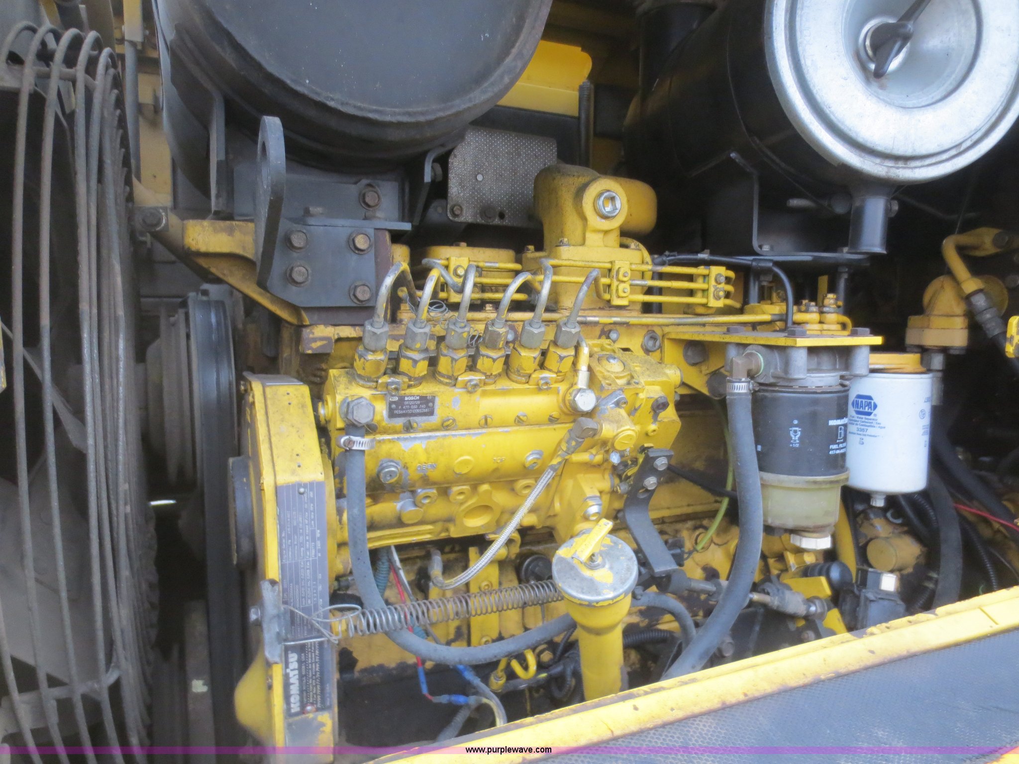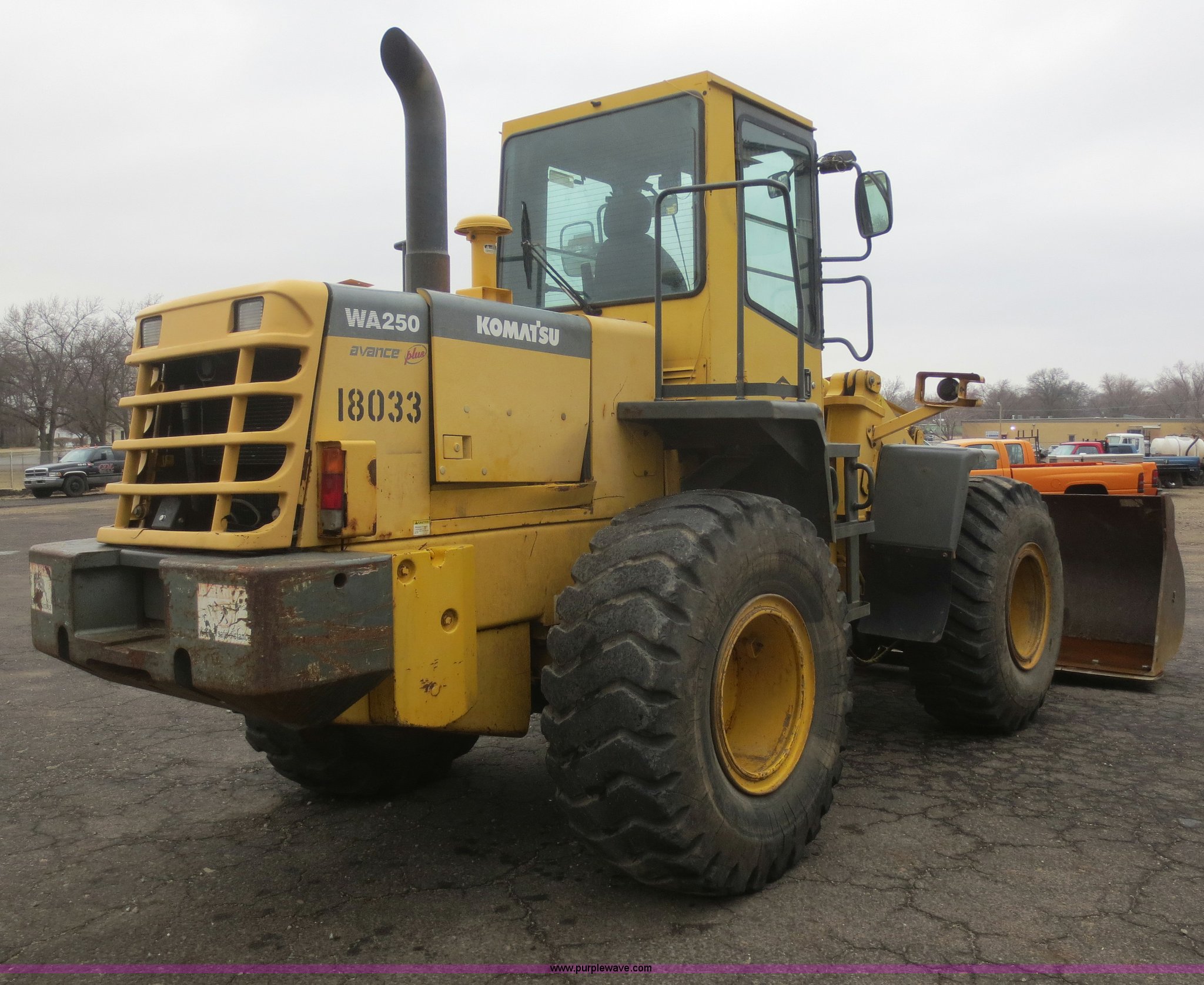 Purple Wave is selling a used Wheel Loader in Kansas. This item is a Komatsu WA250-3ML wheel loader with the following: 12,170 hours on meter, Cummins 5.9L L6 turbo diesel engine, Serial 459986057, Four speed transmission, Four wheel drive, EROPS, AC and heat, AM/FM/cassette, Manual engine shut off, 58"L forks, 105"W general purpose bucket, Bolt-on cutting edge, Front and rear work lights, JRB quick connect system, 20.5-25L-2 tires, Wiper motor has been removed, Serial A71078, Unit# E49