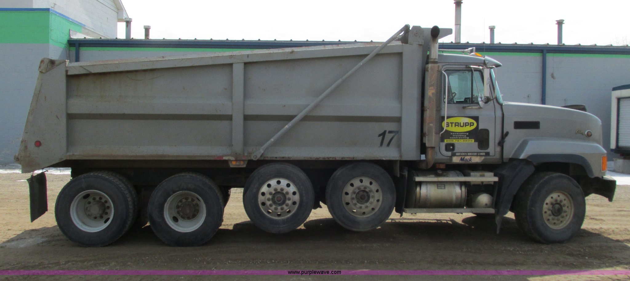 Purple Wave is selling a used Construction Dump Truck in Wisconsin. This item is a 2003 Mack CL713 Elite quad axle dump truck with the following: 526,623 miles on odometer, Mack E7 12.0L L6 diesel engine, Eaton Fuller eight speed manual transmission, AC and heat, Tilt, Cruise, AM/FM/CD, Air suspension seat, Heated mirrors, PTO, Exterior visor, Chrome bumper, Air operated end gate, Roll-over tarp, Single ram hoist, Pintle hitch, Air brakes, Jake brake, Aluminum front and tag axle wheels, 425/65R22.5 front tires, 11R22.5 tag axle and rear tires