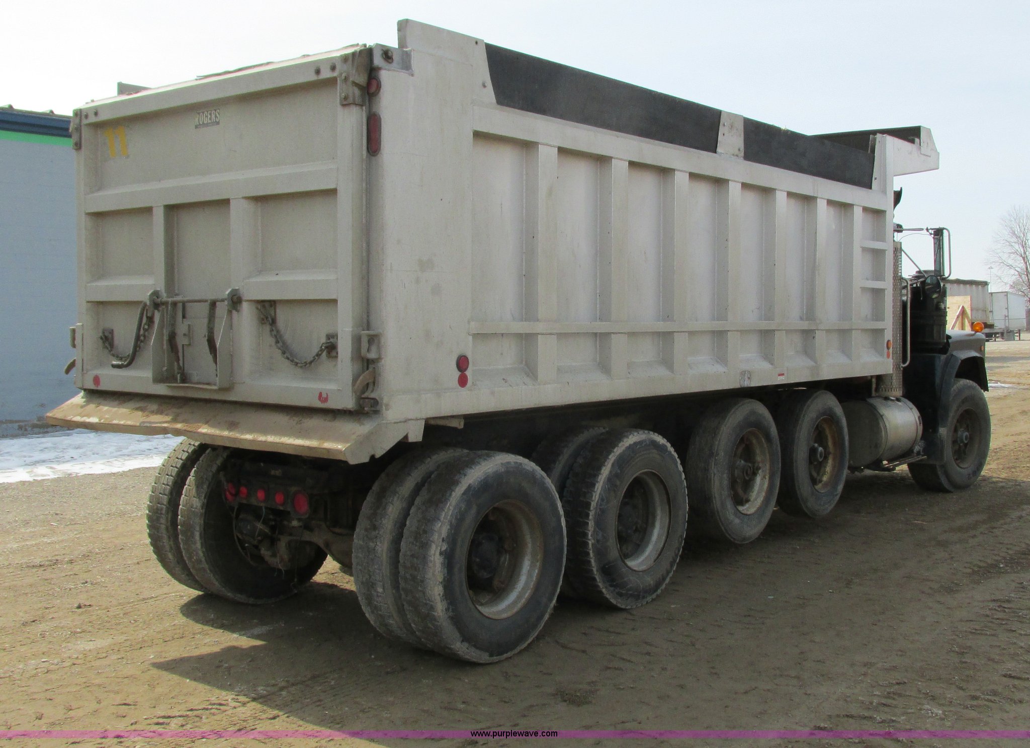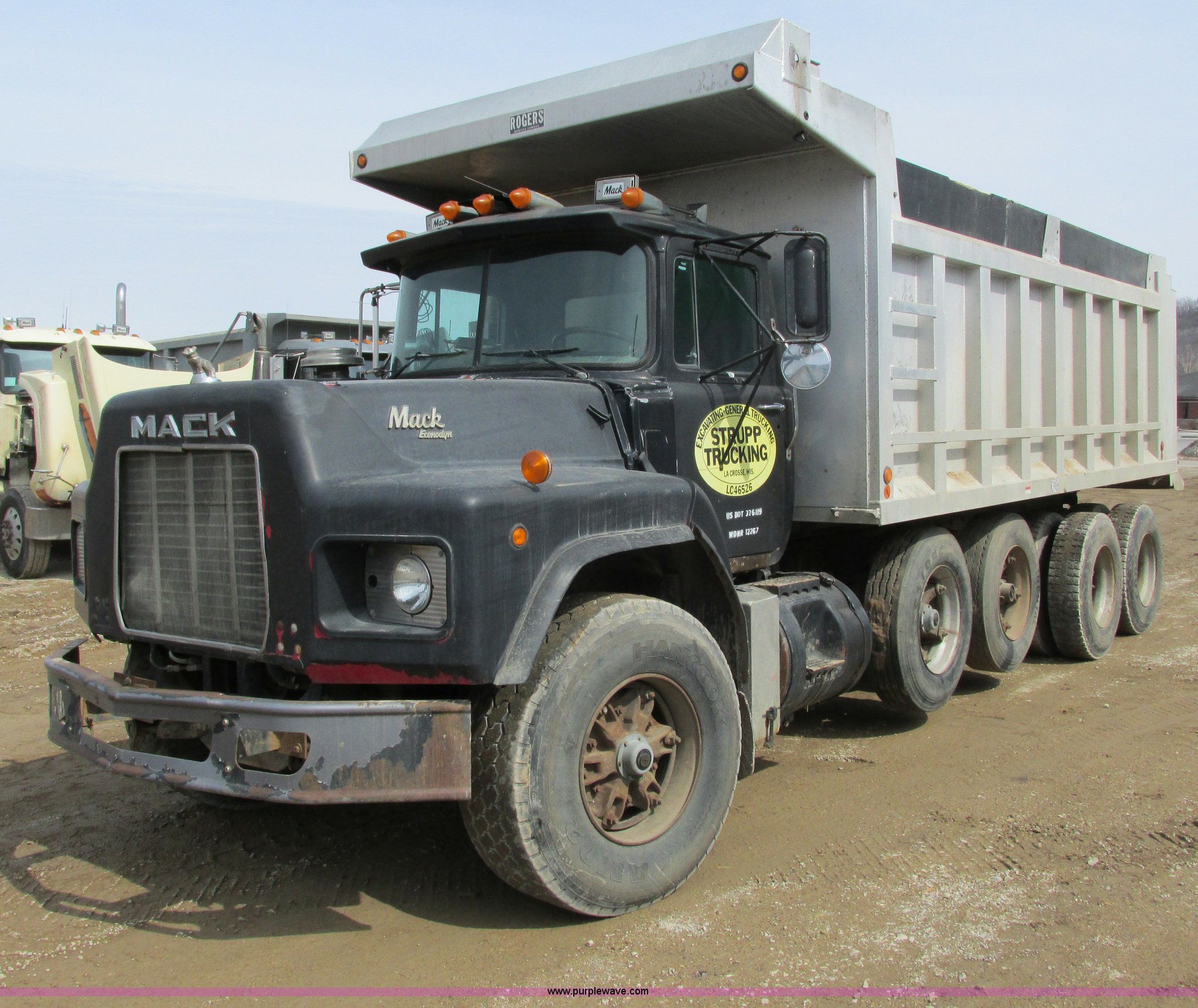 Purple Wave is selling a used Construction Dump Truck in Wisconsin. This item is a 1993 Mack RB688S quad axle dump truck with the following: 273,724 miles on odometer, Mack E7 12.0L L6 diesel engine, Eaton Fuller eight speed manual transmission, AC and heat, AM/FM, Air suspension seat, CB radio, Cab fan, 19'L x 8'W dump bed, Air operated end gate, Single ram hoist, Exterior visor, Dual fuel tanks, PTO, Spring suspension, Air brakes, Jake brake, 425/65R22.5 front tires, 275/80R22.5 tag axle tires, 11R22.5 rear tires