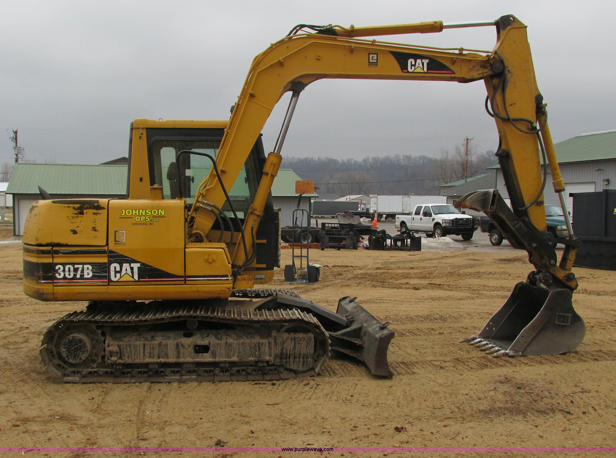 1999 Caterpillar 307B excavator. 2,947 actual hours, Mitsubishi four cylinder diesel engine, AC and heat AC needs charged, AM/FM, Spring suspension seat, Work lights, 89" stick, 33"W bucket Six replaceable teeth, Caterpillar hydraulic thumb Full rotation, 94.5"W back fill blade, Ripper tooth, Manual quick attach, 17.5" triple grouser track pads, Shop built track ice picks, Doors do not latch, Serial 5CW00283. View equipment video. Johnson Operating Services. 722 Western Avenue. Holmen, WI 54636
