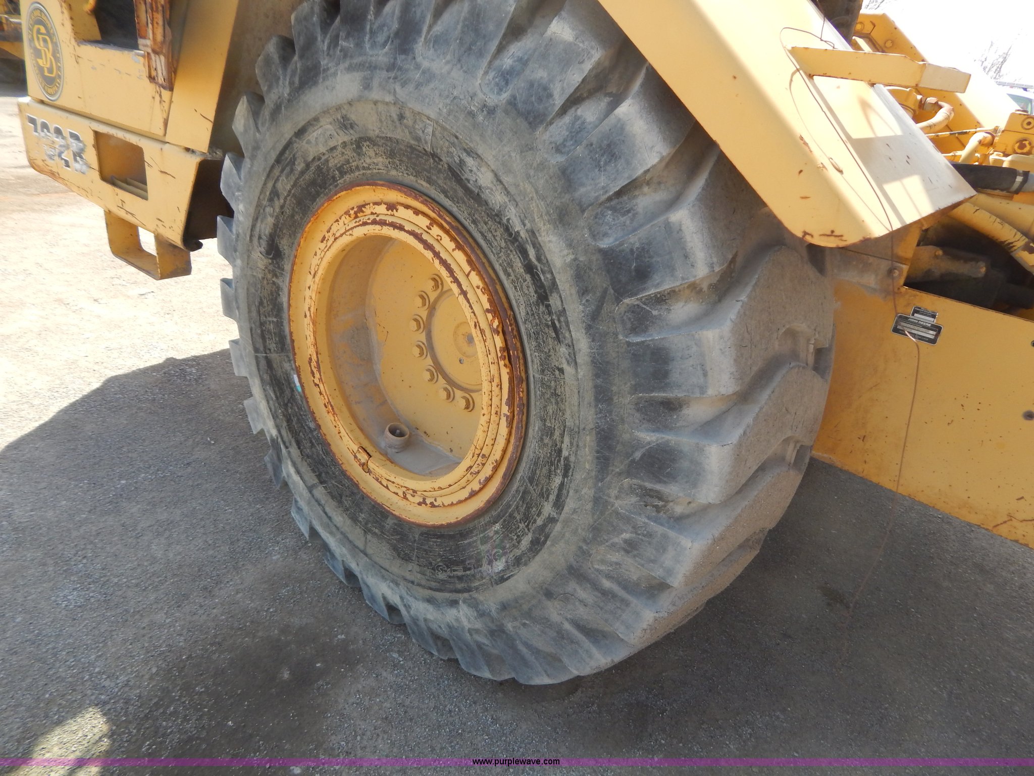 1993 John Deere 762B paddle scraper. 6,448 hours on meter, John Deere six cylinder turbo diesel engine Serial RG646GA354768, Manual transmission 6F-1R gears, Locking differential, Enclosed cab, Work lights, 23.5-25 tires, Windshield cracked, Left bowl lift cylinder leaks, Battery dead, Serial T0762BX765325, Unit# 7004. Superior Bowen Asphalt Company. 2501 Manchester Trafficway. Kansas City, MO 64129