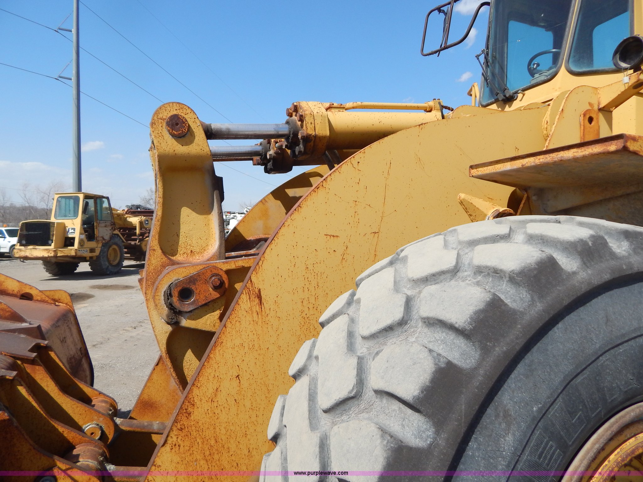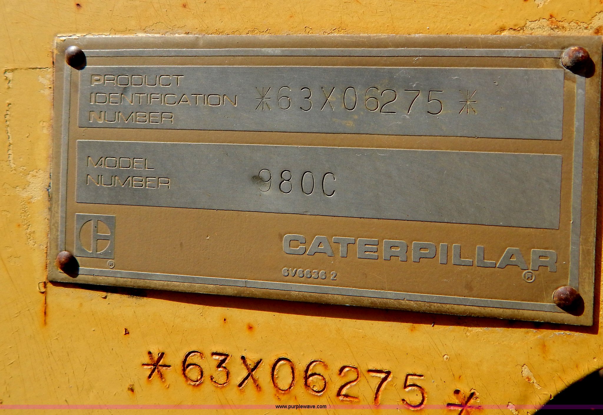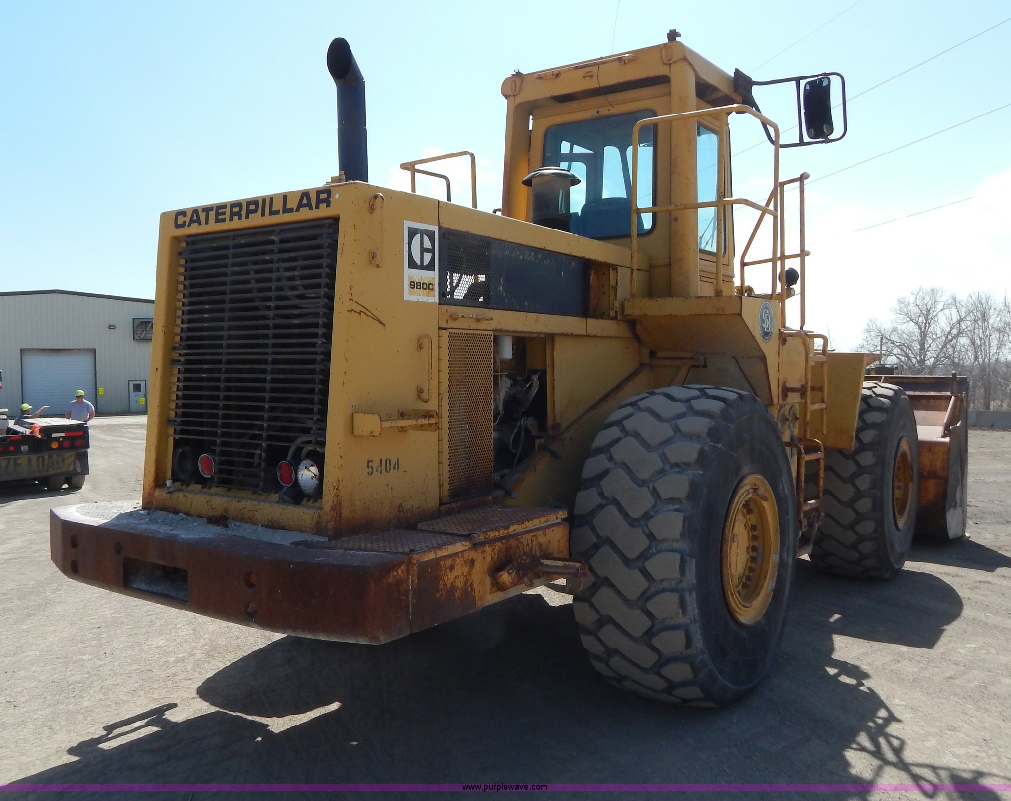 Purple Wave is selling a used Wheel Loader in Missouri. This item is a 1985 Caterpillar 980C wheel loader with the following: 25,324 hours on meter, Caterpillar six cylinder diesel engine, Four speed shuttleshift transmission, Enclosed cab, Heat, Tilt, Two stick loader control, 130"W loader bucket, Smooth bolt-on cutting edge, Hole in bottom of bucket, Work lights, Rear counter weight, 26.5-R25 tires, 60,755 lbs. base operating weight, Lower glass on left hand door missing, Windshield cracked, Serial 63X06275, Unit# 5404