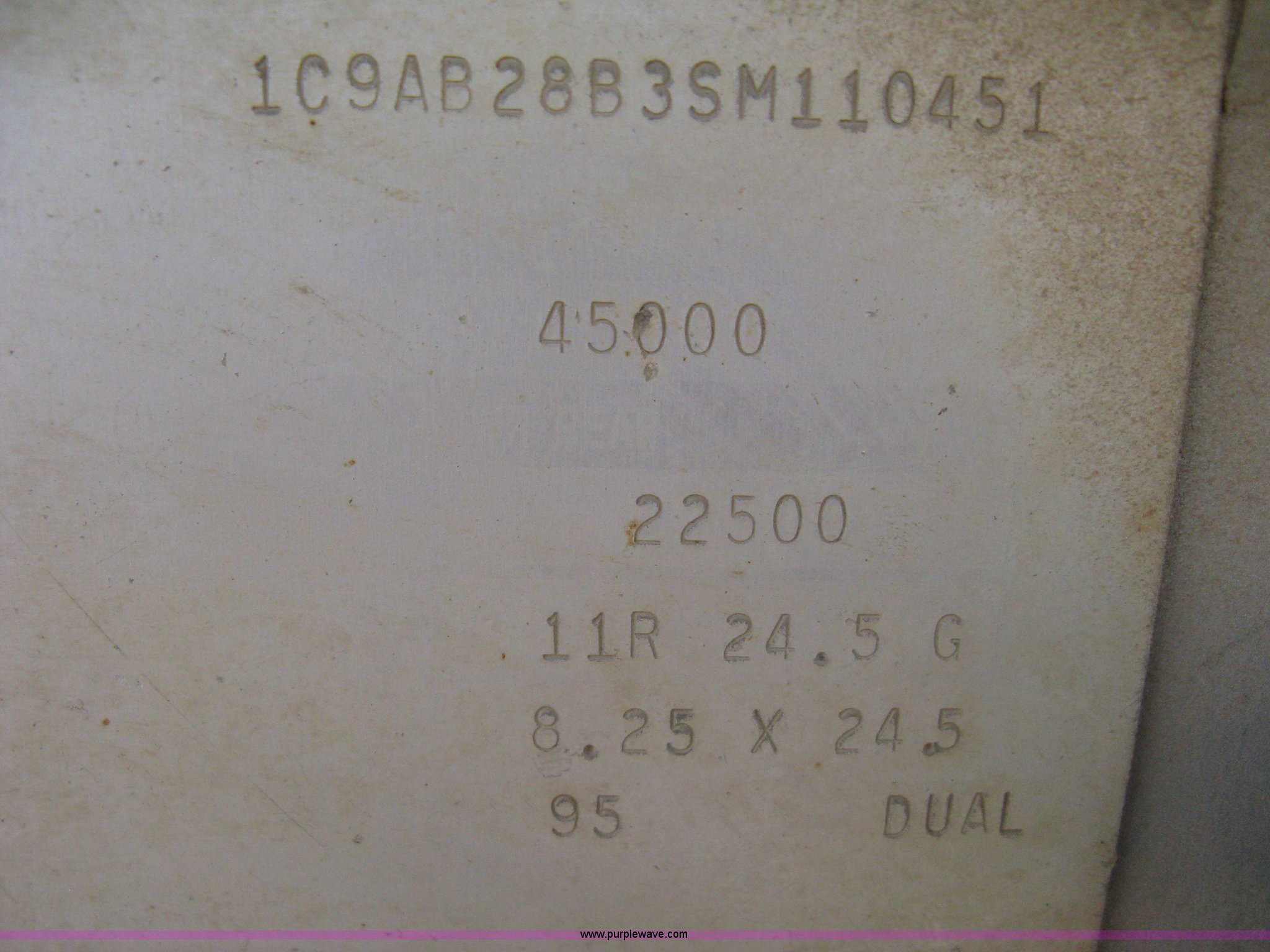 1995 Clement barrel dump trailer. 28.5'L x 8'W, Single ram hoist, Hydraulic end gate, Full fenders, Roll-over tarp, Two post landing gear, Air suspension, Air brakes, Aluminum wheels, 11R22.5 tires, GVWR 45,000 lbs, GAWR 22,500 lbs, Annual inspection completed May 2013, Unit# ST03. Title distribution may be delayed up to 30 days from verification of funds. 1C9AB28B3SM110451. Nowak Construction. 200 S. Goddard Road. Goddard, KS 67052