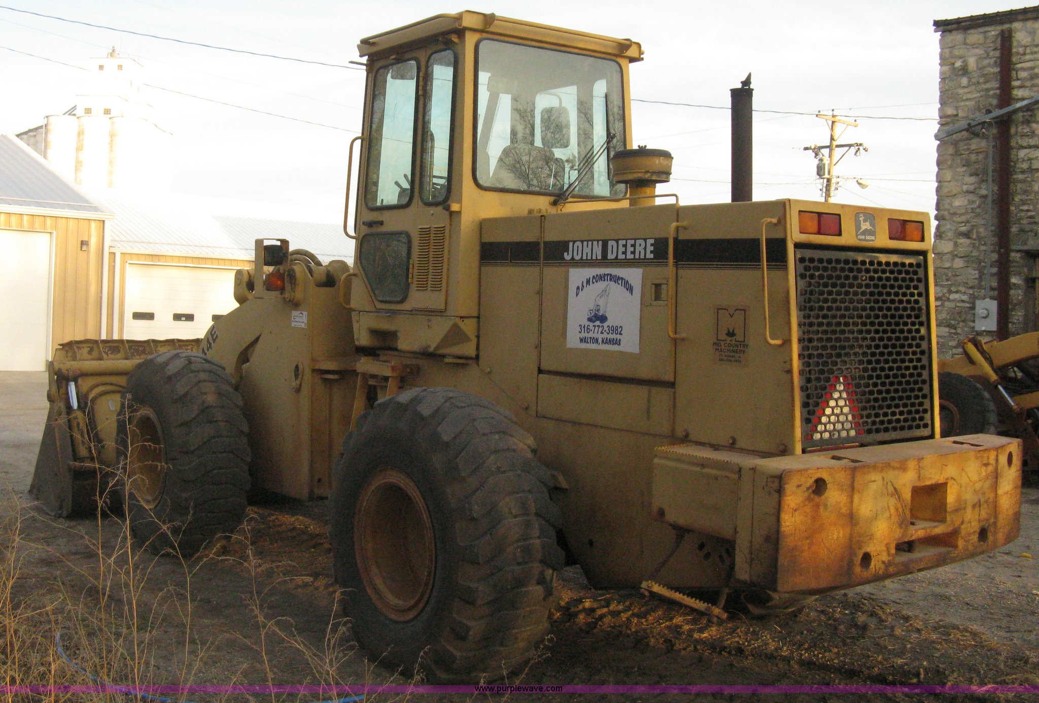 Purple Wave is selling a used Wheel Loader in Kansas. This item is a 1993 John Deere 644E loader with the following: 11,976 hours on meter, John Deere 6076TDW01 six cylinder diesel engine, Serial RG6076T170691, Four speed shuttleshift transmission, Enclosed cab, AC and heat, Joystick loader controls, JRB four in one combination bucket, 9'W, 3.25 cubic yard capacity, Bolt-on cutting edge, No cutting edge installed, Serial 0891-0473A, Rear bolt-on counter weights, 20.5-25 tires, Cab glass cracked, Recently replaced batteries, Starter replaced October 2013, Serial DW644ED535161