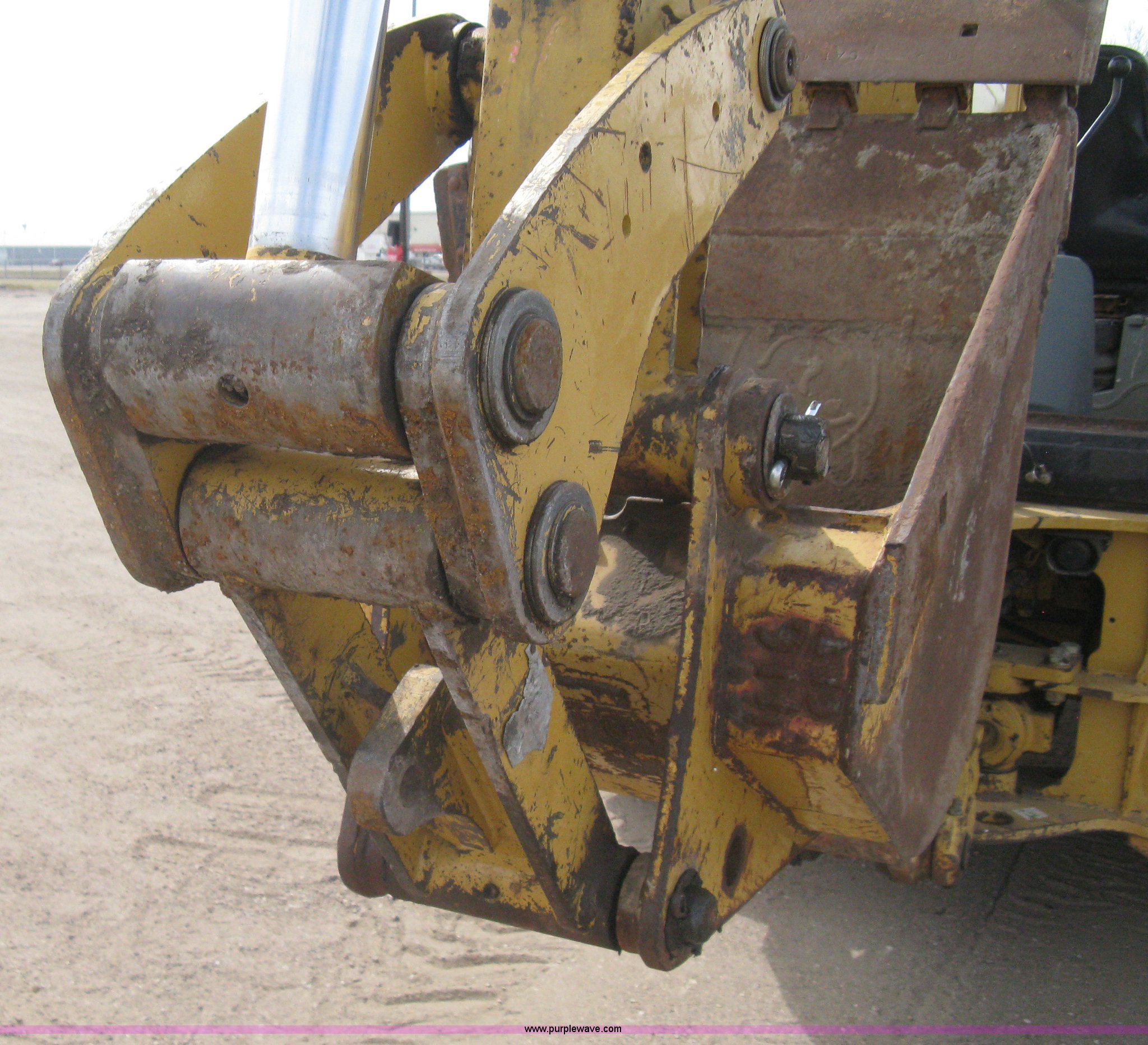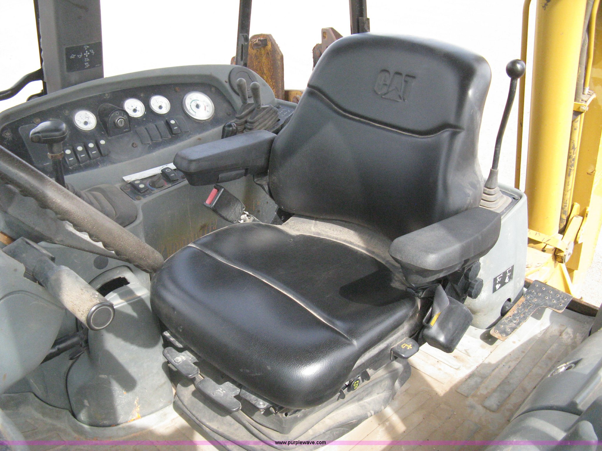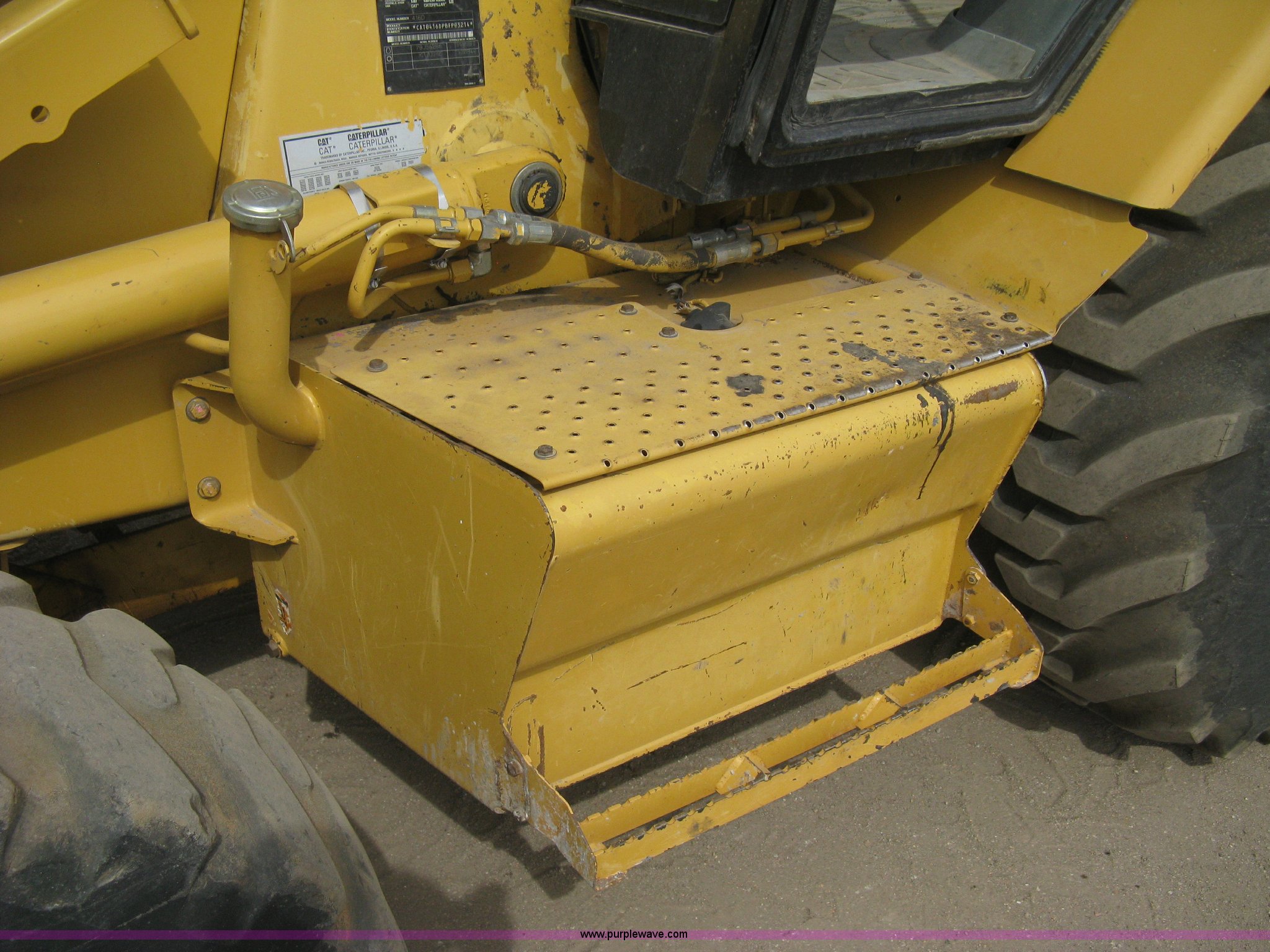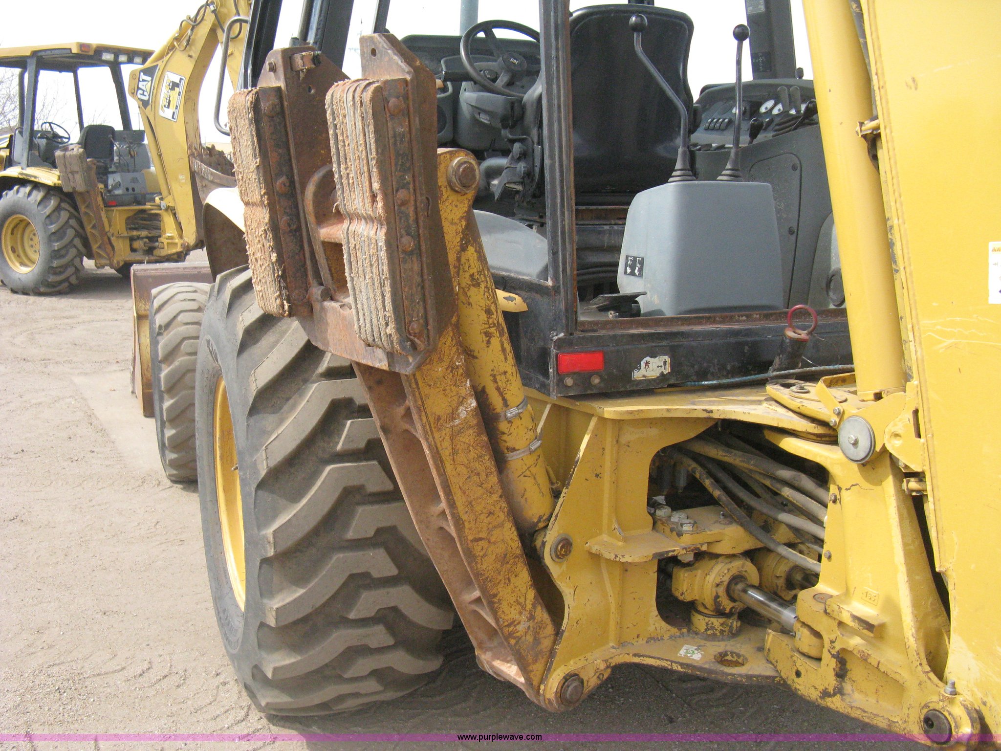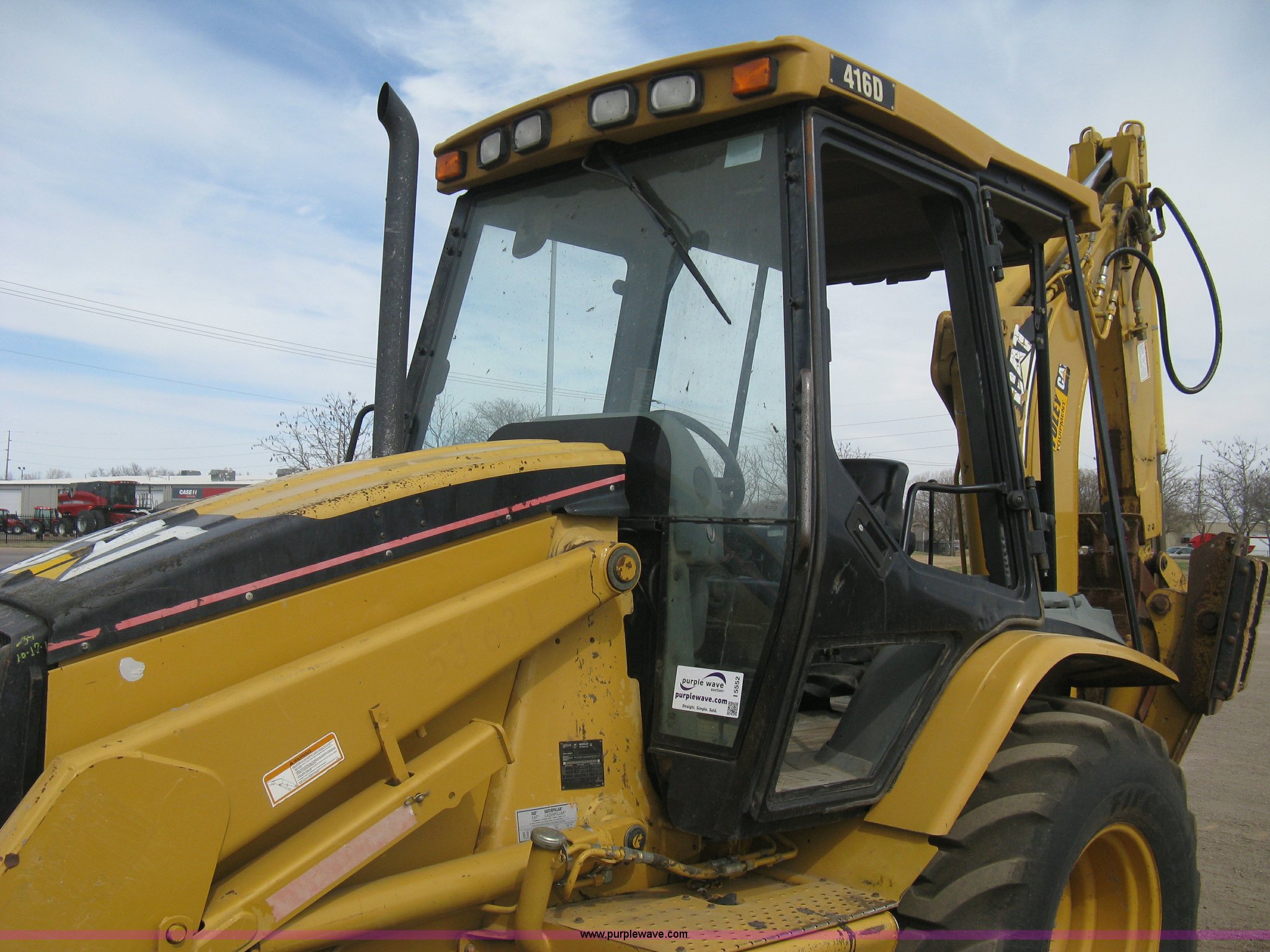 Purple Wave is selling a used Tractor Loader Backhoe in Kansas. This item is a 2002 Caterpillar 416D backhoe with the following: 7,222 hours on meter, Caterpillar diesel engine, Serial 7BJ56286, Four speed shuttle shift transmission, Four wheel drive, Enclosed cab, Heat, Tilt, Suspension seat, Weatherband radio, Joystick loader control, Outriggers, Street pads, Auxiliary hydraulics, Extend-a-hoe, 24"W pin-on backhoe bucket, (5) rock teeth, Welded flat ditch plate, 88"W loader bucket, Bolt-on cutting edge, Drain holes in bucket, Weld repairs, Hard serviced, Work lights, Front counter weights, Firestone 12.5/80-18 front tires, One recently replaced, Recently replaced Firestone 19.5L-24 rear tires, Service records available, One owner, Side and rear glass missing, Serial CAT0416DPBFP03214, Unit# 5363L