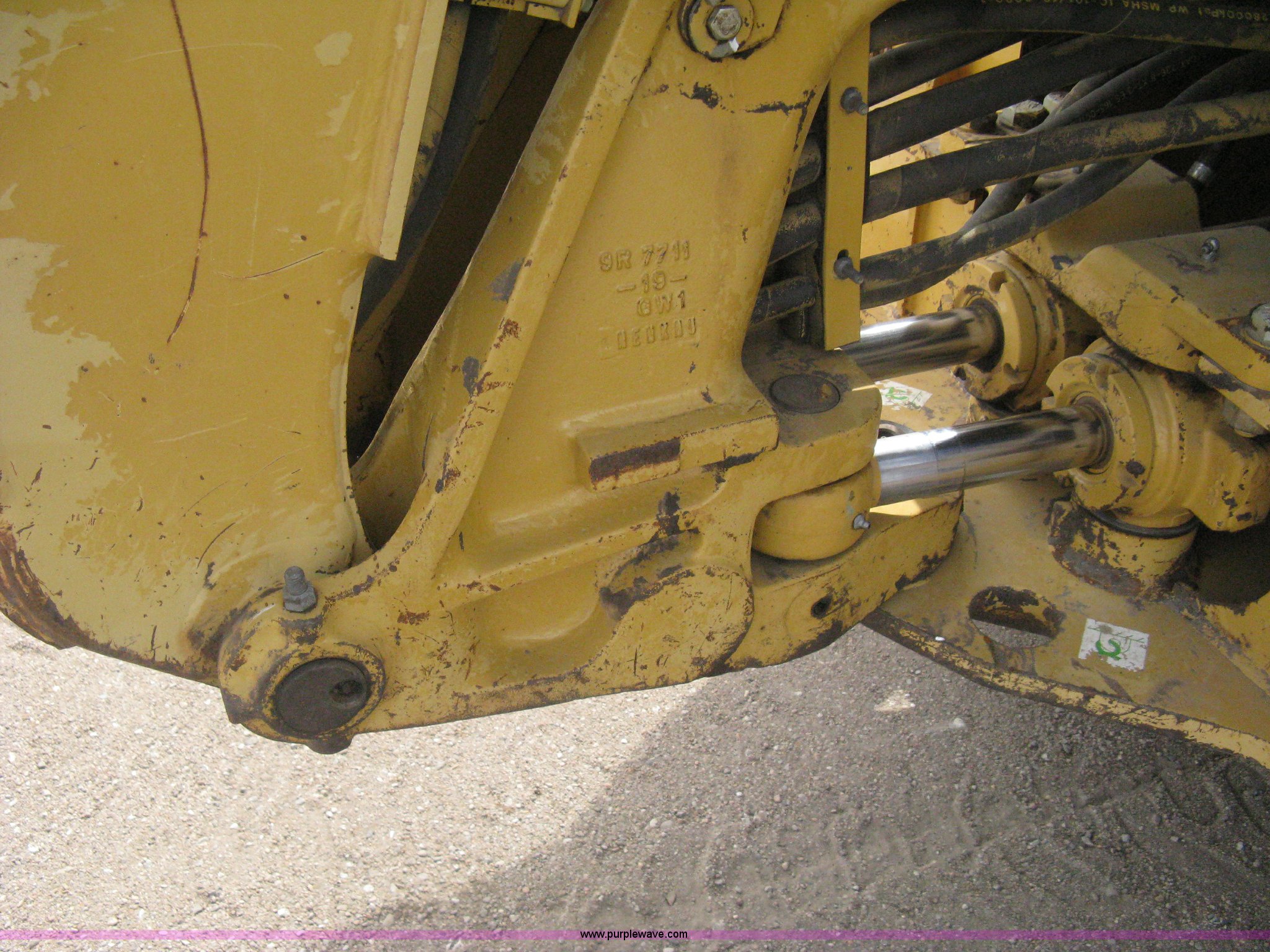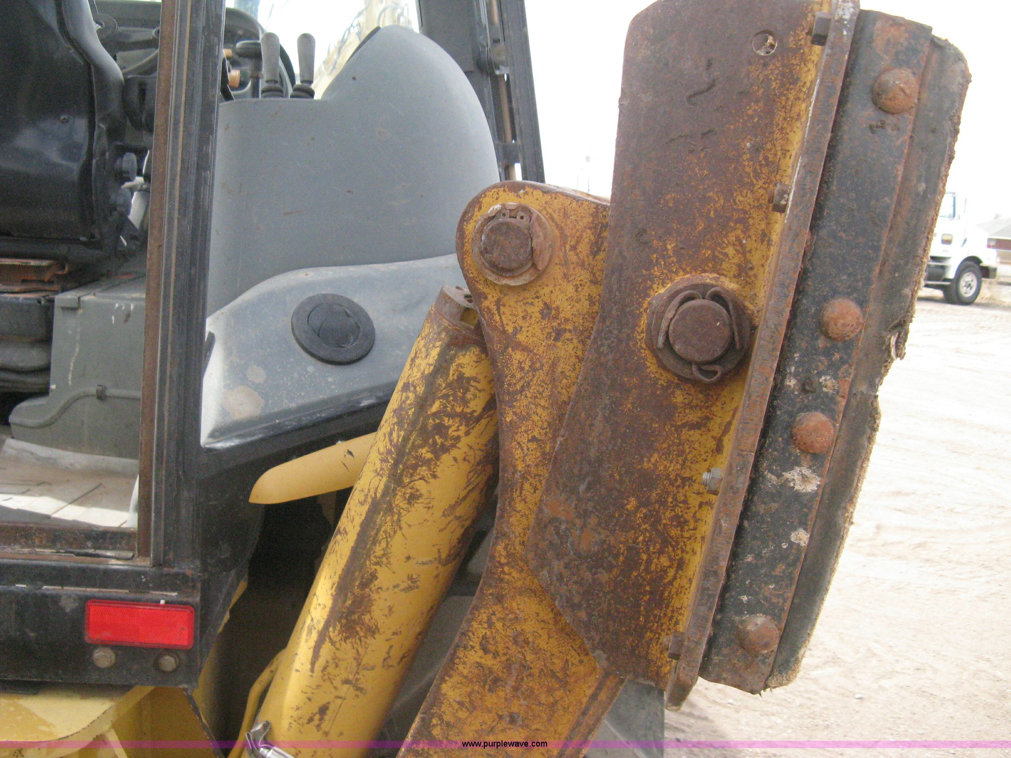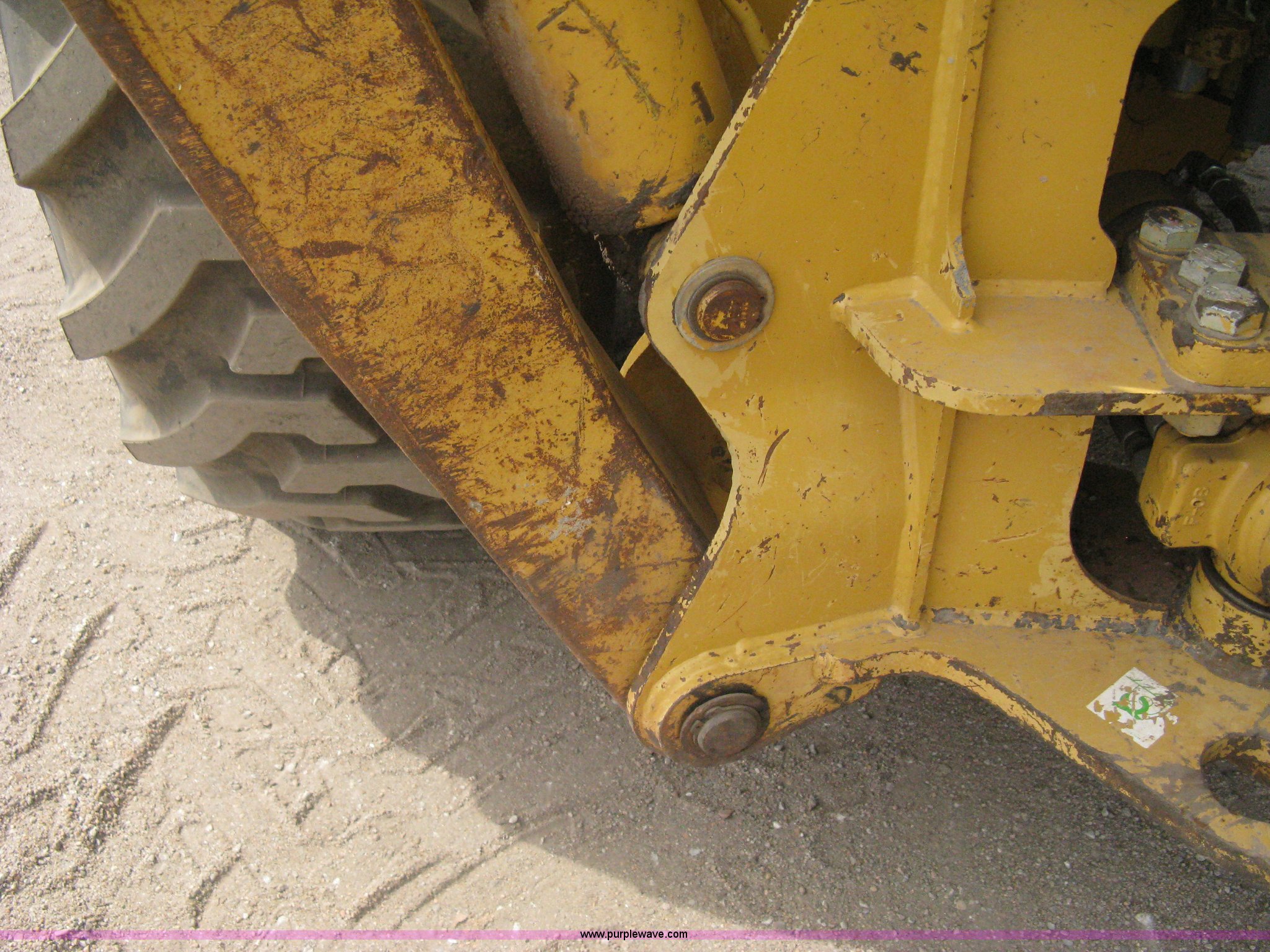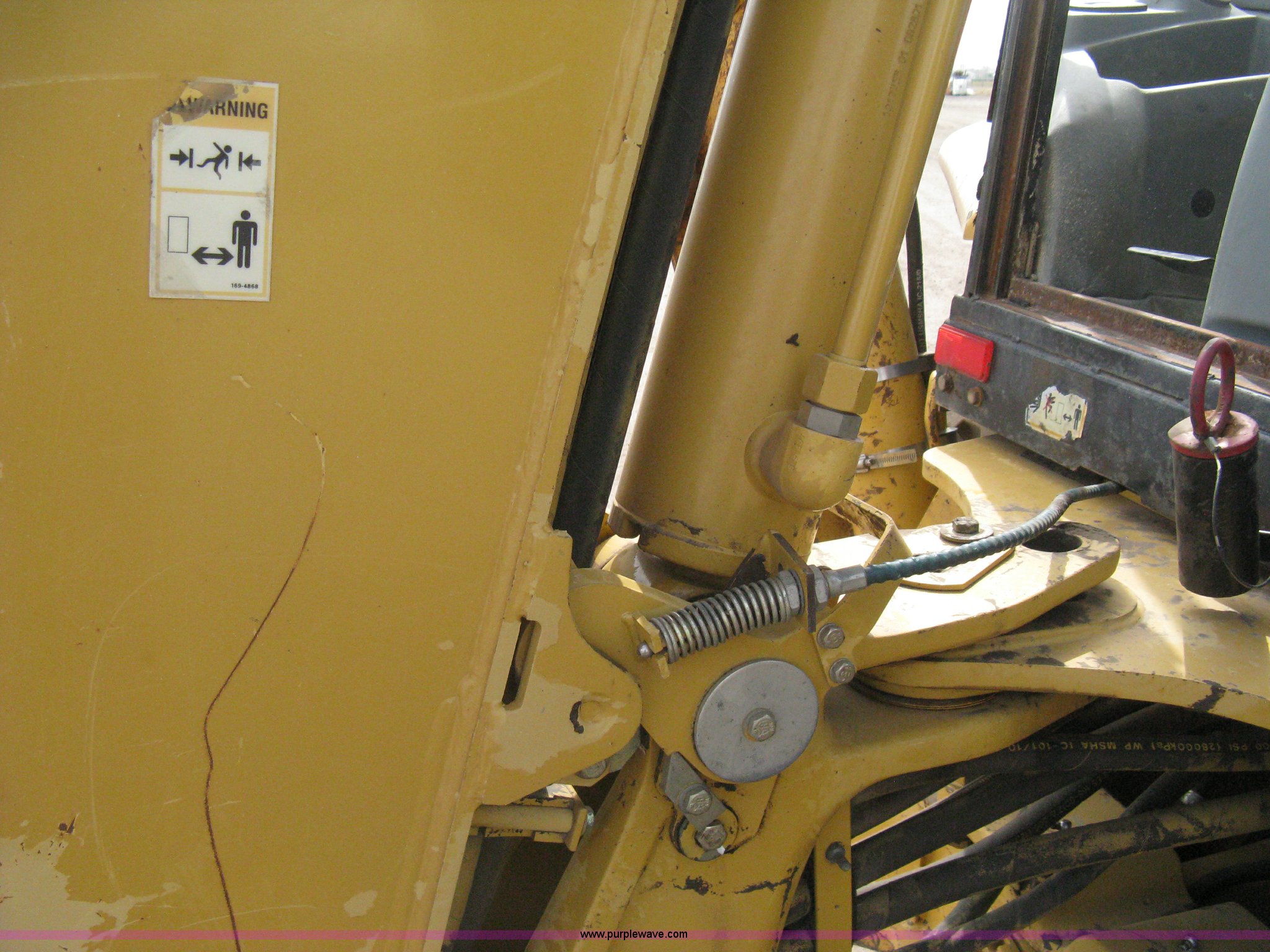 Purple Wave is selling a used Tractor Loader Backhoe in Kansas. This item is a 2002 Caterpillar 416D backhoe with the following: 7,222 hours on meter, Caterpillar diesel engine, Serial 7BJ56286, Four speed shuttle shift transmission, Four wheel drive, Enclosed cab, Heat, Tilt, Suspension seat, Weatherband radio, Joystick loader control, Outriggers, Street pads, Auxiliary hydraulics, Extend-a-hoe, 24"W pin-on backhoe bucket, (5) rock teeth, Welded flat ditch plate, 88"W loader bucket, Bolt-on cutting edge, Drain holes in bucket, Weld repairs, Hard serviced, Work lights, Front counter weights, Firestone 12.5/80-18 front tires, One recently replaced, Recently replaced Firestone 19.5L-24 rear tires, Service records available, One owner, Side and rear glass missing, Serial CAT0416DPBFP03214, Unit# 5363L