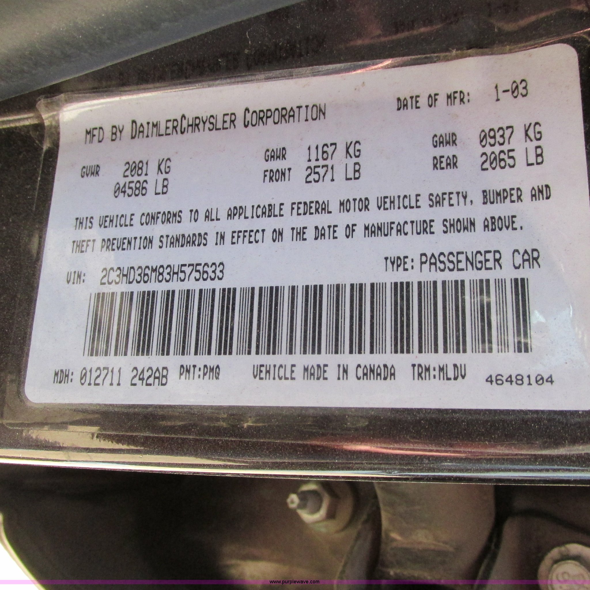 Purple Wave is selling a used Wrecked and Abandoned in Kansas. This item is a 2003 Chrylser Concorde with the following: 150,322 miles on odometer, 3.5L V6 SOHC 24V gas engine, Automatic transmission, AC and heat, Tilt, Cruise, AM/FM/CD, Power windows, locks, mirrors, and seats, Leather interior, P225/60R16 tires, Keys included, Cracked windshield, Hail damage, Damaged taillight, Interior damage, Exterior damage, Laptop removed, Interior/exterior cosmetic damage, Case# 14C10474