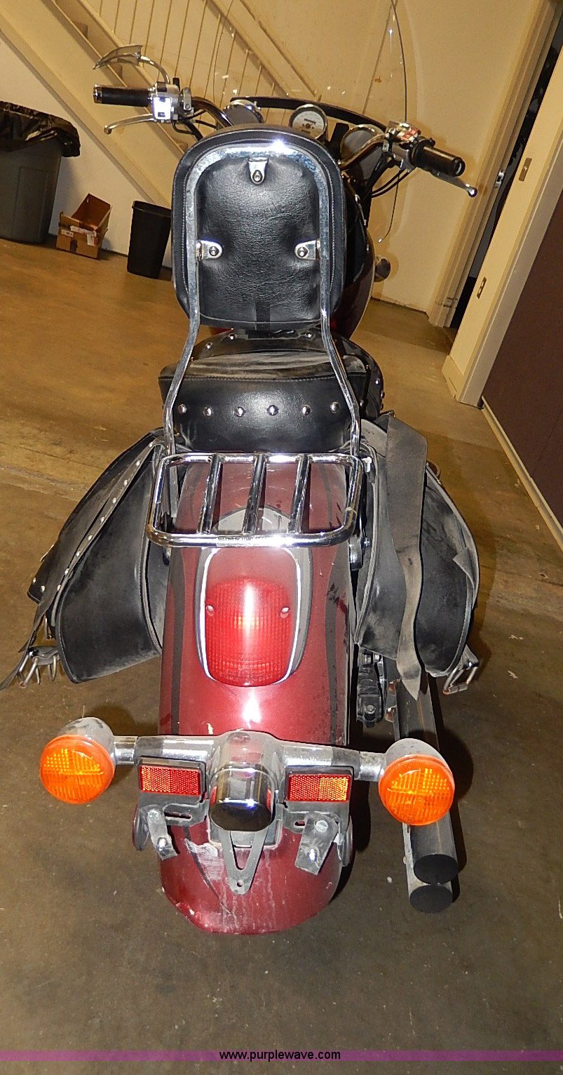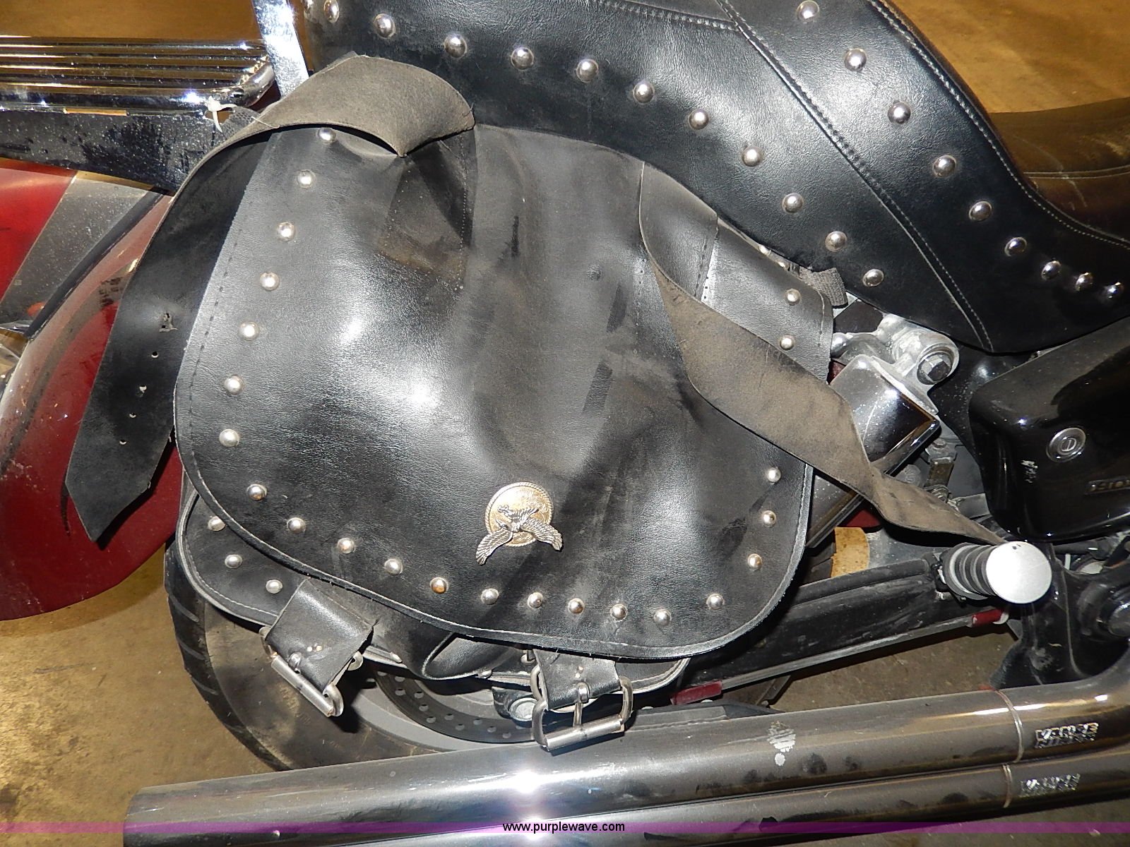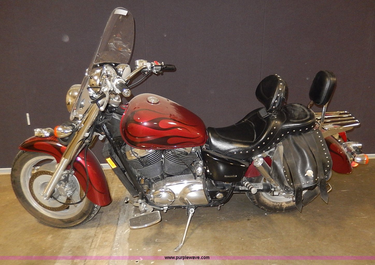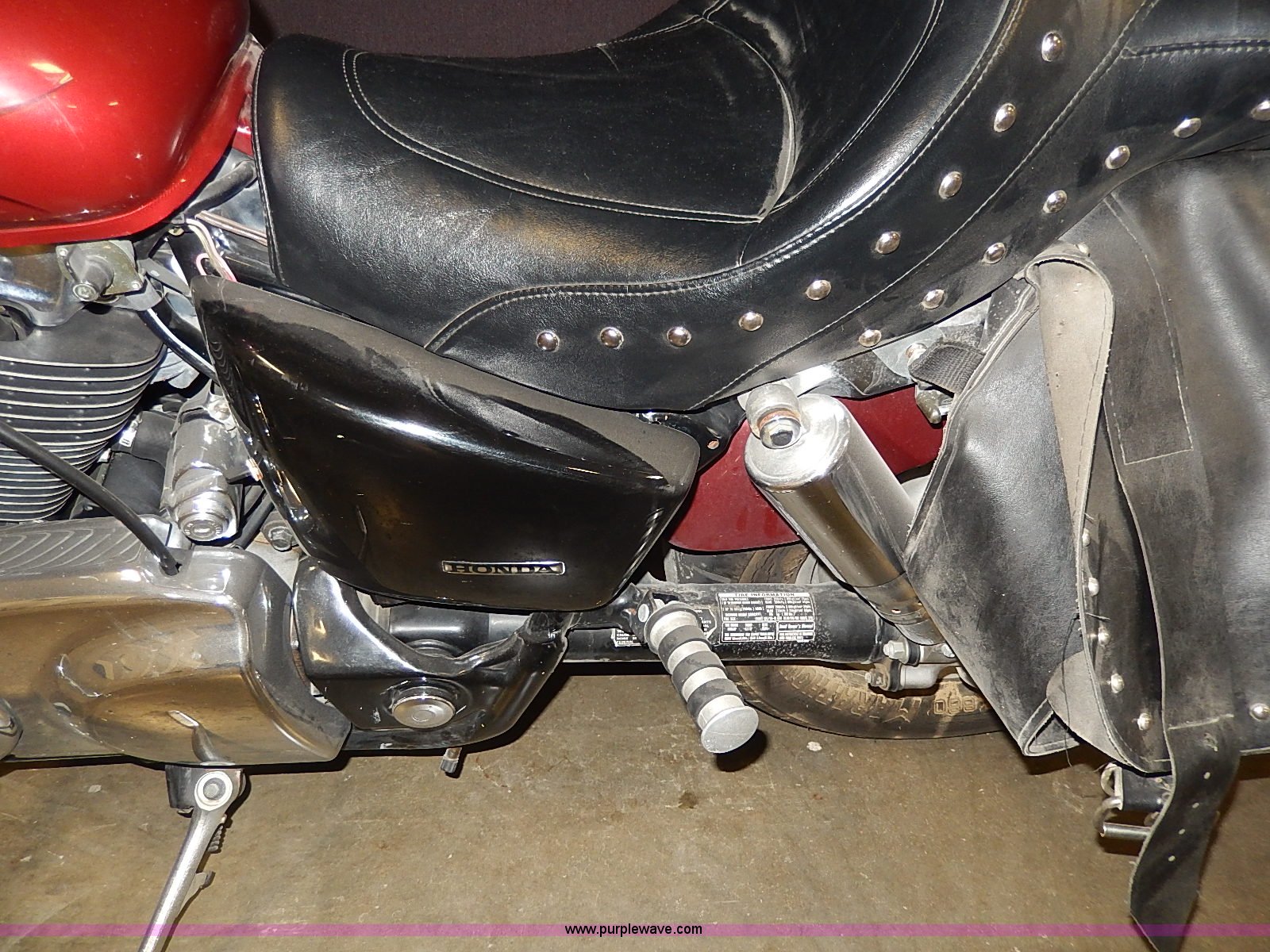 Purple Wave is selling a used Motorcycle in Kansas. This item is a 2002 Honda Shadow motorcycle with the following: 33,574 miles on odometer, Engine turns over, Custom mirror, Leather saddlebags, Cobra foot rests, Vance&Hines straight pipes, Pin striping and custom decor, Front windshield, Disk brakes, 120/90B18 tire, 170/80R15 rear tire, Right mirror missing, Unknown running condition