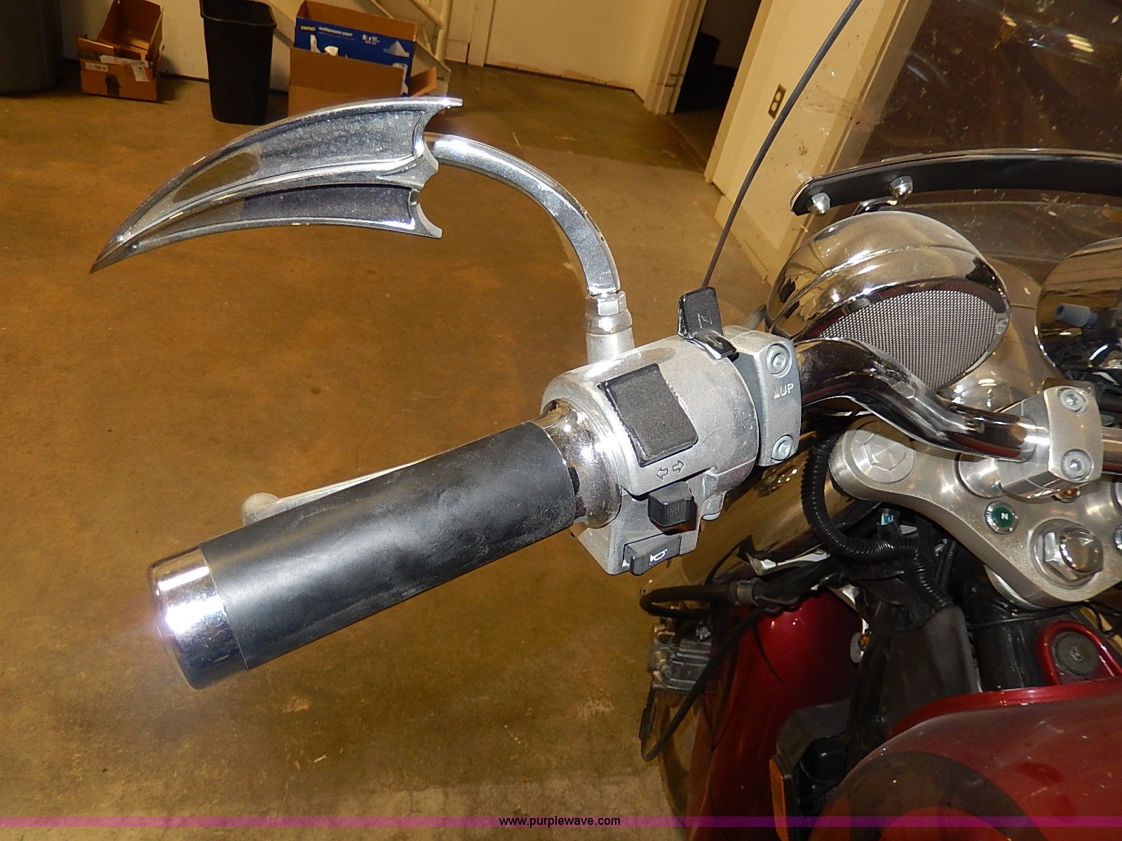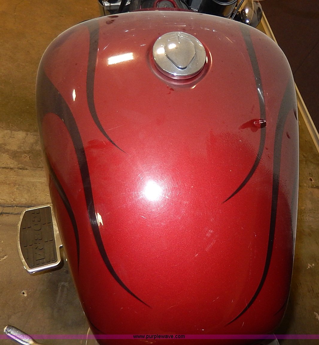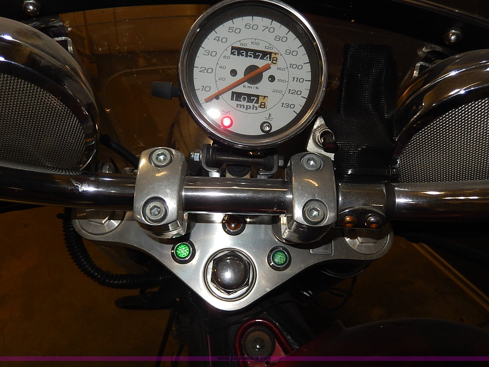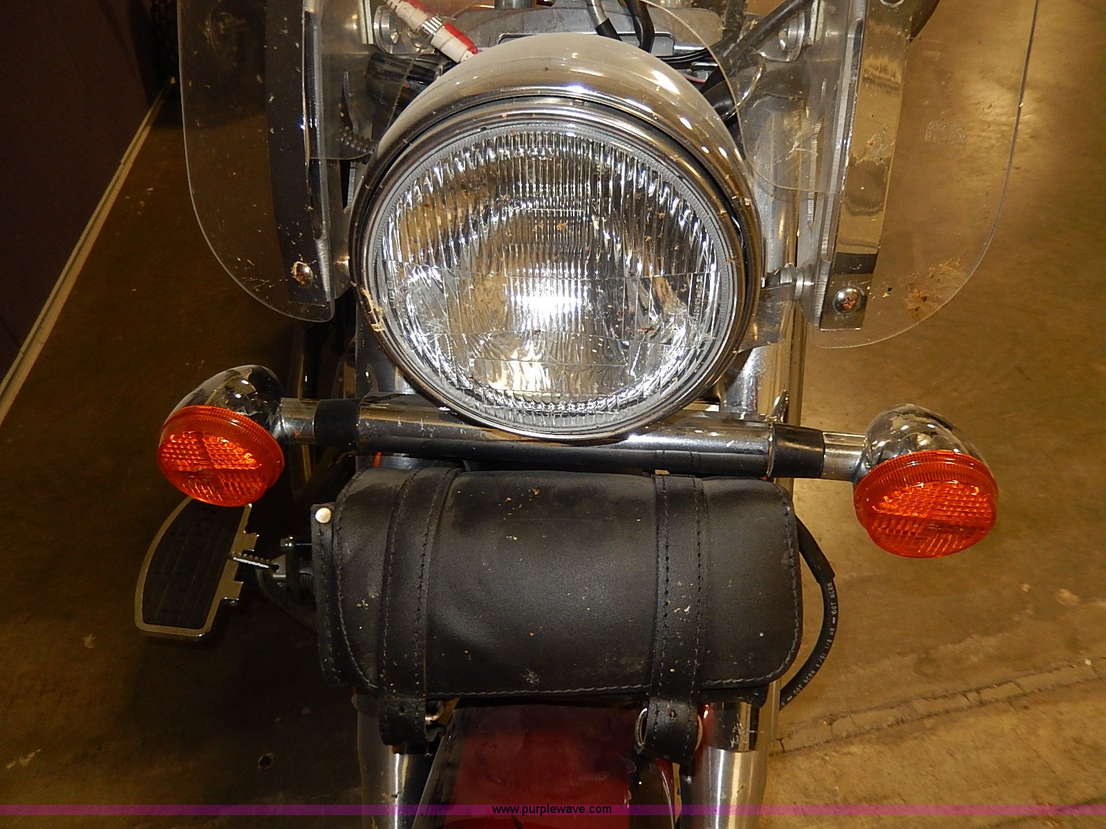 Purple Wave is selling a used Motorcycle in Kansas. This item is a 2002 Honda Shadow motorcycle with the following: 33,574 miles on odometer, Engine turns over, Custom mirror, Leather saddlebags, Cobra foot rests, Vance&Hines straight pipes, Pin striping and custom decor, Front windshield, Disk brakes, 120/90B18 tire, 170/80R15 rear tire, Right mirror missing, Unknown running condition