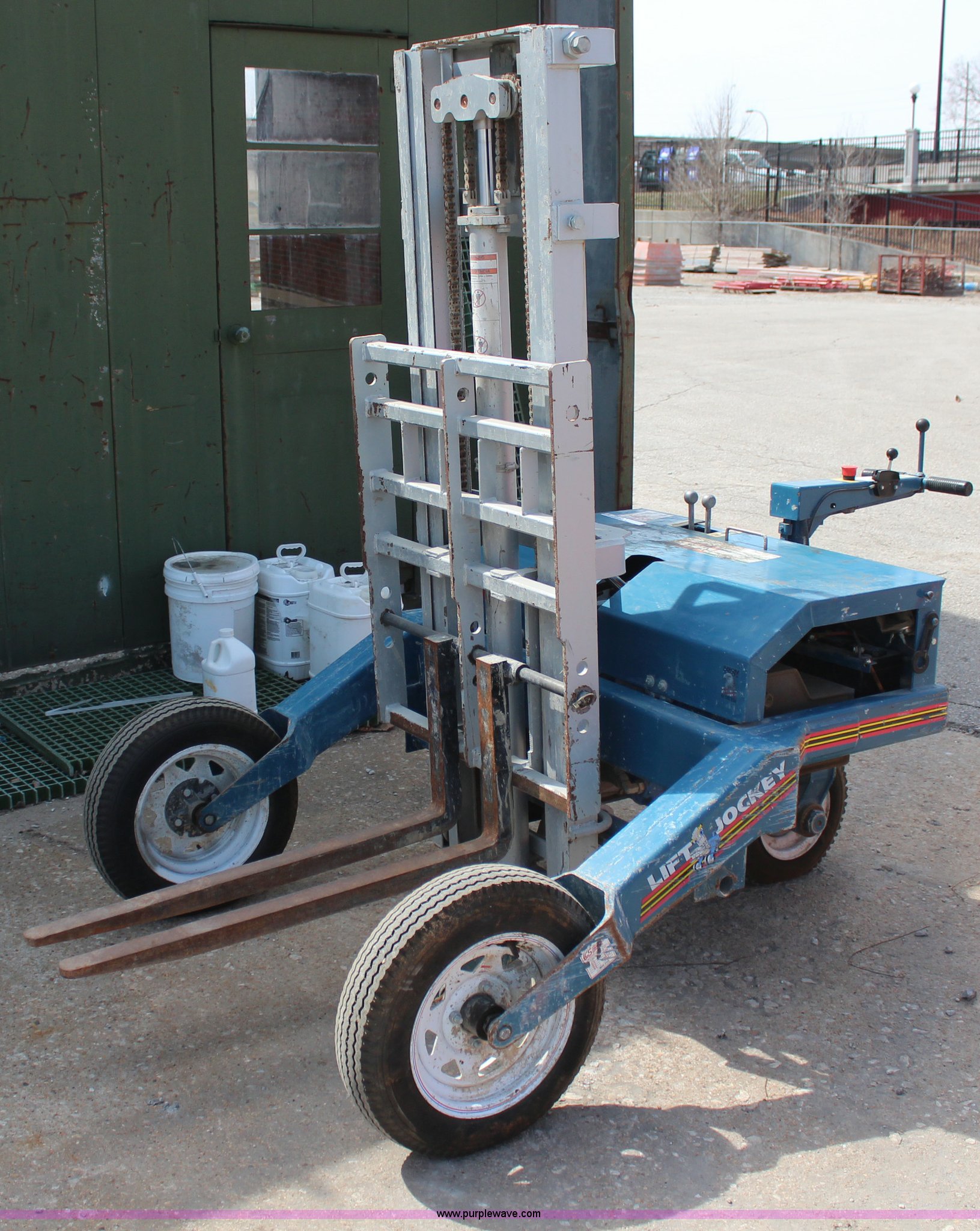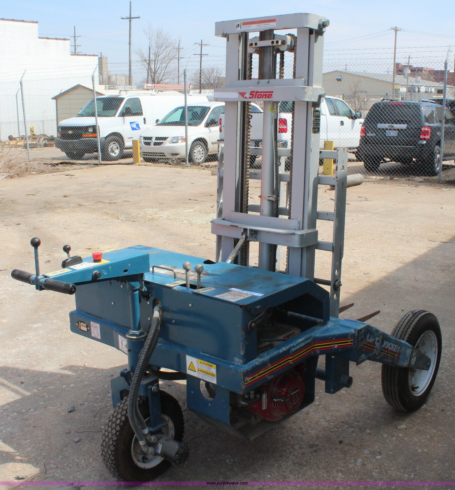 Purple Wave is selling a used Tools in Kansas. This item is a Stone LJ100 lift jockey with the following: Honda GX240 gas engine, Electric start, 8.5'H mast, 1,500 lbs capacity, 36" x 2" forks, 28" carriage, Serial 152010602