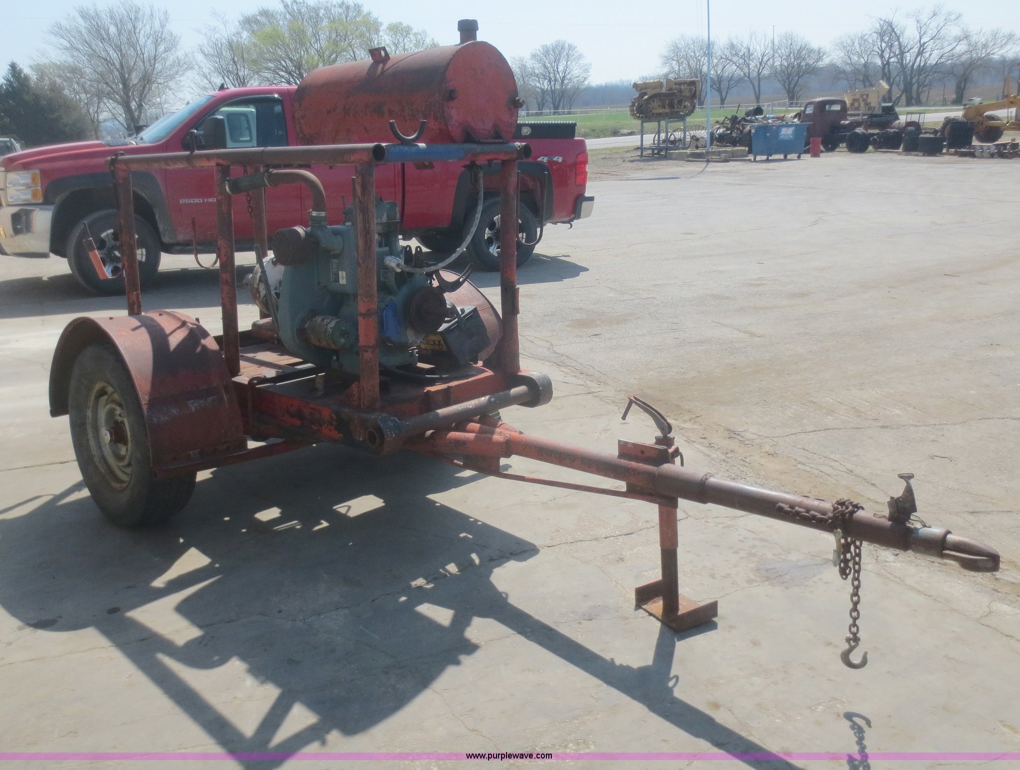 Purple Wave is selling a used Pump in Kansas. This item is a Mission water pump with the following: Lister one cylinder diesel engine, Serial 57365T1A31-13, Belt drive, 2" inlet/outlet, Twin disk manual clutch, 2" ball, 235/75R15 tires
