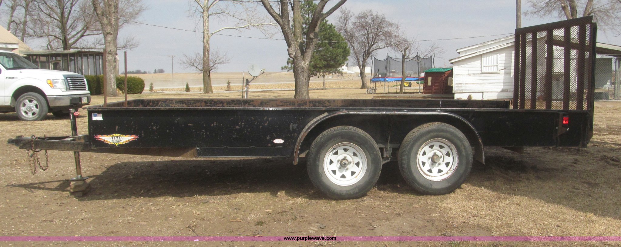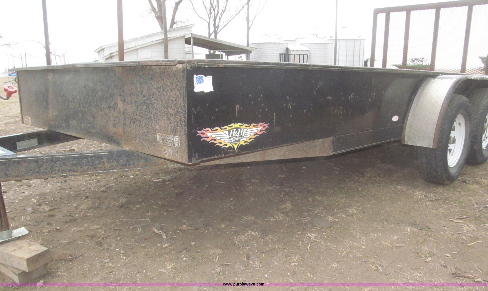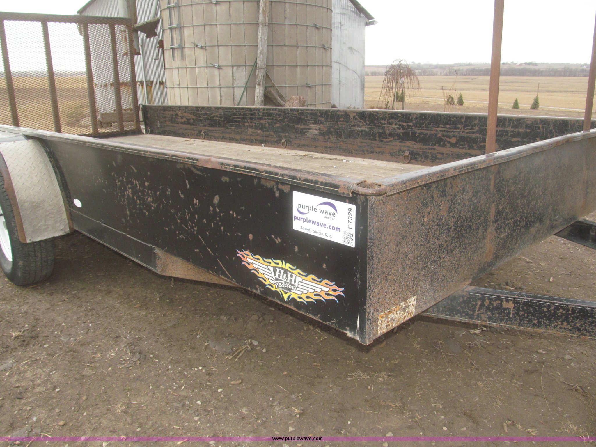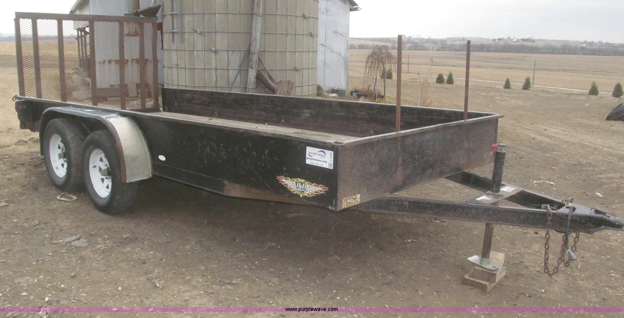 Purple Wave is selling a used Car or Utility Trailer in Nebraska. This item is a 2005 H&H tandem axle trailer with the following: 16'L, 194"L x 75.5"W I.D. deck, 13.5"H sideboards, Wood deck, 48"L x 74"W expanded metal fold down ramp, 36"L x 7/8" front vertical hex rods, Side mounted D-ring tie downs, Safety chains, Bulldog jack stand, 2 5/16" ball hitch, ST225/75R15 tires, GVWR 7,000 lbs, GAWR 3,500 lbs per axle