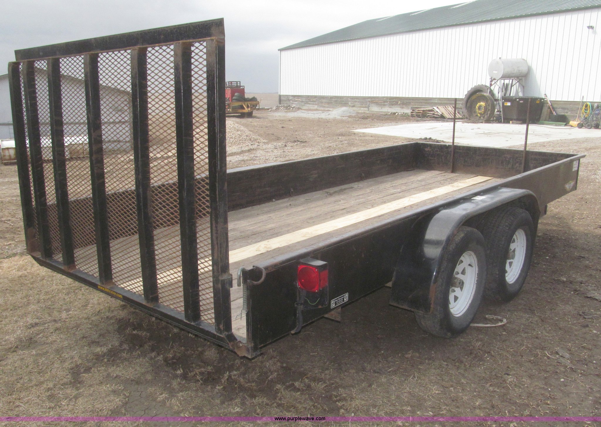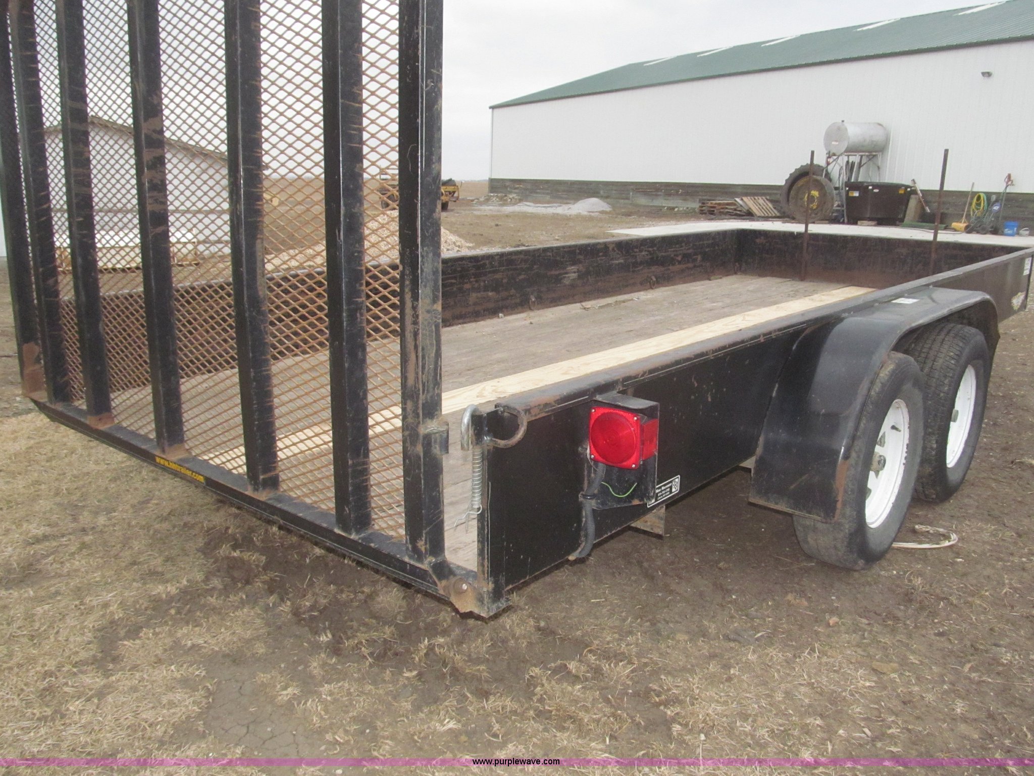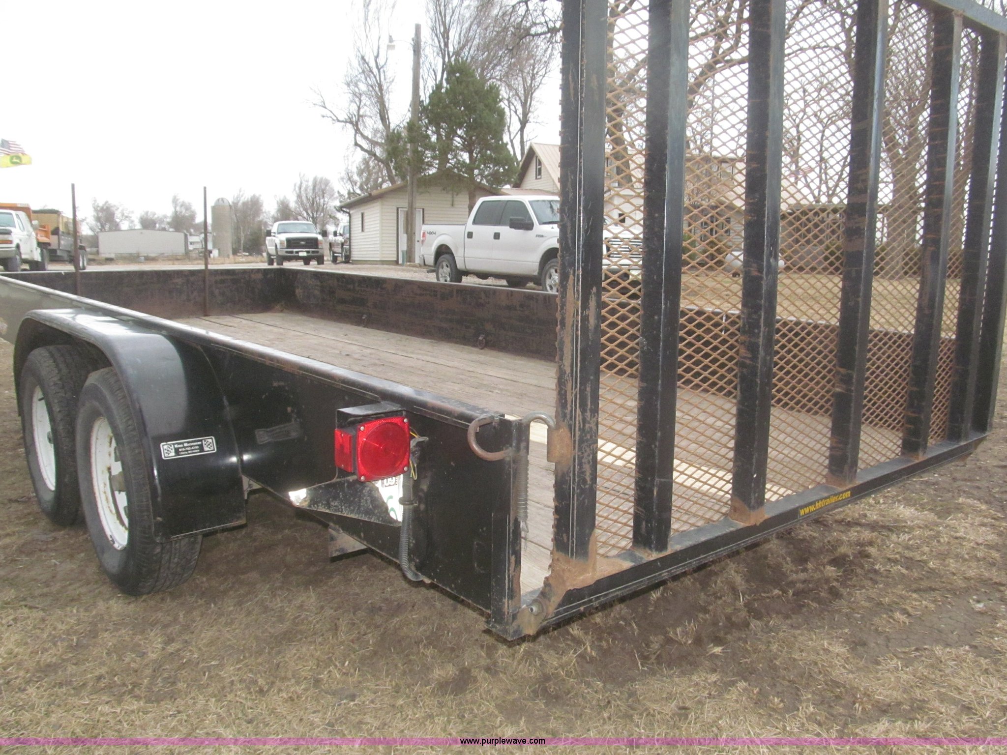 Purple Wave is selling a used Car or Utility Trailer in Nebraska. This item is a 2005 H&H tandem axle trailer with the following: 16'L, 194"L x 75.5"W I.D. deck, 13.5"H sideboards, Wood deck, 48"L x 74"W expanded metal fold down ramp, 36"L x 7/8" front vertical hex rods, Side mounted D-ring tie downs, Safety chains, Bulldog jack stand, 2 5/16" ball hitch, ST225/75R15 tires, GVWR 7,000 lbs, GAWR 3,500 lbs per axle
