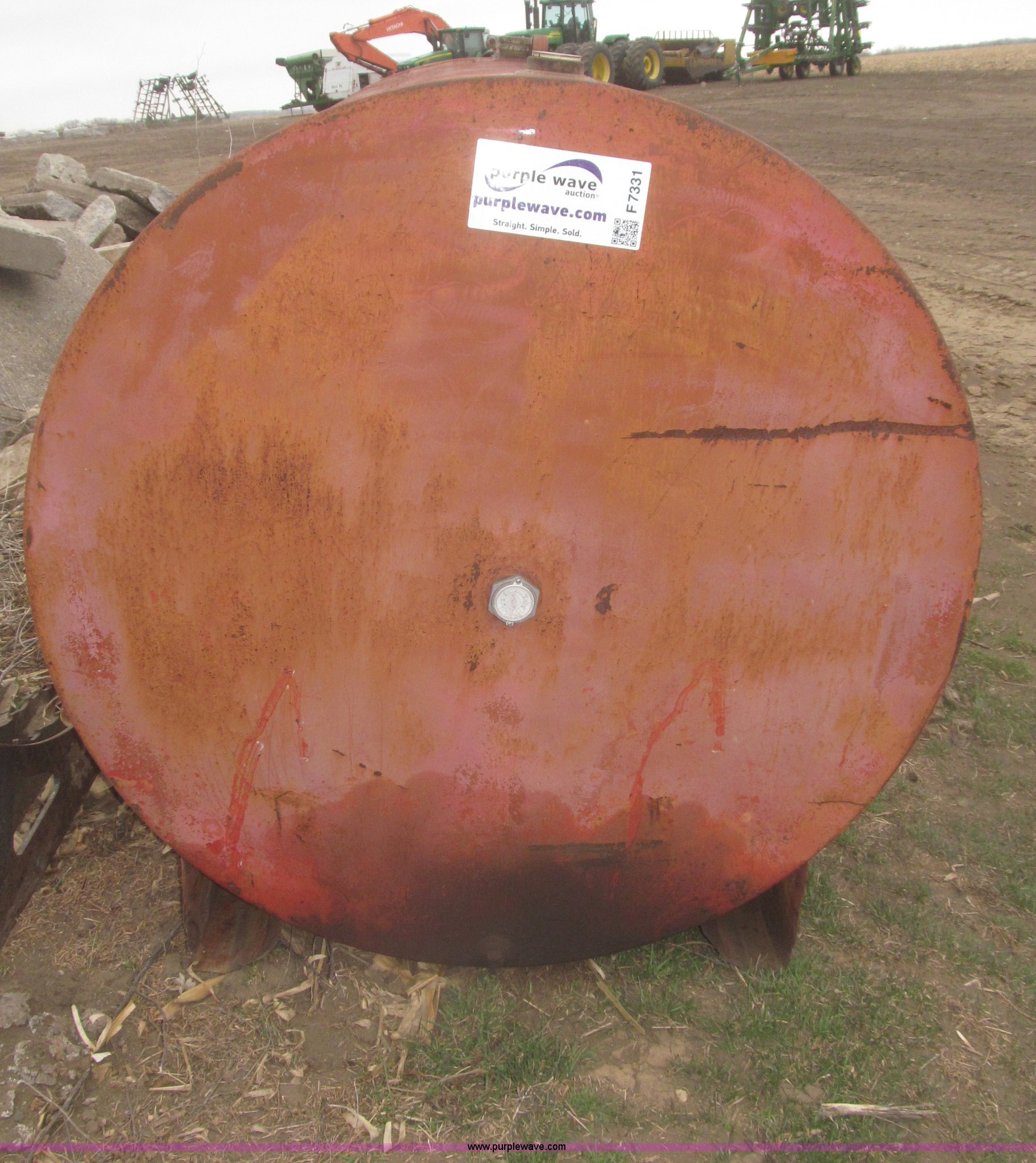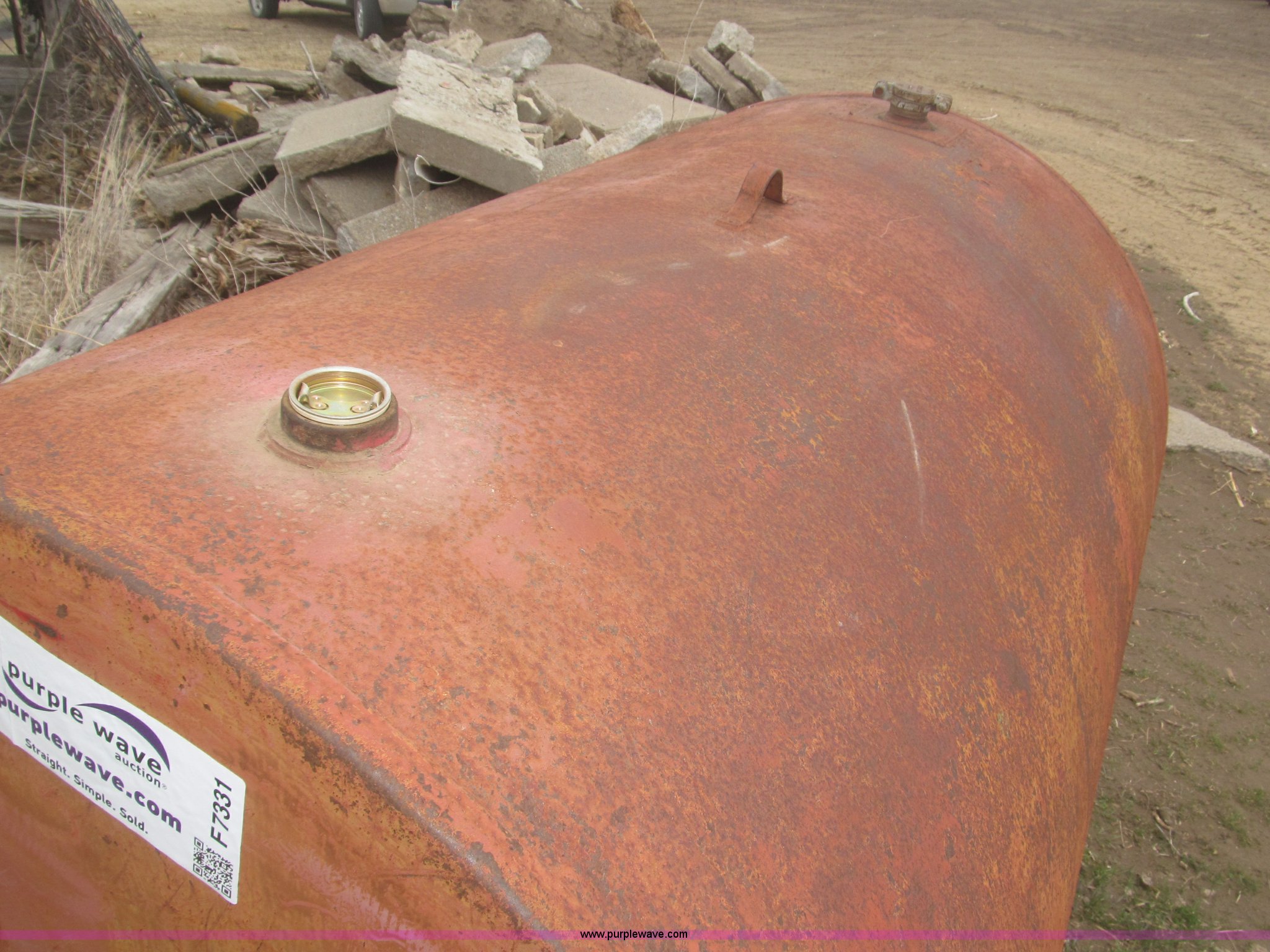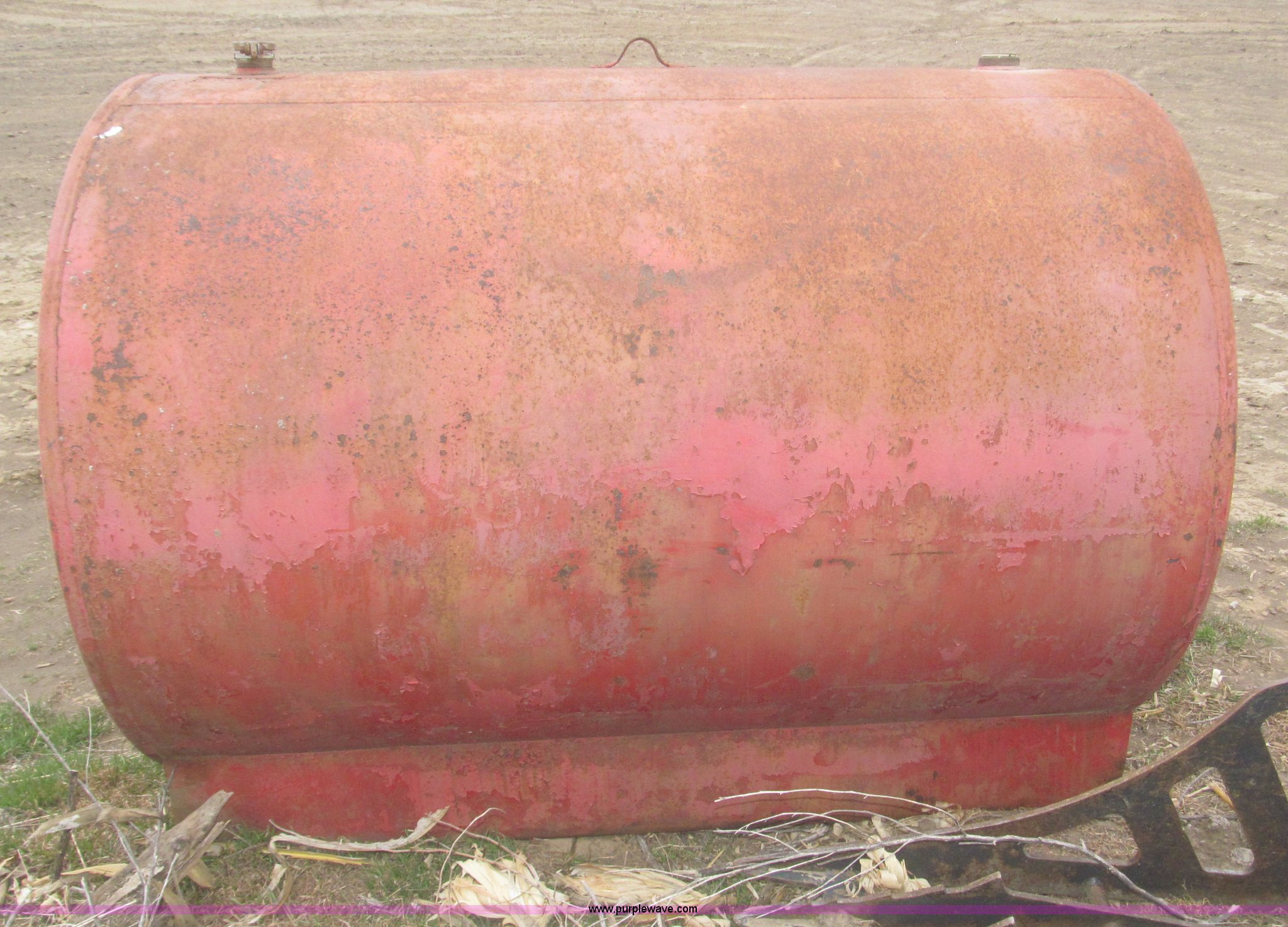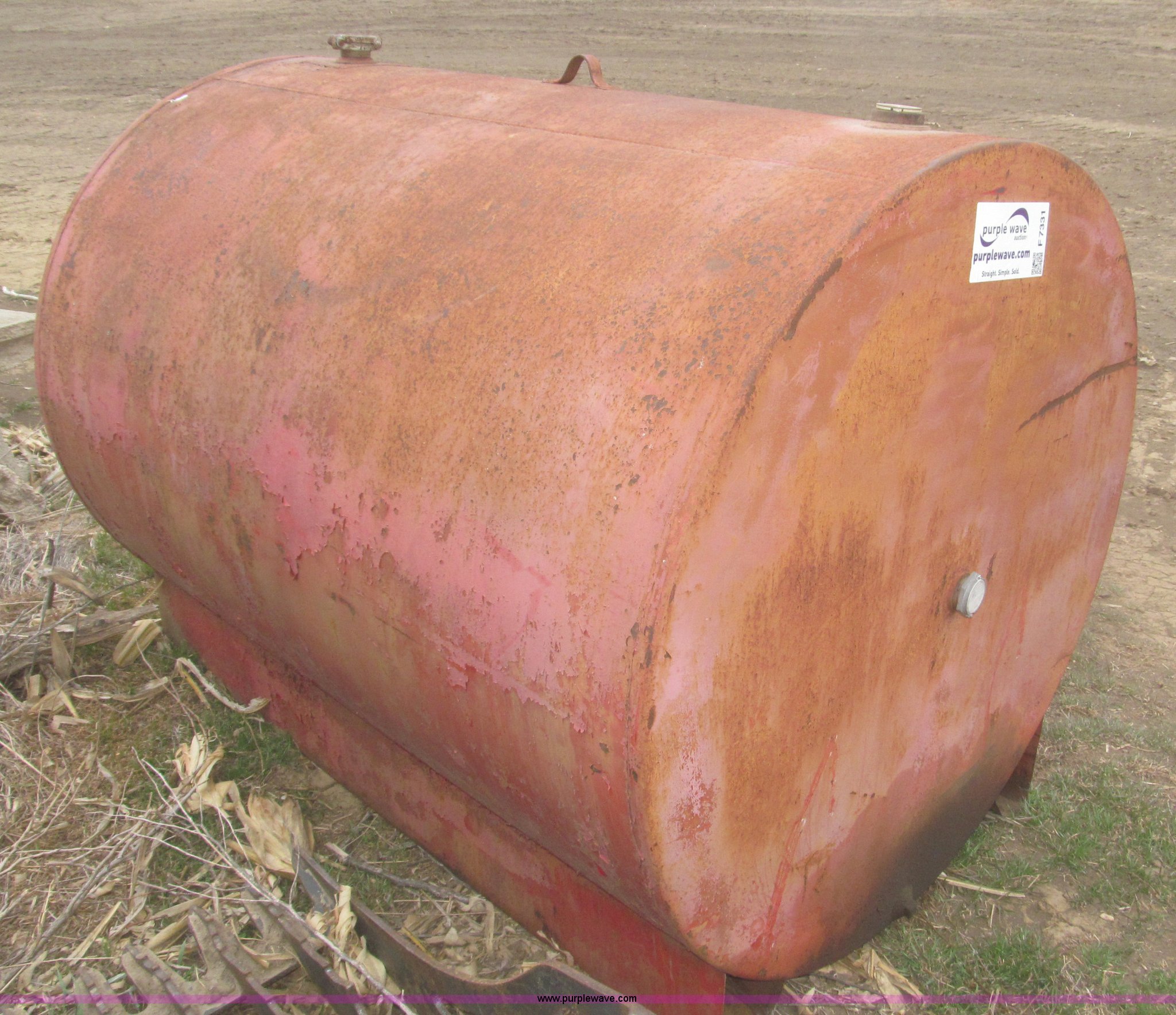 Purple Wave is selling a used Fuel and Lube in Nebraska. This item is a 350 gallon fuel tank with the following: 65"L x 48" diameter, Top fill cap, Lifting eye, No pump, Level indicator cracked