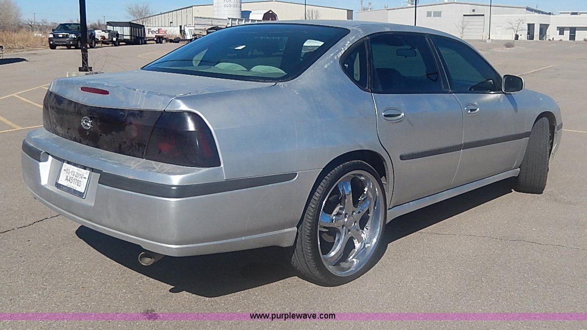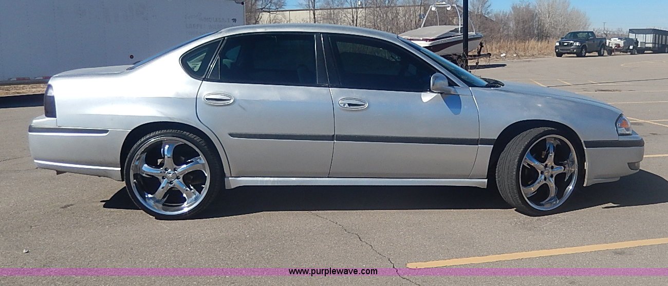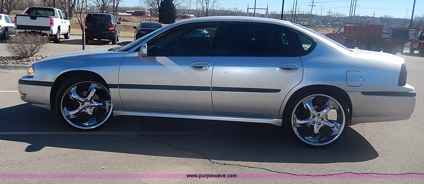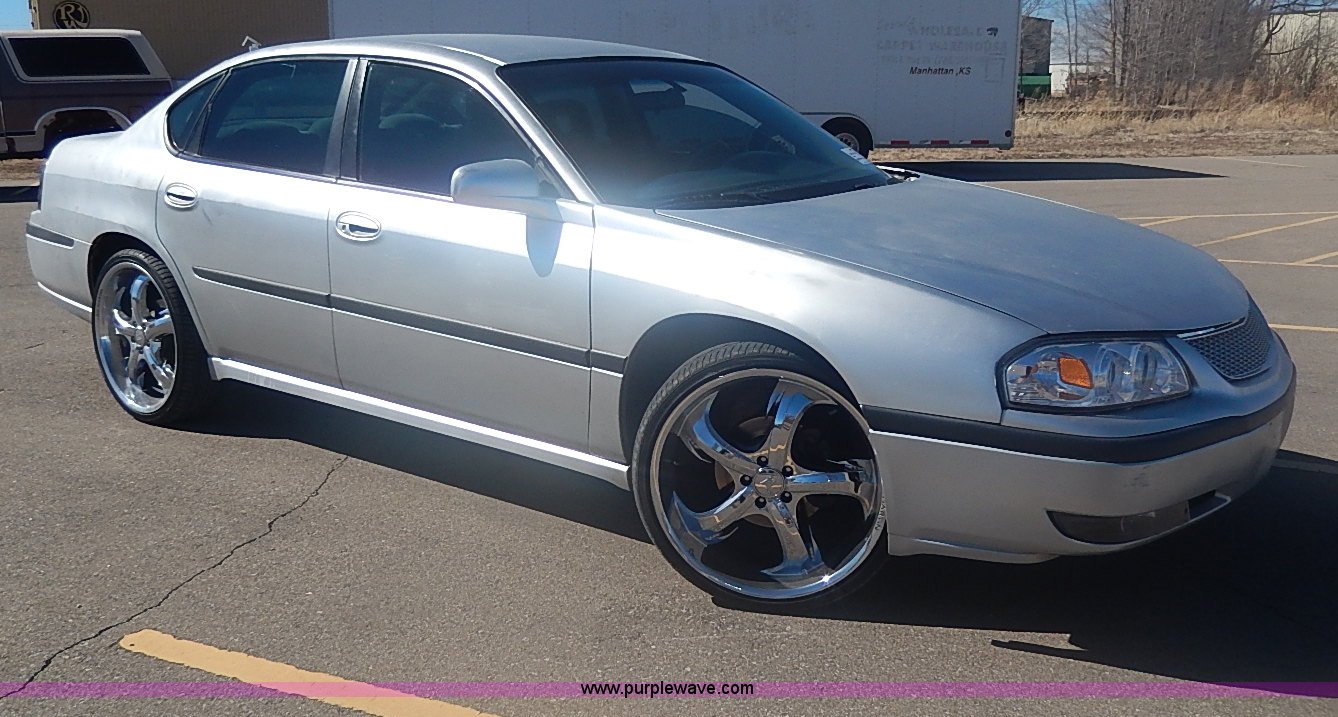 Purple Wave is selling a used Passenger Vehicle in Kansas. This item is a 2000 Chevrolet Impala LS with the following: 174,719 miles on odometer, 3.8L V6 OHV 12V gas engine, Automatic transmission, AC and heat, Tilt, Cruise, Power windows, locks, mirrors, and seats, Cloth interior, Steering wheel radio controls, Temperature and direction in rear view mirror, Joe Martin wheels, 245/30ZR22 tires, Trunk cosmetic damage, Front tire has cut in sidewall, Check engine light is on, ABS light is on, Radio missing