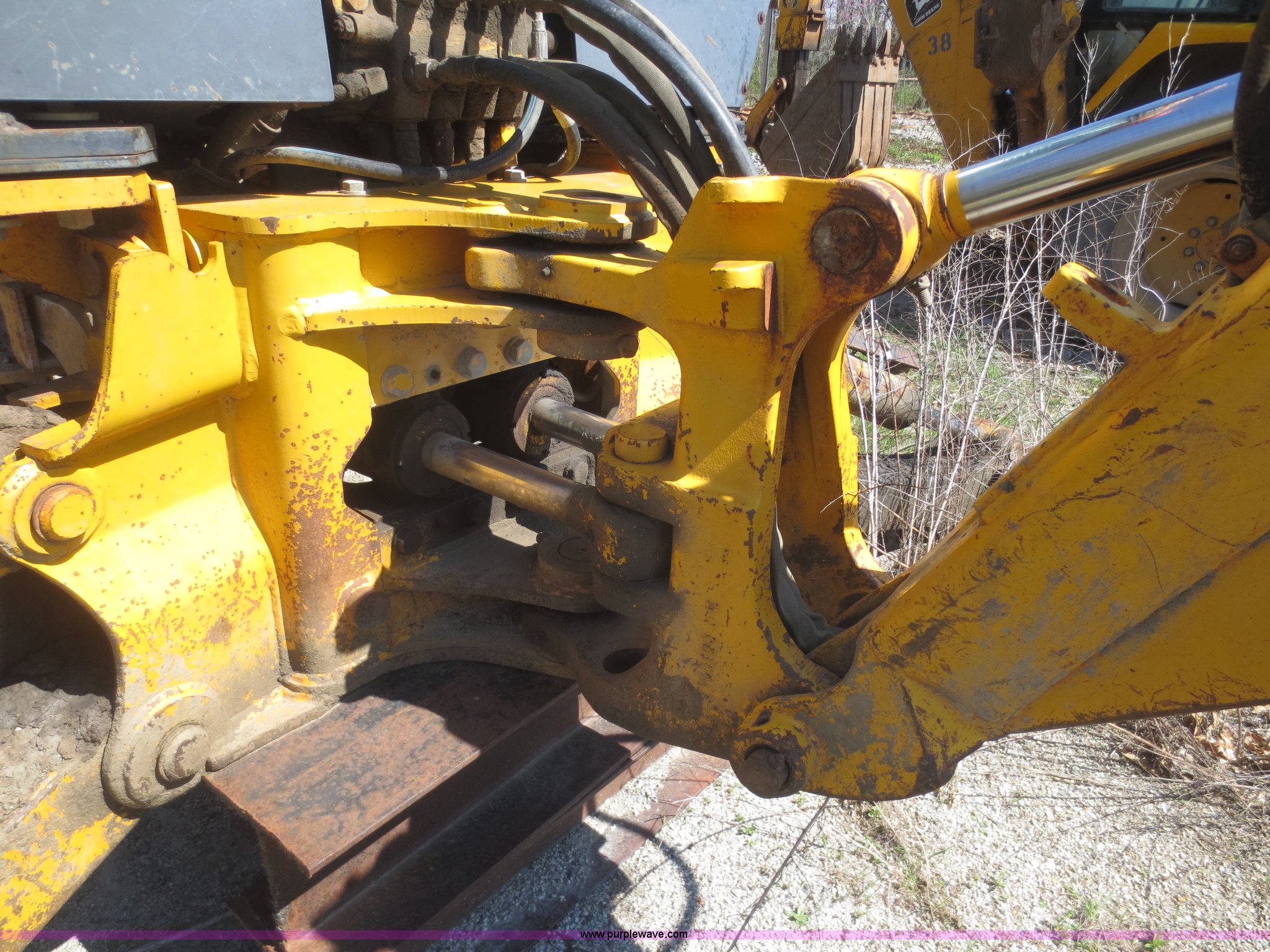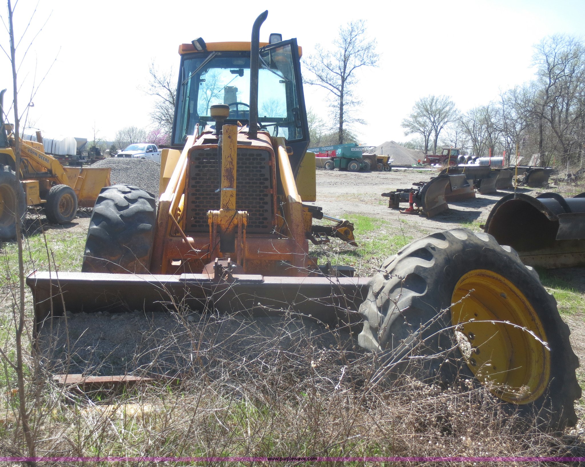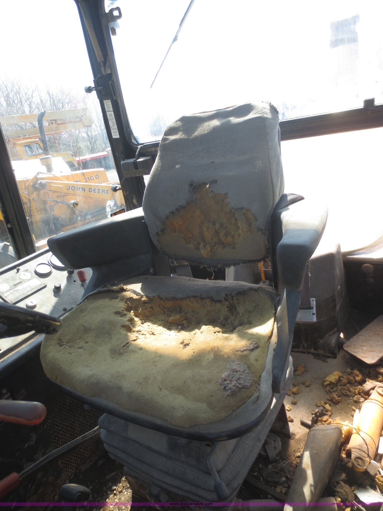 Purple Wave is selling a used Tractor Loader Backhoe in Kansas. This item is a John Deere 310C backhoe with the following: 4,605 hours on meter, John Deere four cylinder diesel engine, Transmission and rear end removed, Heat, Windshield wipers, Front and rear work lights, Three stick backhoe controls, 90"W loader bucket, 24"W backhoe bucket, Bolt-on cutting edge, Goodyear 17.5L-24 rear tires, Non-operational, No front tires, Serial T0310CA773488