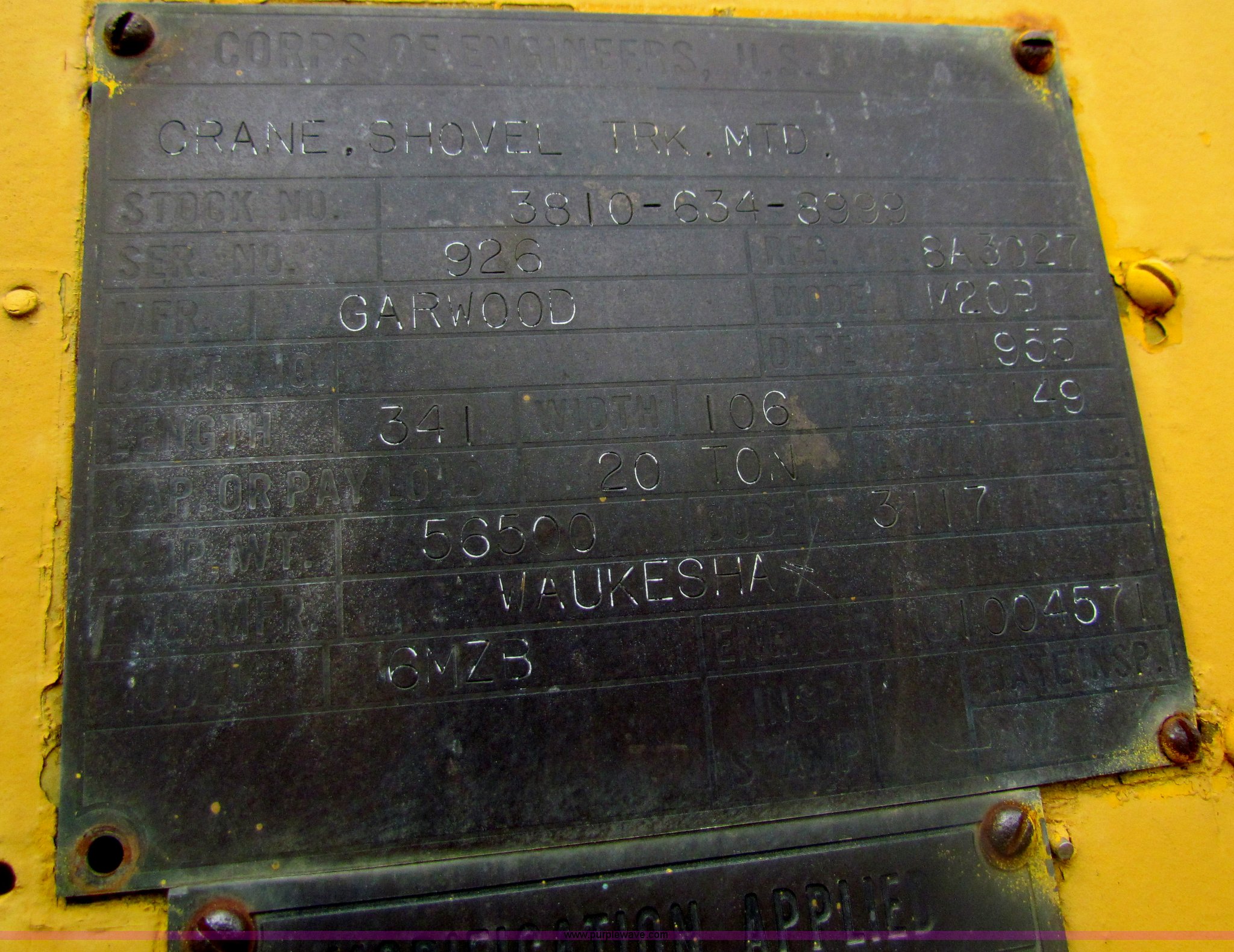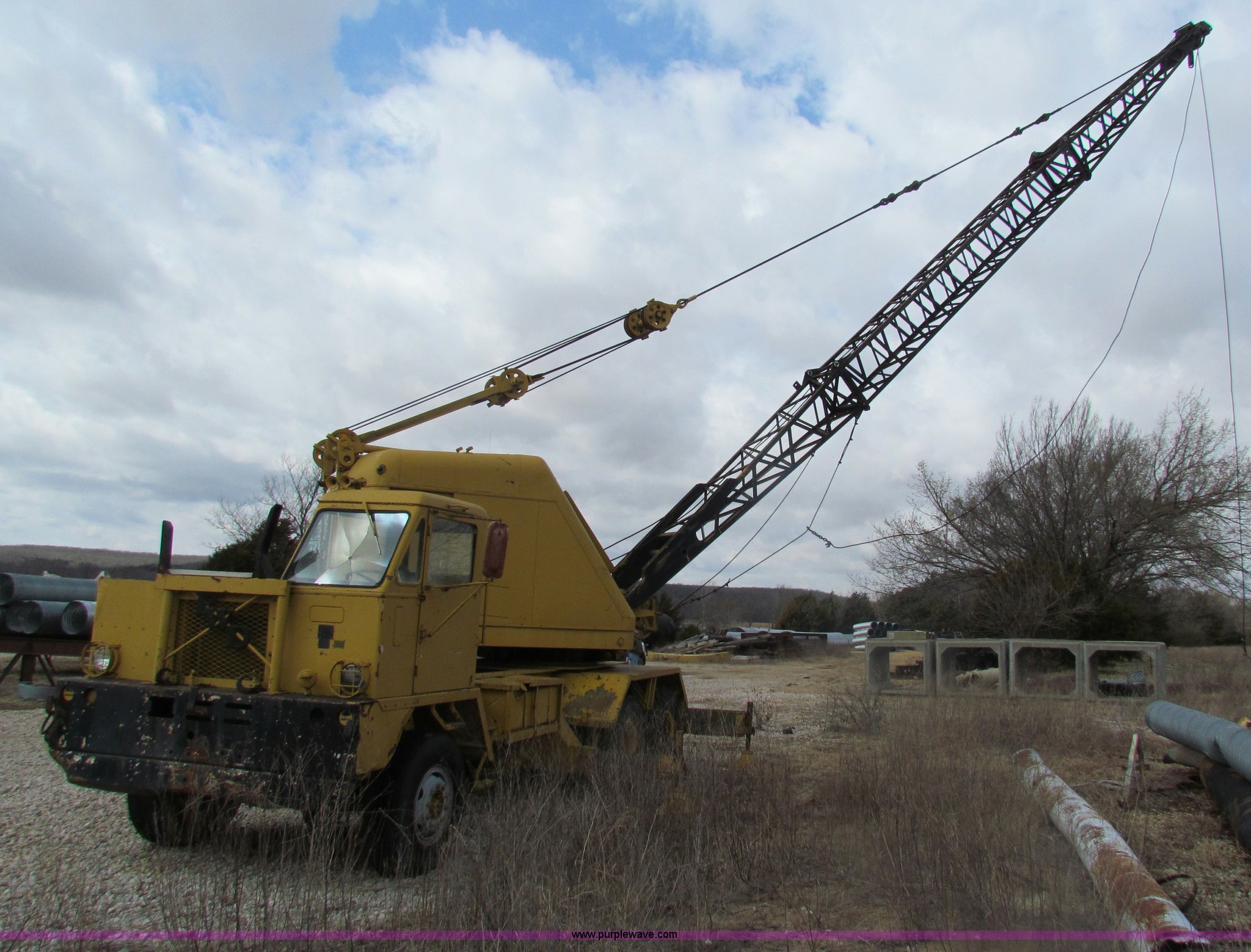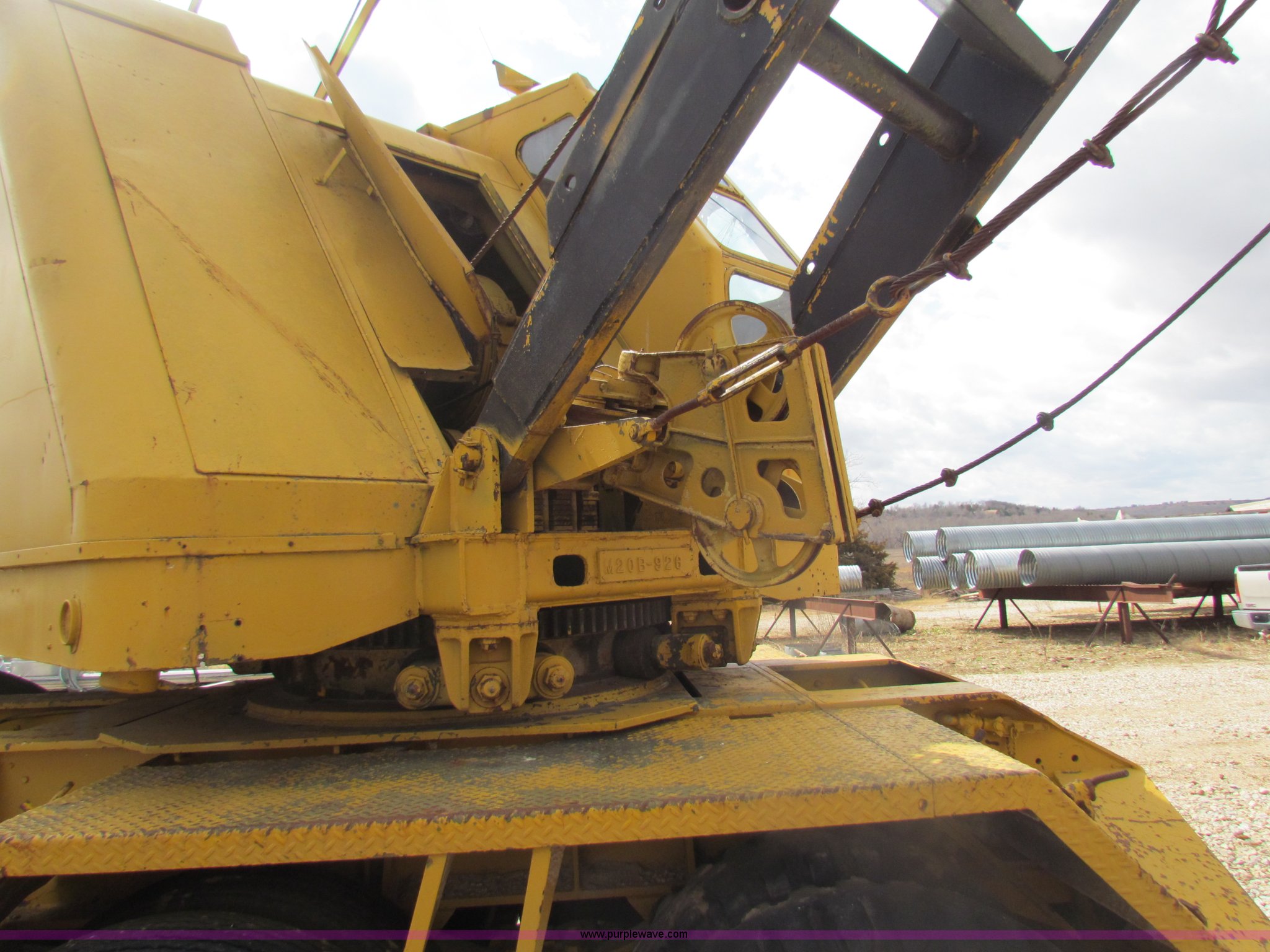 Purple Wave is selling a used Truck Crane in Kansas. This item is a FWD MUC6X6 truck with Garwood 20 ton crane with the following: 5,976 hours on meter, Six cylinder diesel engine, Five speed manual transmission, Six wheel drive, 14/80R20 front tires, 12.00/20 rear tires, Brakes inoperable, Chassis# 118103