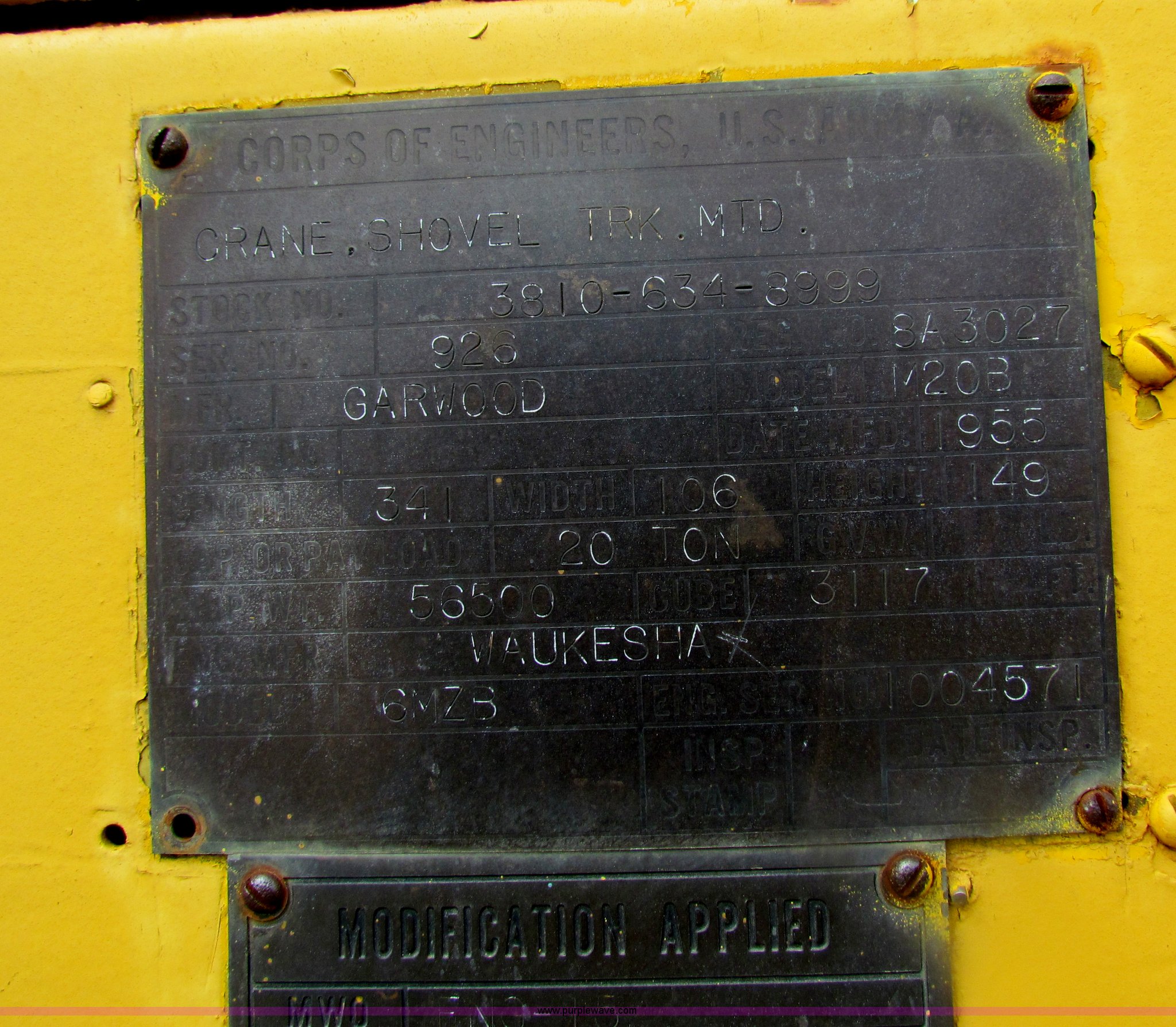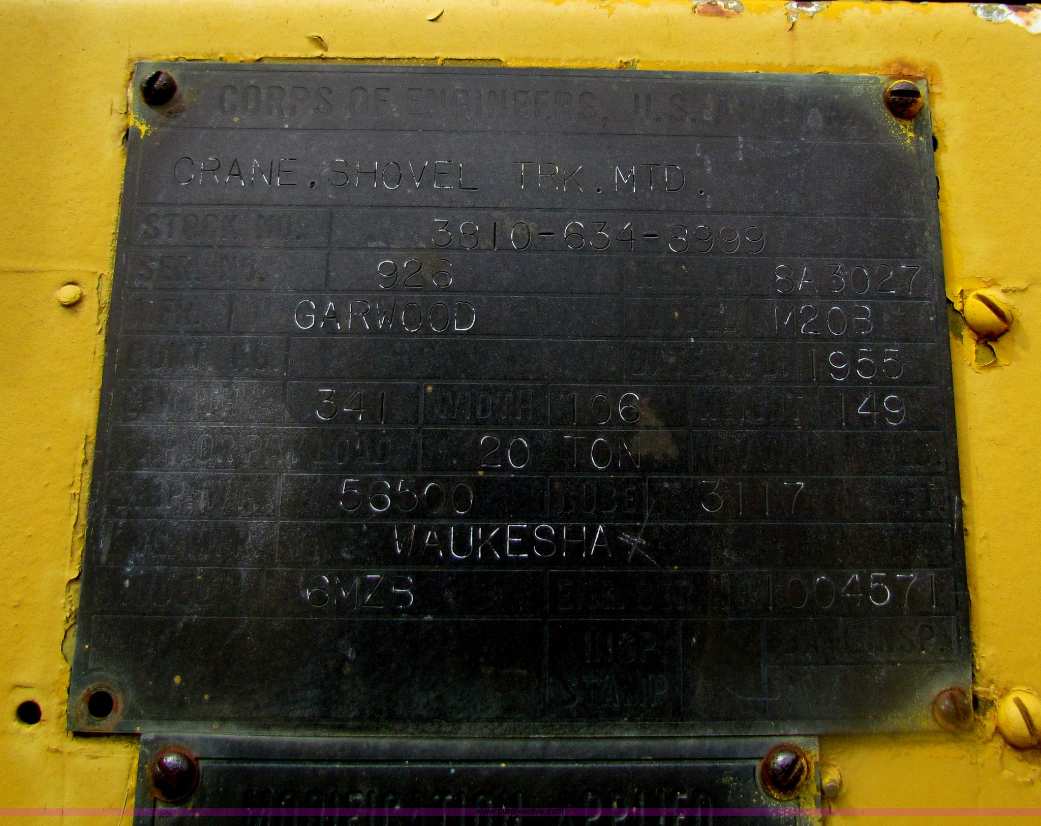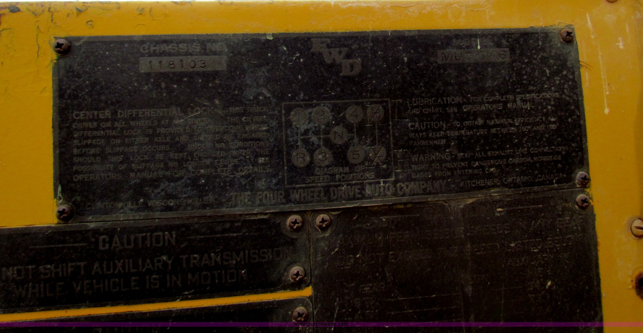 FWD MUC6X6 truck with Garwood 20 ton crane. 5,976 hours on meter, Six cylinder diesel engine, Five speed manual transmission, Six wheel drive, 14/80R20 front tires, 12.00/20 rear tires, Brakes inoperable, Chassis# 118103. 1955 Garwood M20B truck mounted crane Serial 926, 20 ton capacity, 30' three section boom Model M20AF, Waukesha 6MZB engine, Shovel, Clam shell bucket, Operational when parked five years ago. Chautauqua County. Sedan, KS 67361