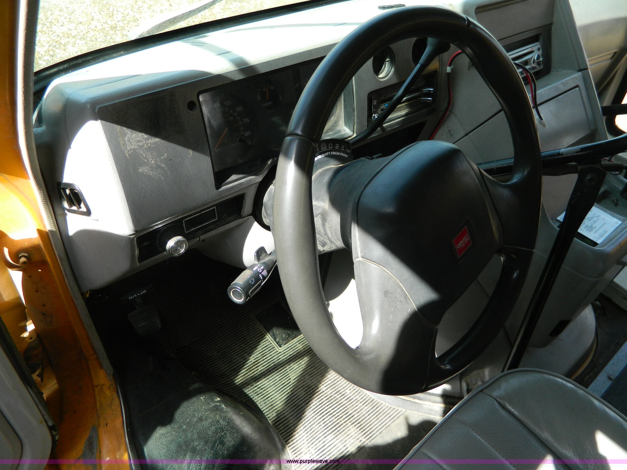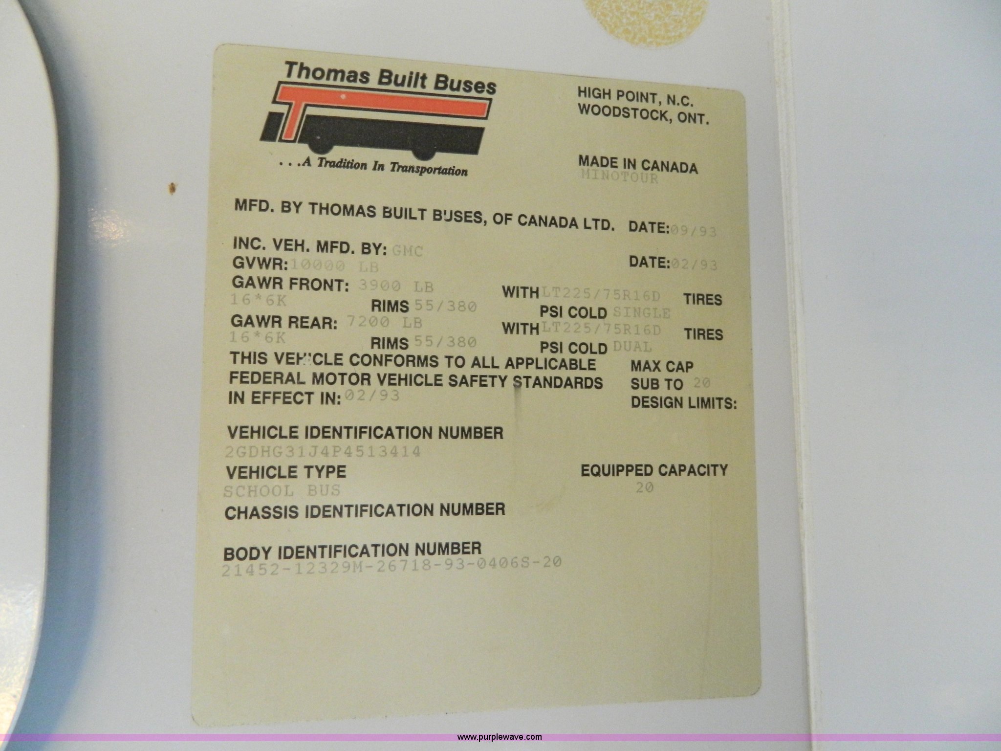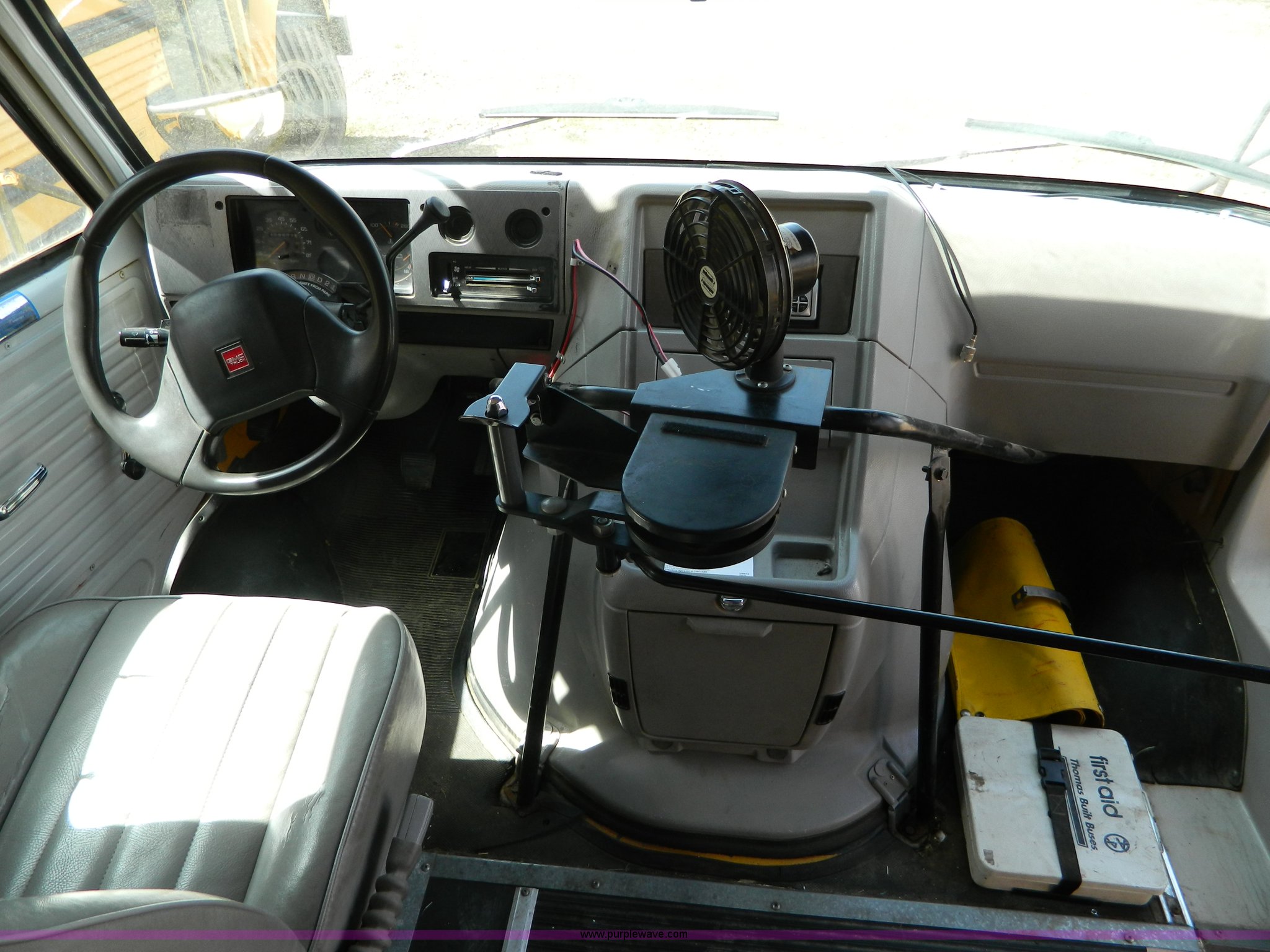 Purple Wave is selling a used Bus in Kansas. This item is a 1993 GMC G3500 Magnavan bus with the following: 159,573 miles on odometer, 6.2L V8 FI diesel engine, Automatic transmission, Heat, AM/FM/CD, Vinyl interior, 20 passenger capacity, Thomas body, Serial 21452-12329M-26718-93-04-65-20, LT225/75R16 tires, GVWR 10,000 lbs, One glow plug broken