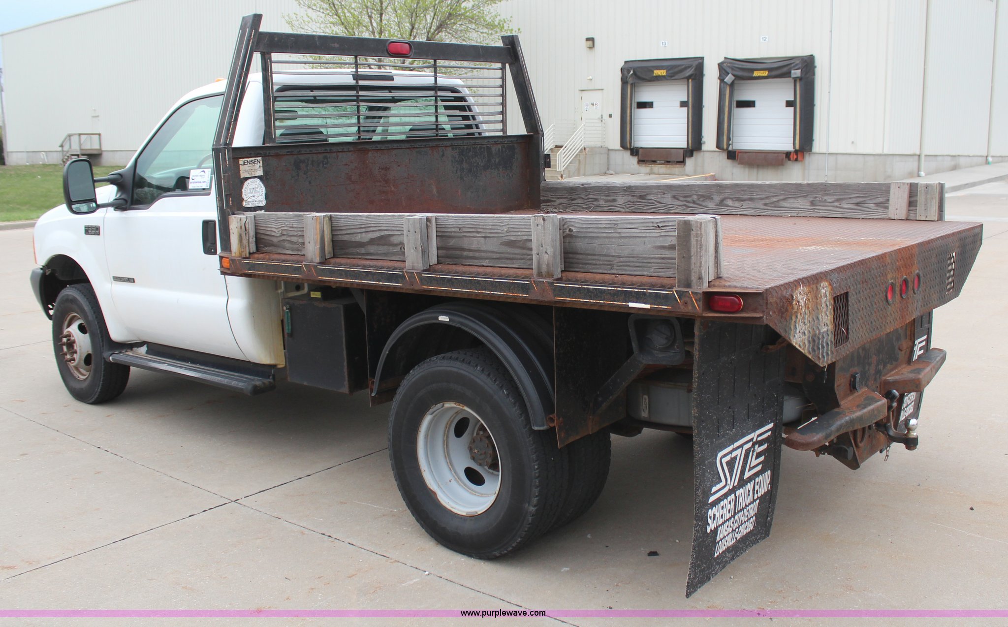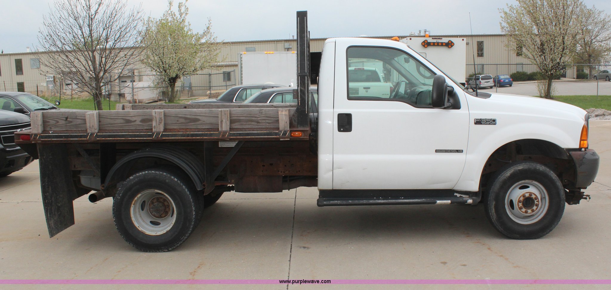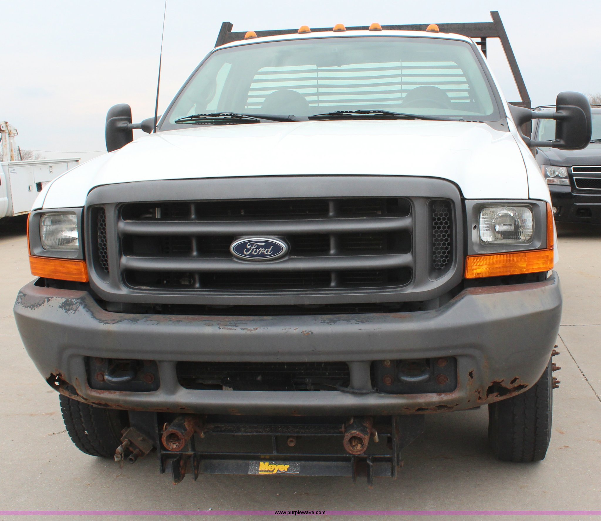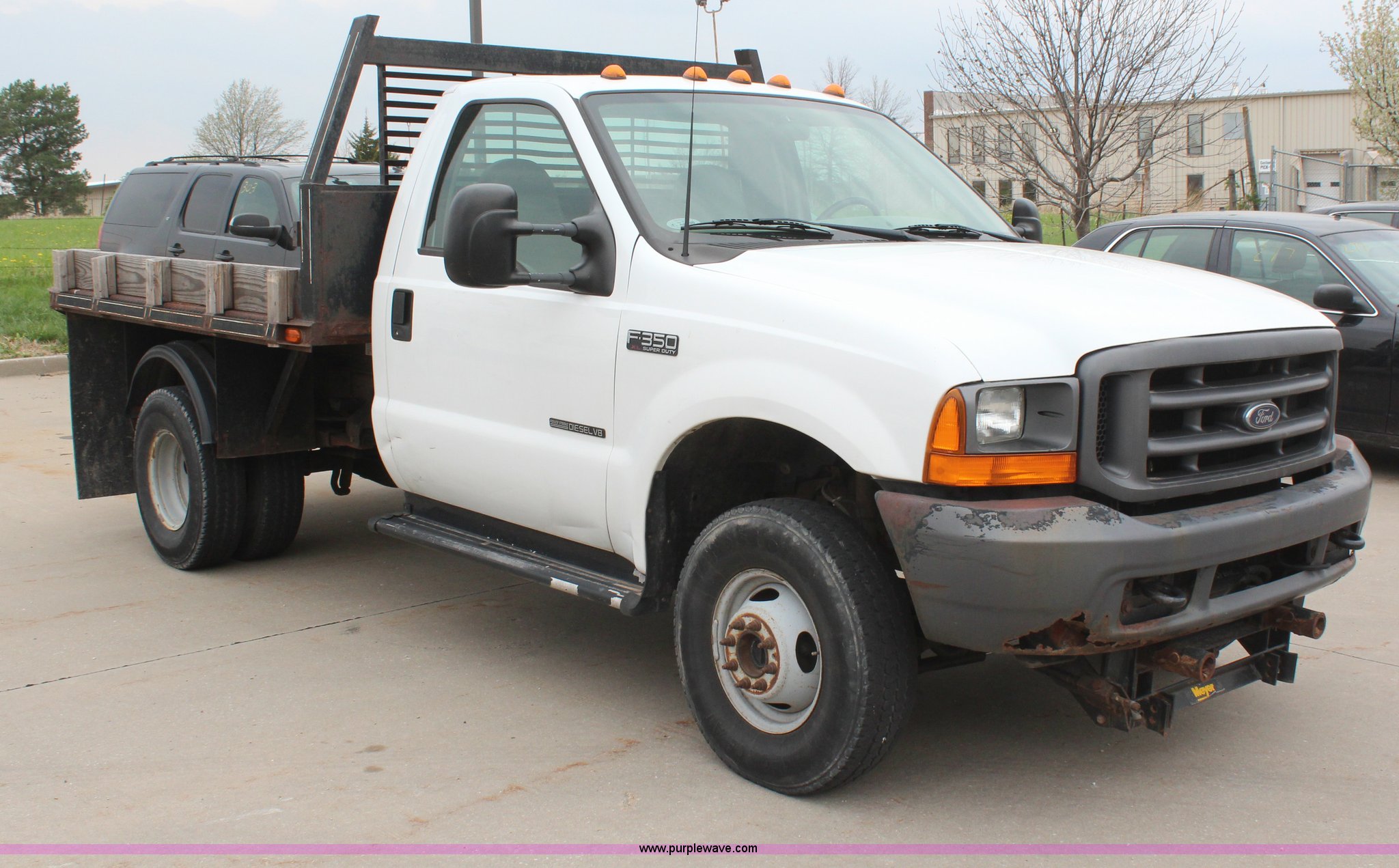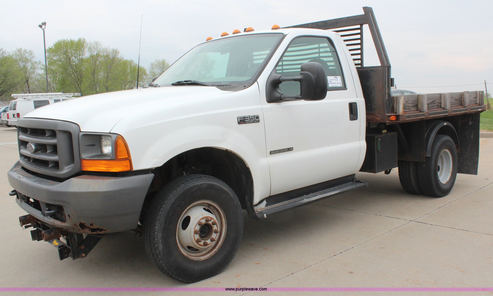 Purple Wave is selling a used 3/4 or 1 Ton Pickup or Van in Kansas. This item is a 2001 Ford F350 Super Duty XL flatbed truck with the following: 74,456 miles on odometer, 3,354 hours on meter, 7.3L V8 OHV 16V turbo diesel engine, Automatic transmission, Four wheel drive, AC and heat, AM/FM, Manual windows and locks, Vinyl interior, 9'L x 8'W flatbed, Pintle hitch, Rear hydraulics, Under hood hydraulic pump, Meyer plow bracket with controls, No snow plow, 235/85R16 tires, Driver's seat torn, Unit# JCW5105