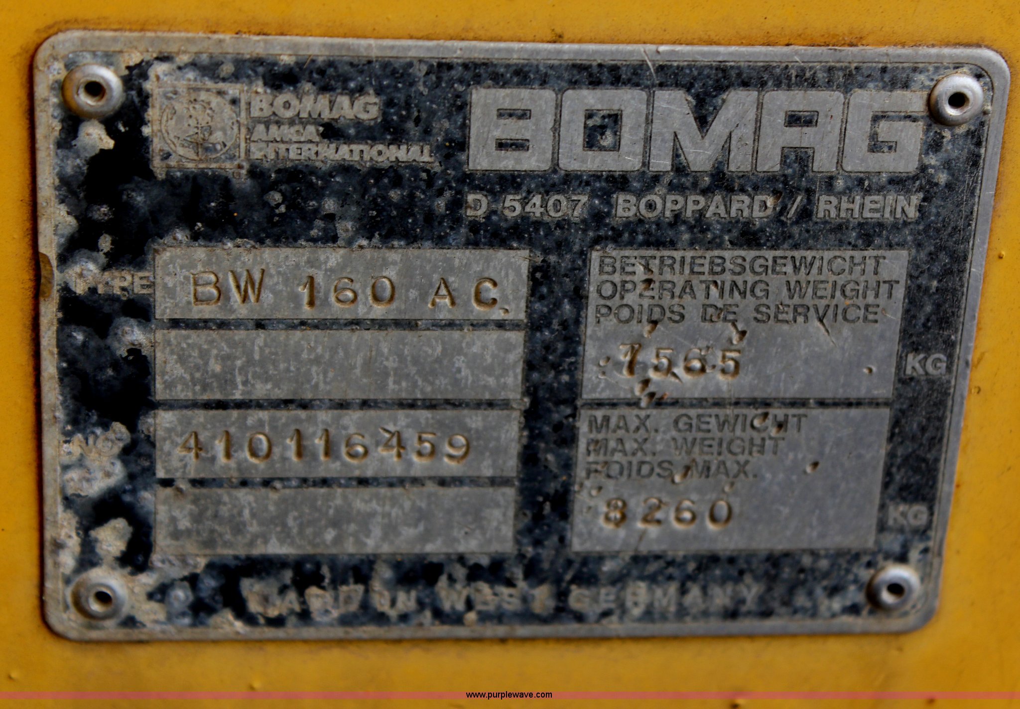 Purple Wave is selling a used Single Drum Roller Compactor in Kansas. This item is a Bomag 160AC vibratory roller with the following: 321 hours on meter, Deutz four cylinder diesel engine, 68 HP, 66"W x 47" diameter drum, 11.00-20 rear tires, Serial 410116459