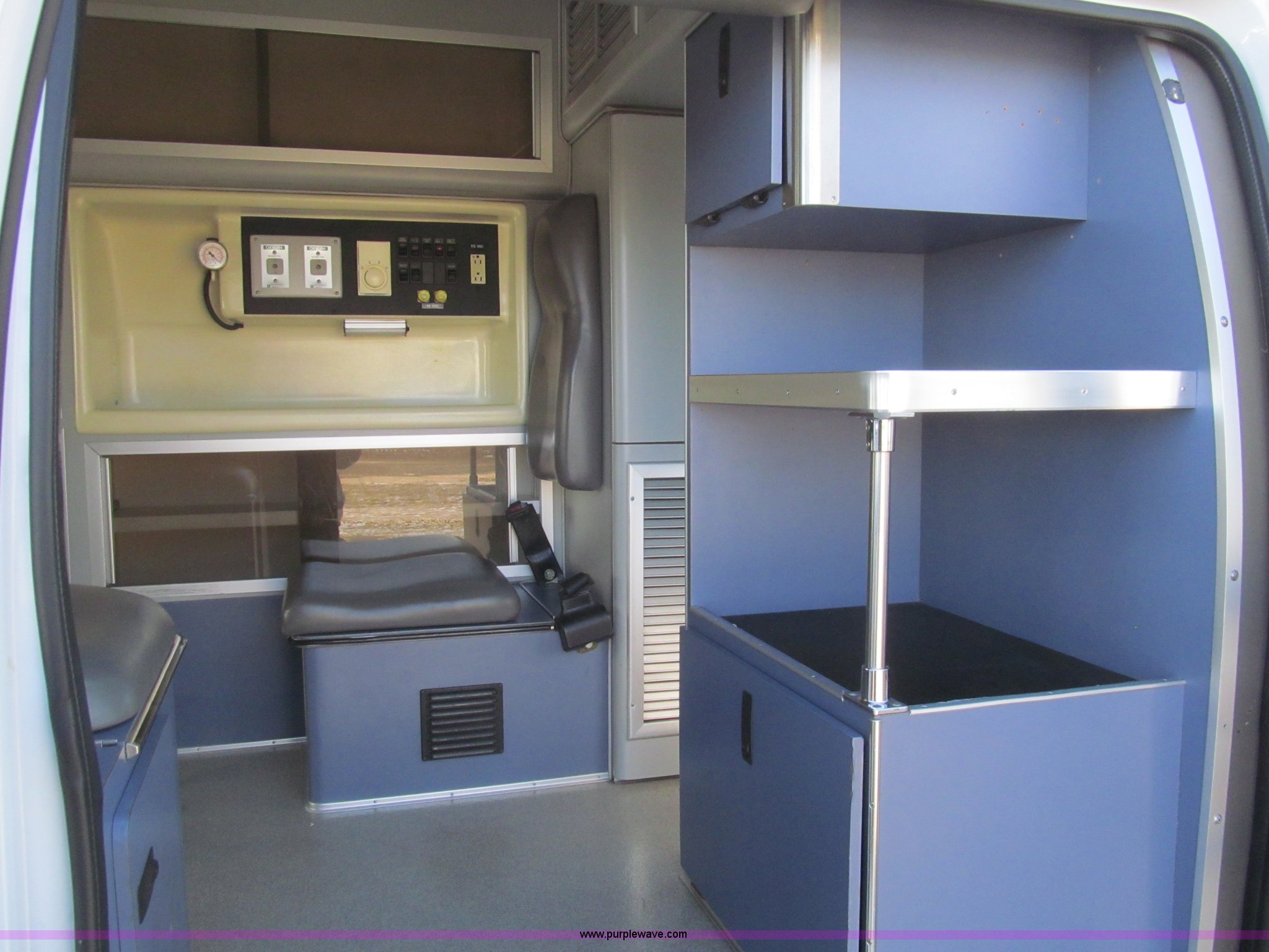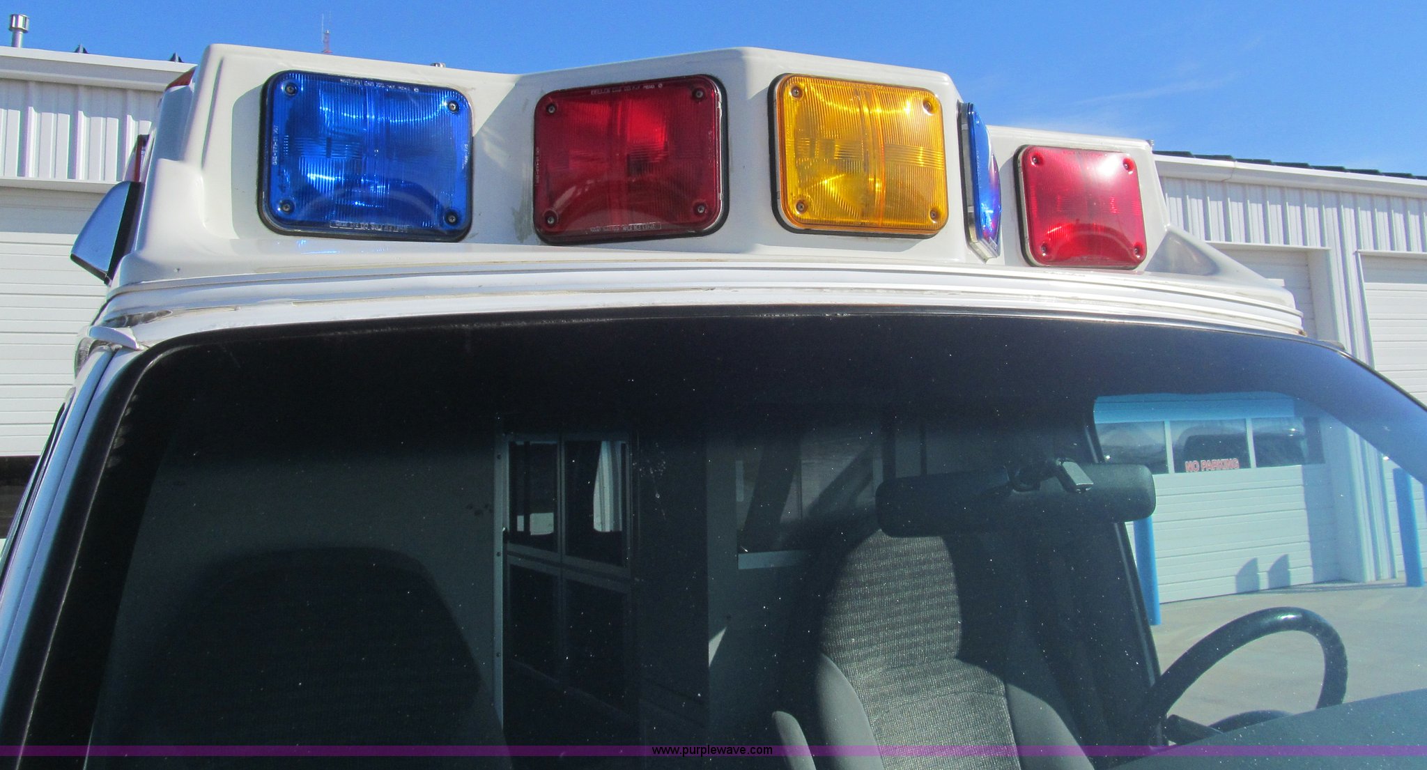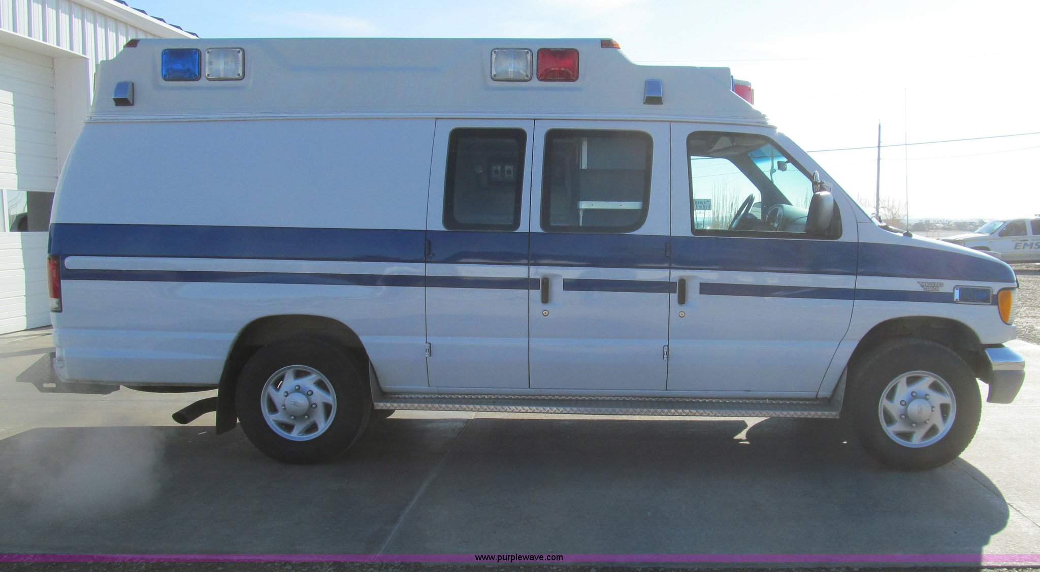 Purple Wave is selling a used Fire Truck or Emergency Vehicle in Kansas. This item is a 1998 Ford Econoline E350 Super ambulance with the following: 195,876 actual miles, 3,558 hours on meter, 7.3L V8 OHV 16V turbo diesel engine, Automatic transmission, AC and heat, Tilt, Cruise, AM/FM/cassette, Power windows and locks, Cloth interior, Whelen PA system, Light bar control panel, Oxygen hookups, Heat, vent, volume, and auxiliary controls, 12 VOC and 115 VAC outlets, Internal storage, 245/75R16 tires, Injectors replaced in 2013, Serviced every 100 to 200 hours