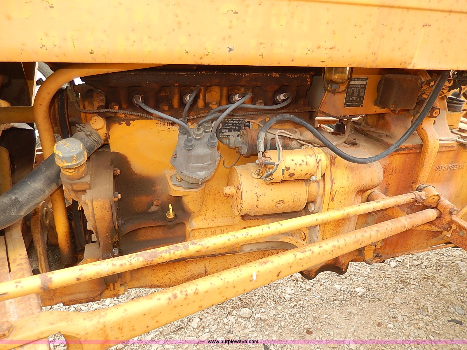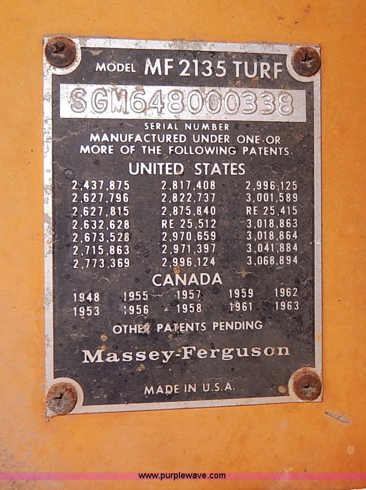 Purple Wave is selling a used Tractor in Kansas. This item is a 1966 Massey-Ferguson 2135 Turf Special tractor with the following: 2,774 hours on meter, Continental 2.2L four cylinder gas engine, 39 HP, Serial 747606, 3F-1R gears, Hi-Lo ranges, Front and rear lights, One lens missing, Three point, 540 PTO, 7.50-10 front tires, Worn, 11.2-28 rear tires, Seat cushion needs replaced, Serial SGM648000338