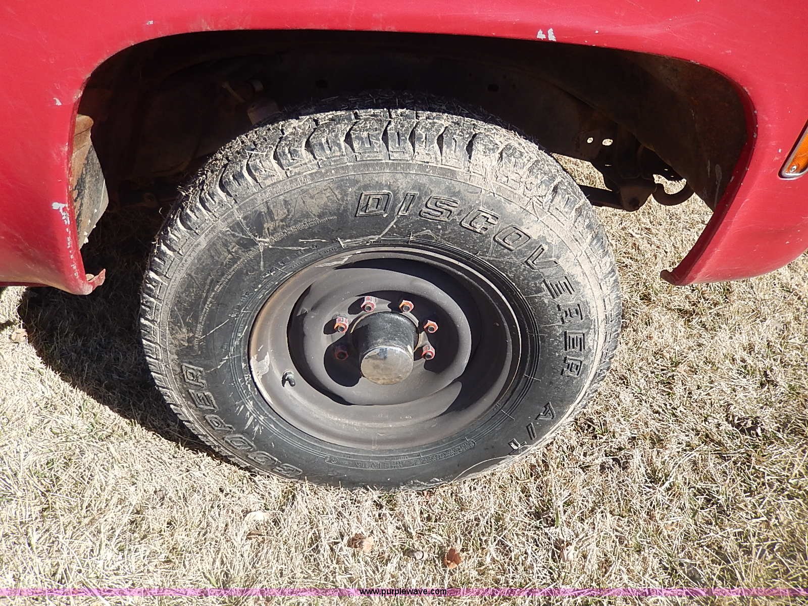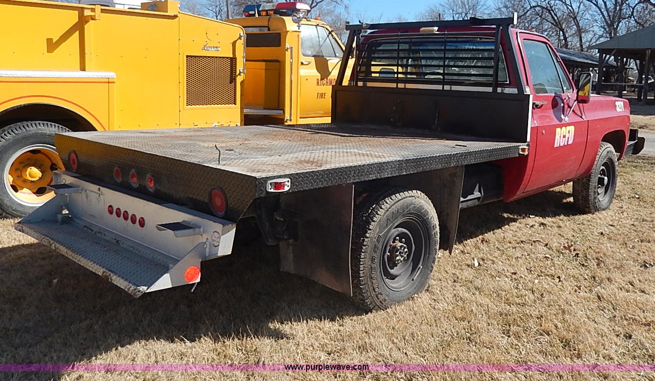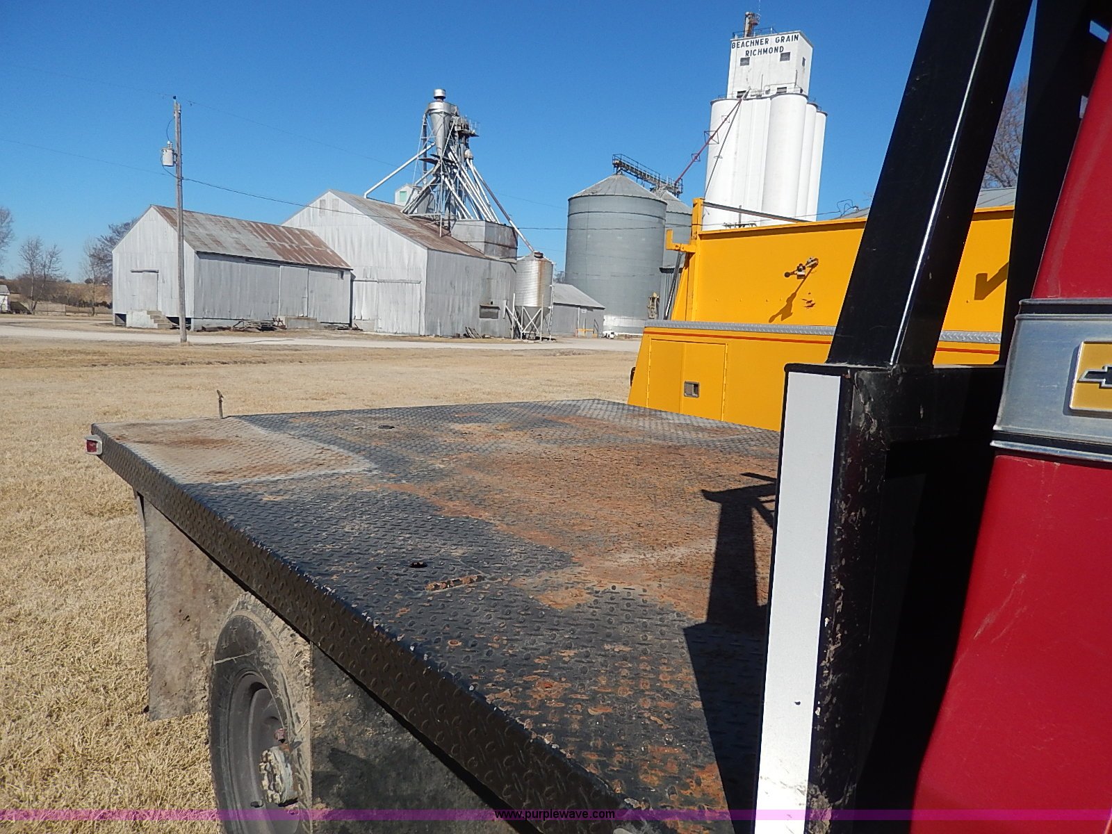 Purple Wave is selling a used 1/2 Ton Pickup or Van in Kansas. This item is a 1979 Chevrolet Scottsdale flatbed truck with the following: 92,091 miles on odometer, V8 gas engine, Engine rebuilt six years ago, Automatic transmission, Transmission rebuilt five years ago, Four wheel drive, AC and heat, Manual windows and locks, Vinyl interior, 102" x 82" flatbed, Steel construction, 6' x 19" front platform, Water hookup, Dual fuel tanks, 235/85R16 tires, Side mirrors cracked, Paint peeling, Exterior dome light covers need replaced