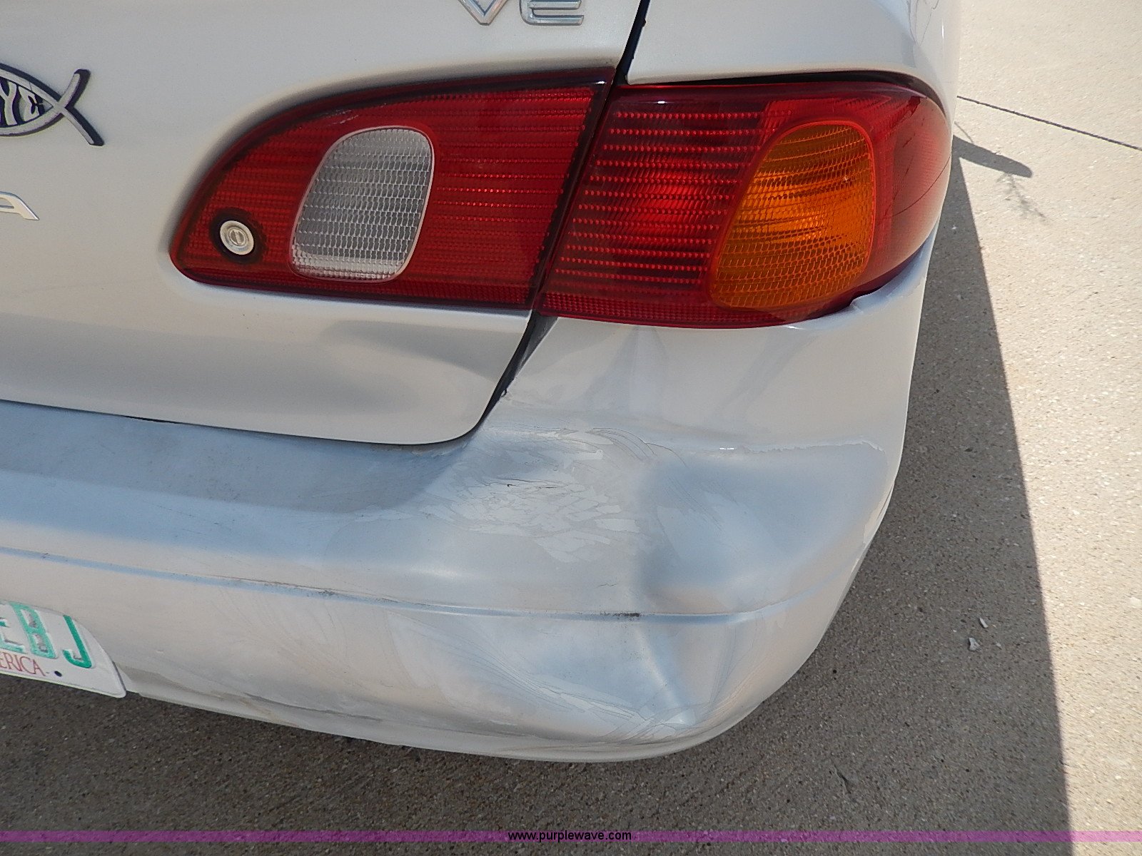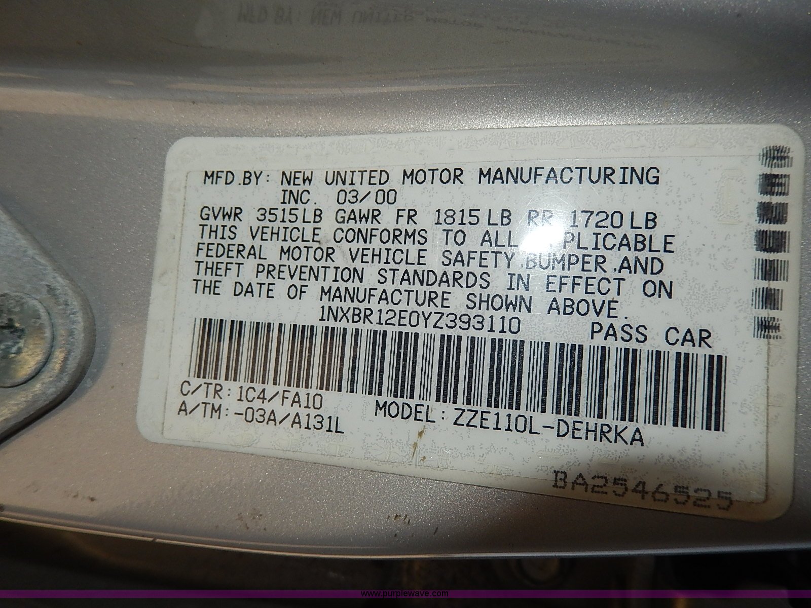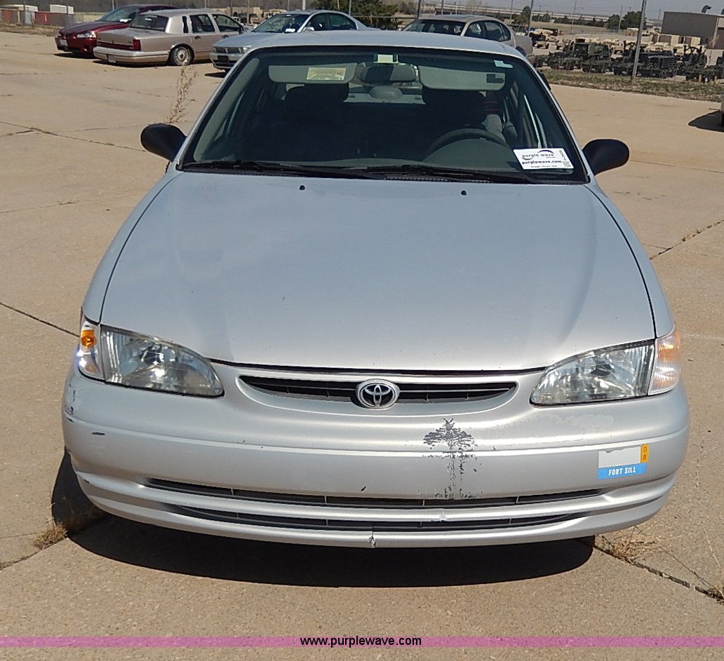Purple Wave is selling a used Wrecked and Abandoned in Kansas. This item is a 2000 Toyota Corolla VE with the following: Unknown miles on odometer, 1.8L L4 DOHC 16V gas engine, Automatic transmission, AC and heat, AM/FM/Cassette, Manual windows and locks, Cloth interior, 175/65R14 tires, No keys, Driver door handle and latch are broken, Interior/exterior cosmetic damage, Unknown running condition, Unit# 99995