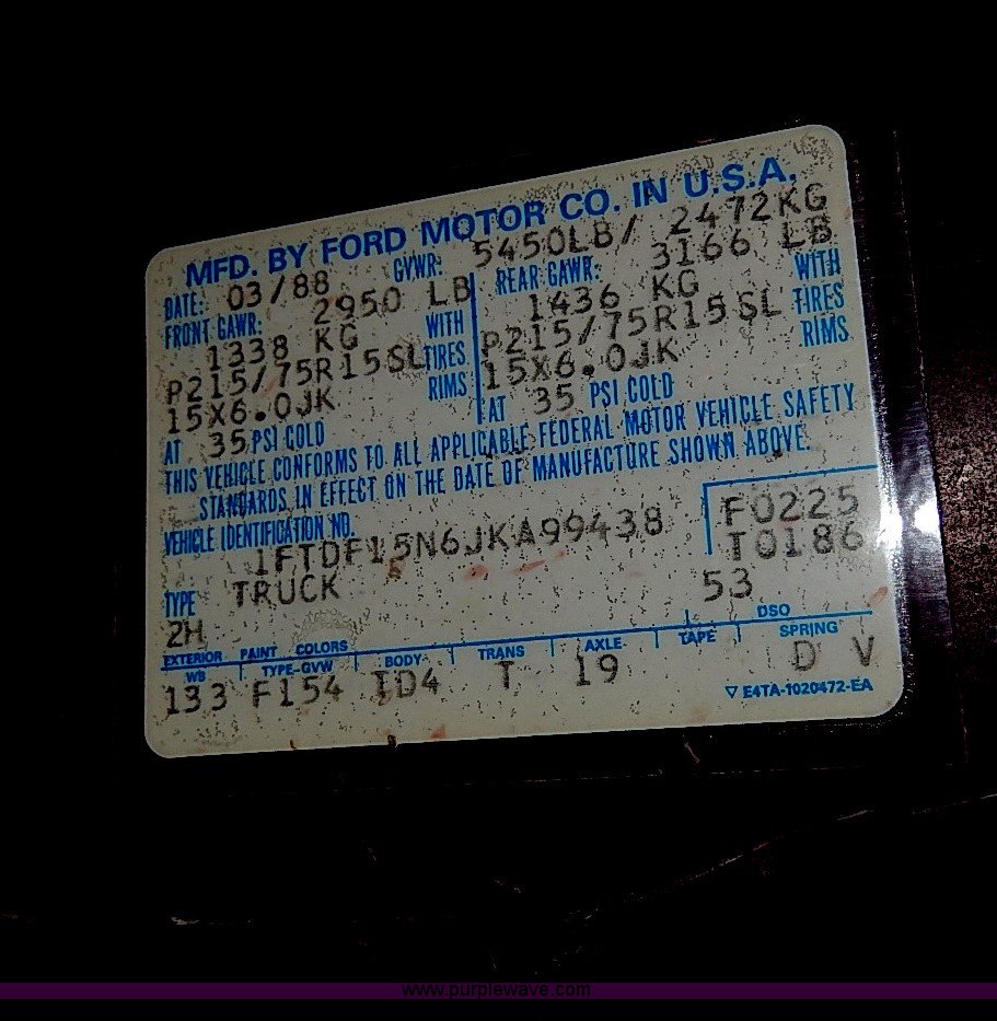1988 Ford F150. 77,343 miles on odometer, 5.0L V8 OHV 16V gas engine, Automatic transmission, AC and heat, Tilt, Cruise, AM/FM, Power windows and locks, Cloth interior, Long bed, 225/75R15 tires Tires are flat, No keys, No battery, Interior/exterior cosmetic damage, Unknown running condition, Unit# 2011182. Vehicle abandoned. No additional information available.. Buyer will received paperwork indicating the abandoned status of the vehicle and which is sufficient to receive a title.. See removal details below. 1FTDF15N6JKA99438. NAFI Abandoned Vehicles. Building 7920A 7816 Apennines Dr.. Ft. Riley, KS 66442