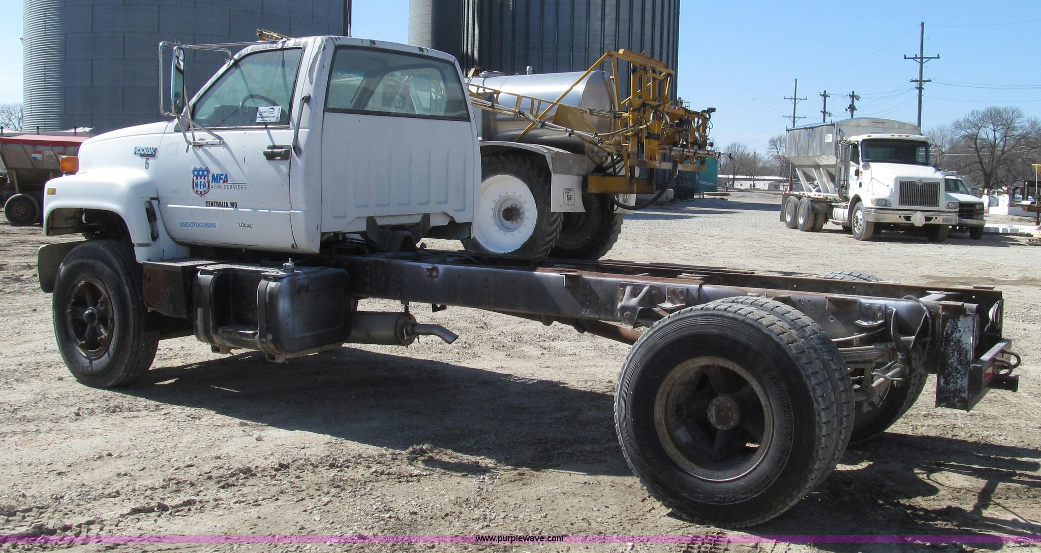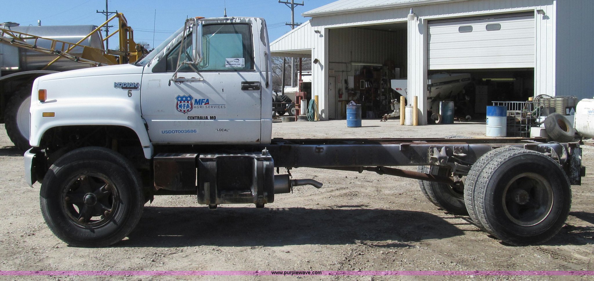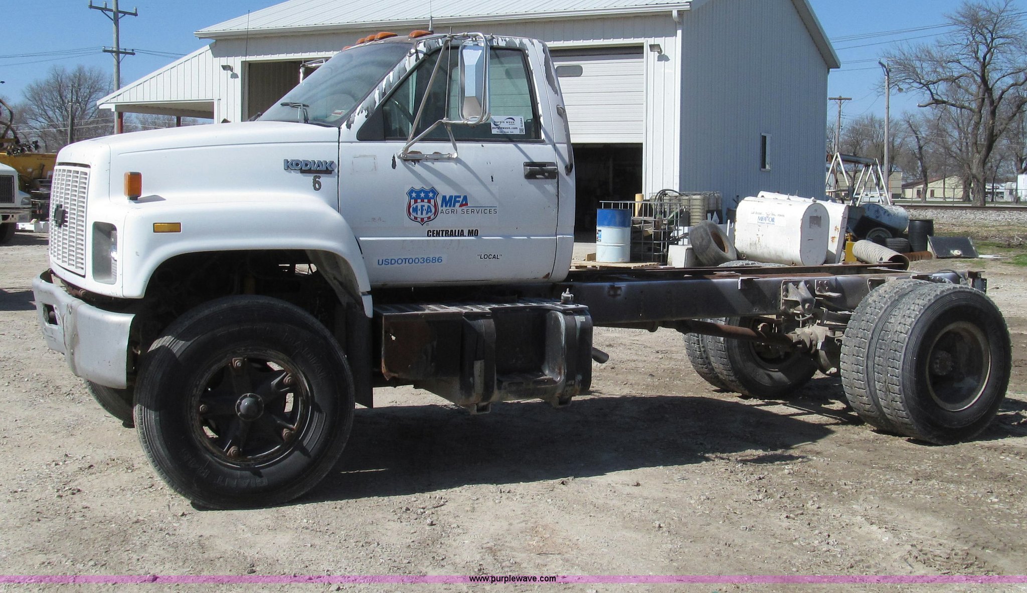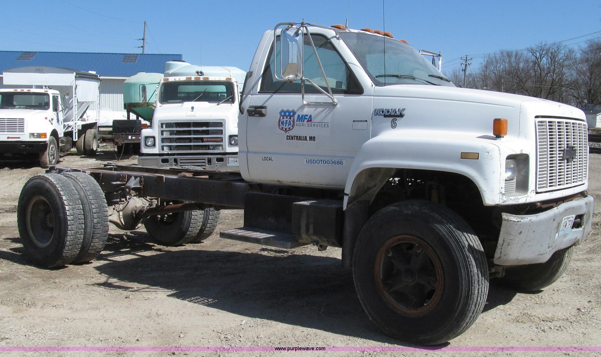 Purple Wave is selling a used Truck Chassis in Missouri. This item is a 1991 Chevrolet Kodiak truck cab and chassis with the following: 143,354 miles on odometer, 6.0L V8 gas engine, Five speed manual transmission, Two speed axle, Heat, AM/FM, Spring suspension seat, Brake controller, Front tow hooks, Brake lock control, Receiver hitch, Trailer wiring, 50 gallon fuel tank, PTO, Spring suspension, Hydraulic brakes, 10.00R20 tires, Paint peeling, Rust, Service records available, Unit# 6