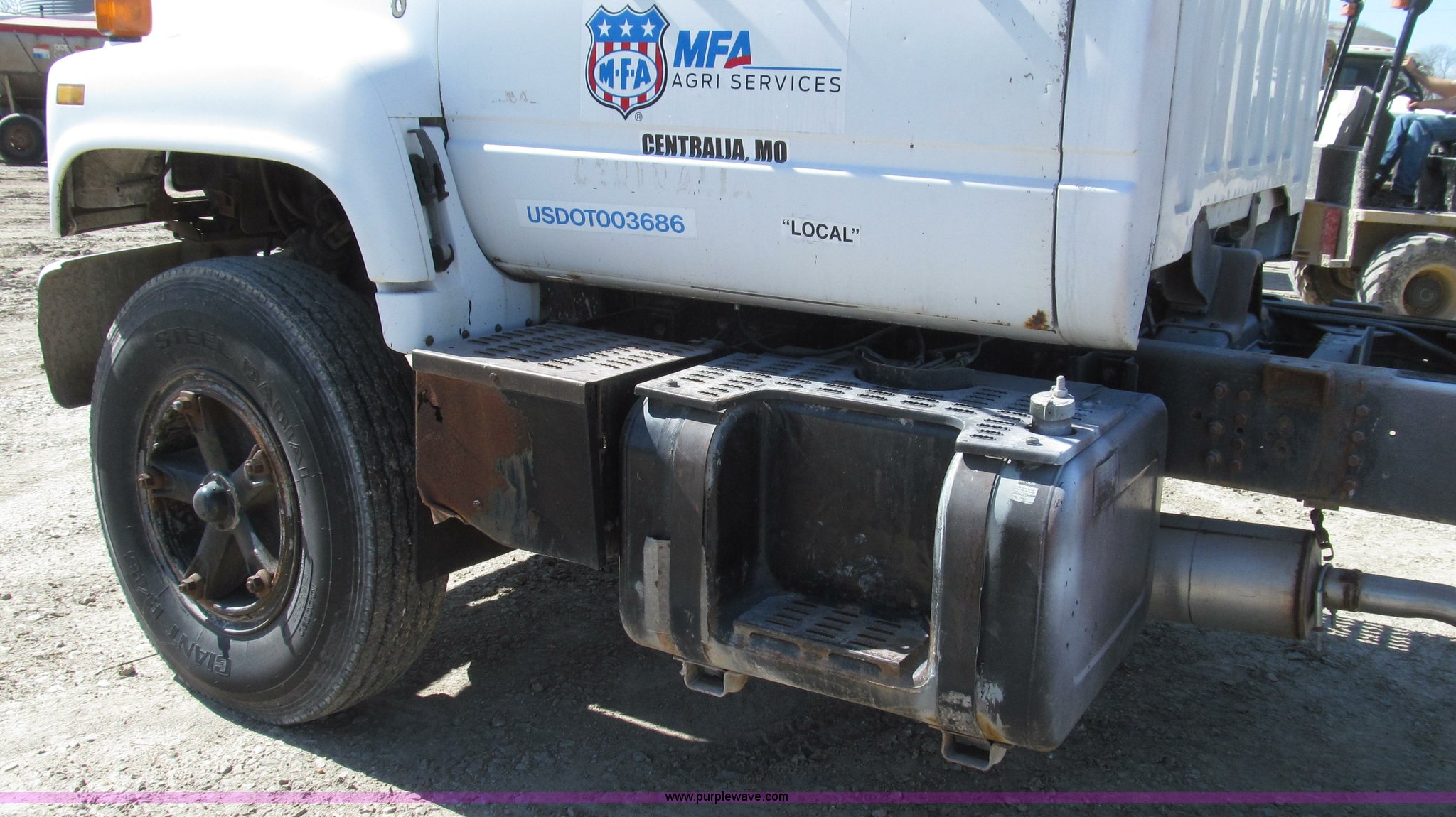 1991 Chevrolet Kodiak truck cab and chassis. 143,354 miles on odometer, 6.0L V8 gas engine, Five speed manual transmission, Two speed axle, Heat, AM/FM, Spring suspension seat, Brake controller, Front tow hooks, Brake lock control, Receiver hitch, Trailer wiring, 50 gallon fuel tank, PTO, Spring suspension, Hydraulic brakes, 10.00R20 tires, Paint peeling, Rust, Service records available, Unit# 6. 1GBL7H1P9MJ108317. MFA, Inc.. 202 N Jefferson. Centralia, MO 65240