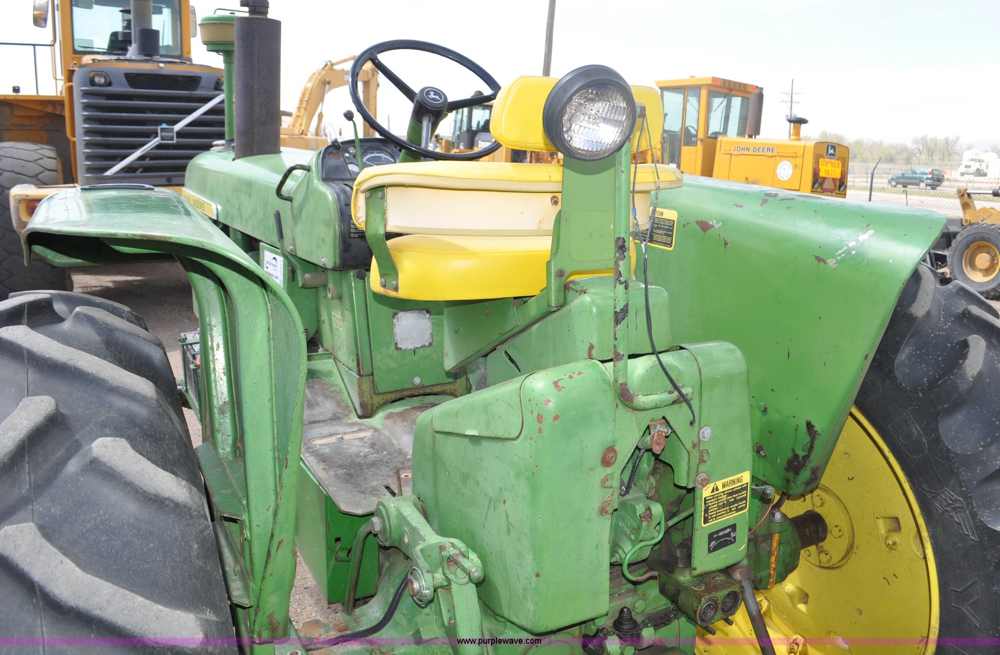 Purple Wave is selling a used Tractor in Colorado. This item is a 1965 John Deere 4020 tractor with the following: Unknown hours on meter, John Deere 404 C.I.D. six cylinder diesel engine, 95 PTO HP, Powershift transmission, 8F-4R gears, Spring suspension seat, Three point, No top link, Draw bar, 540/1000 PTO, Rear hydraulic remote, 7.50-15 front tires, 15.5-38 rear tires, Fewer than 100 hours on engine overhaul, Fewer than 10 hours on hydraulic pump overhaul, recently replaced transmission to hydraulic pump suction pipe, and resealed transmission valve, Used with batwing mower the last three years, Serial SNT213P101227R