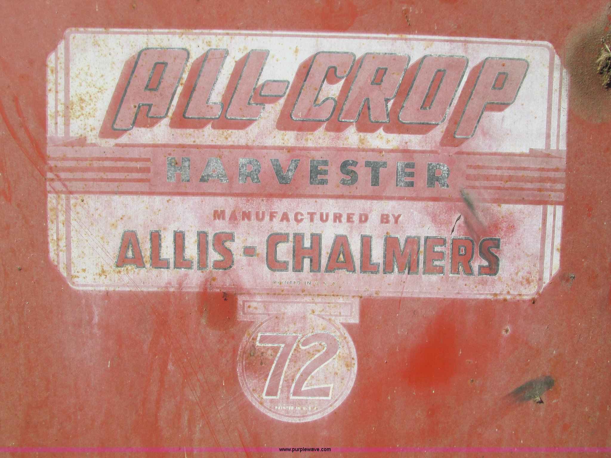 Allis Chalmers 72 All-Crop combine. 72" cut, 540 PTO, 7.5-16 tires, Recently replaced wood on reel, Last used in fall of 2013. View equipment video. Chapin Farms. 5752 County Rd 9720. West Plains, MO 65775