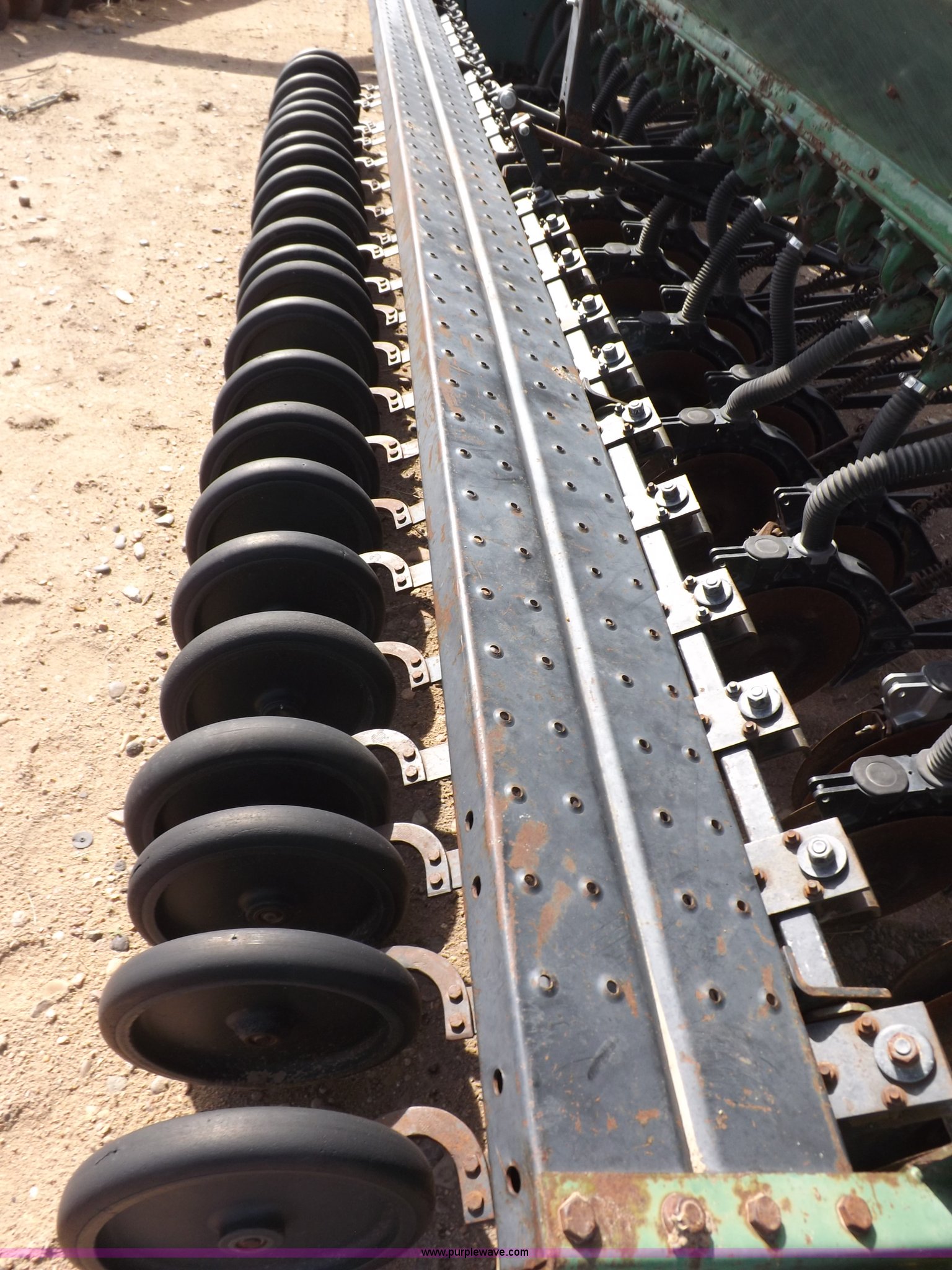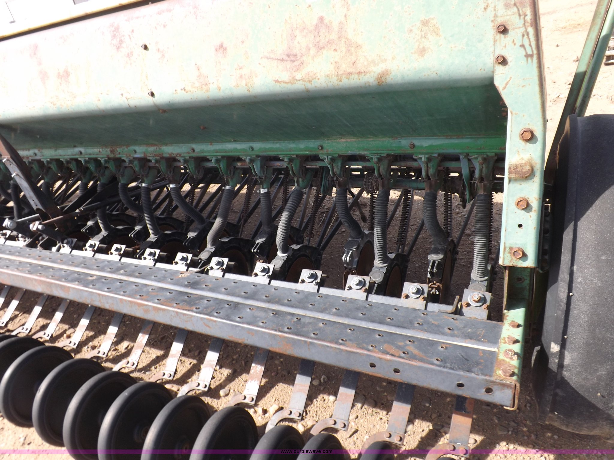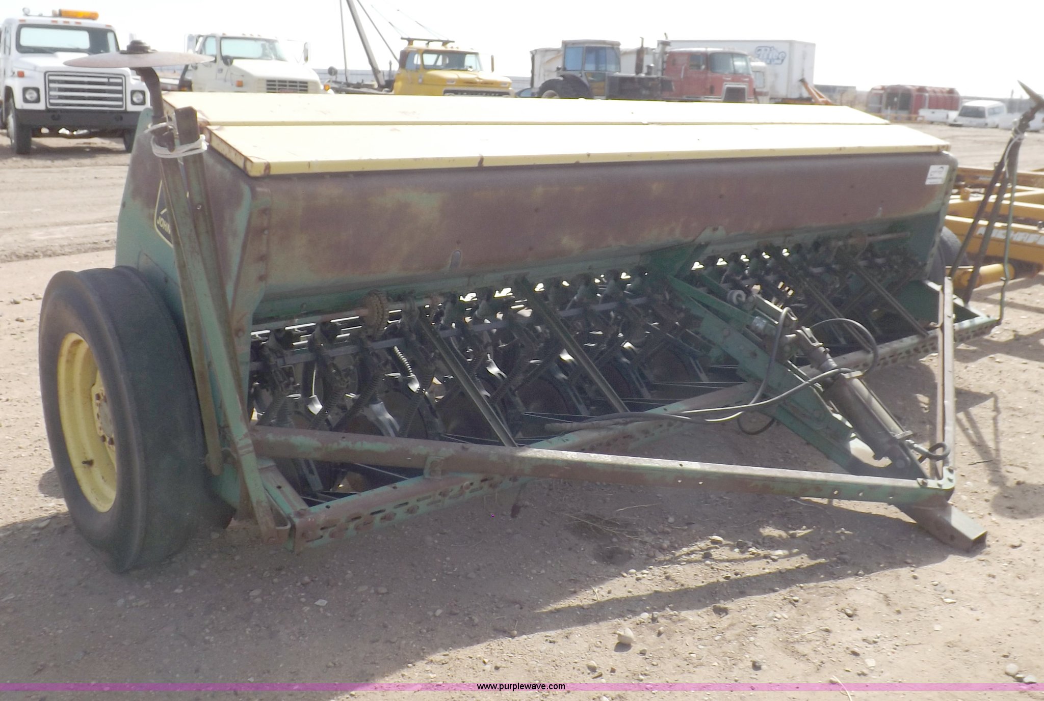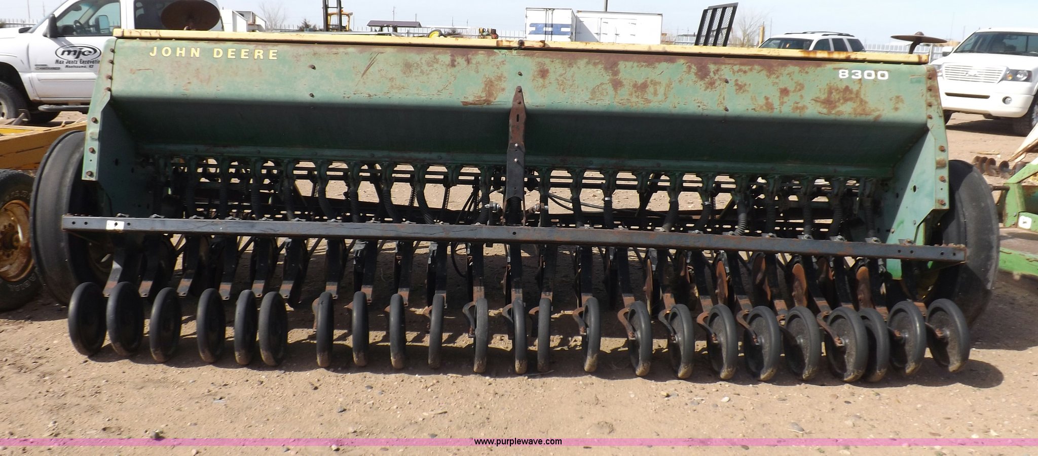 Purple Wave is selling a used Grain Drill or Seeder in Kansas. This item is a John Deere 8300 drill with the following: 13'4"W toolbar, 21 rows, 7" spacing, Bulk fill, Mechanical delivery, 2" x 12" press wheels, 14" openers, 7.50-20 tires, Serial 040897N