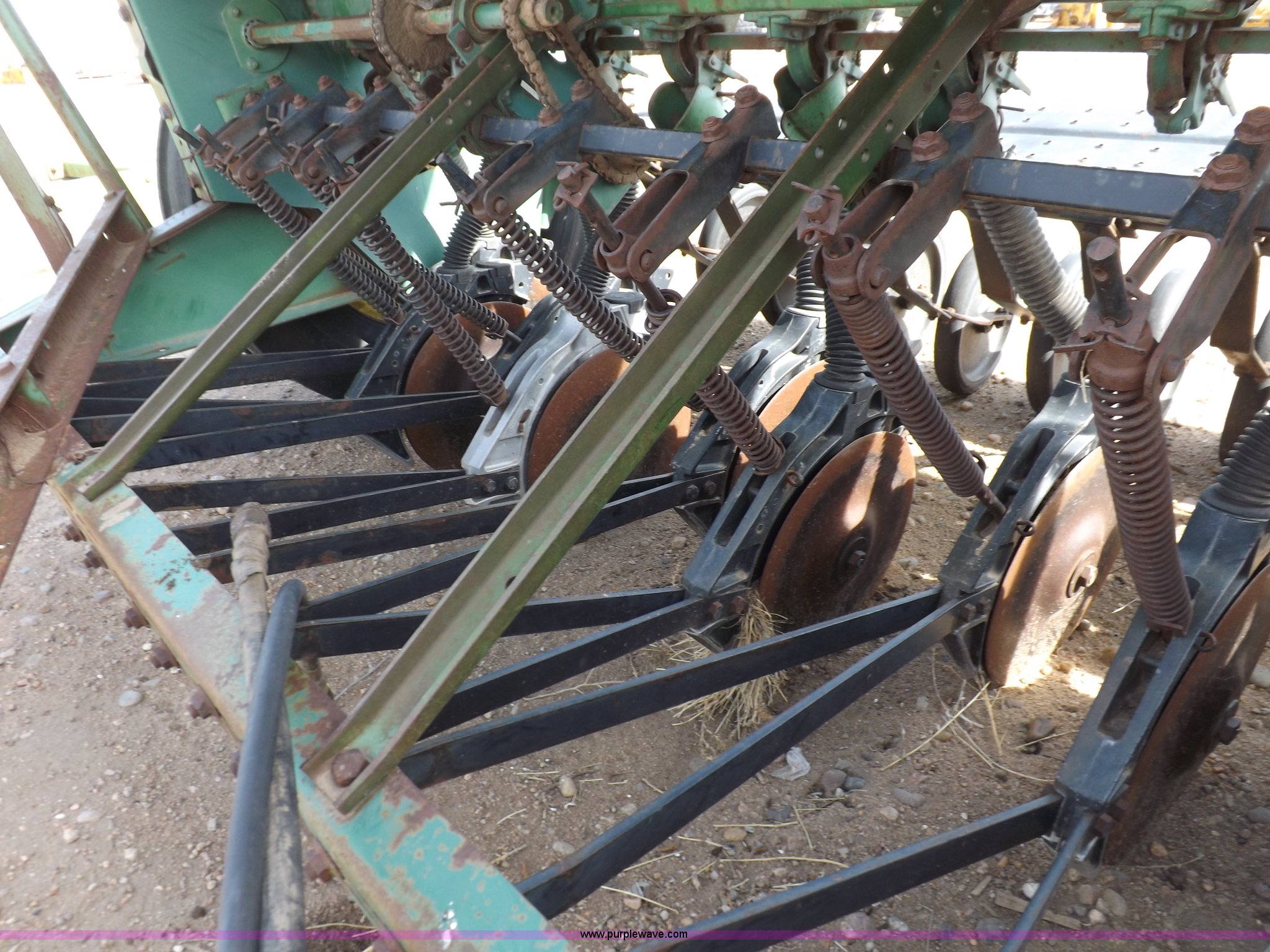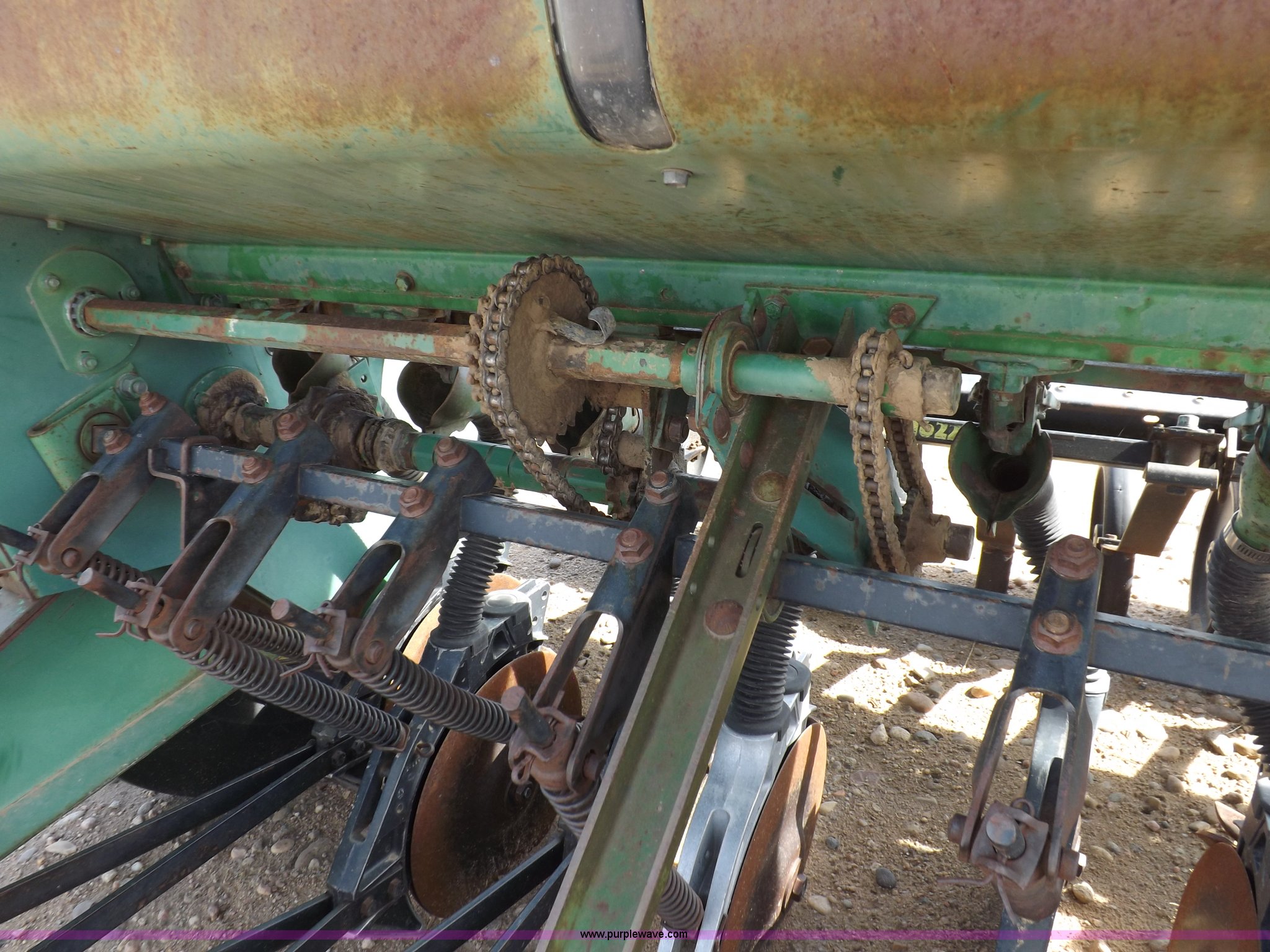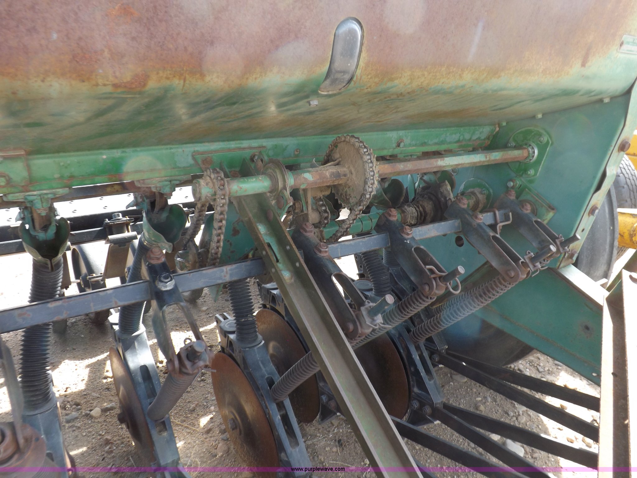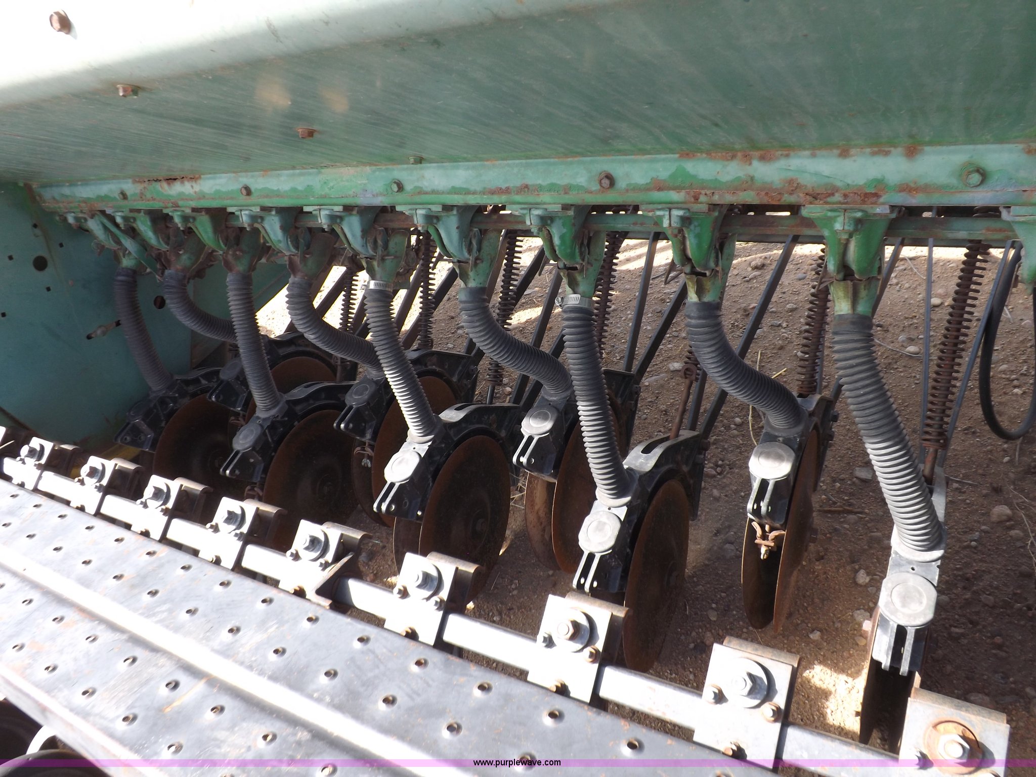 Purple Wave is selling a used Grain Drill or Seeder in Kansas. This item is a John Deere 8300 drill with the following: 13'4"W toolbar, 21 rows, 7" spacing, Bulk fill, Mechanical delivery, 2" x 12" press wheels, 14" openers, 7.50-20 tires, Serial 040897N