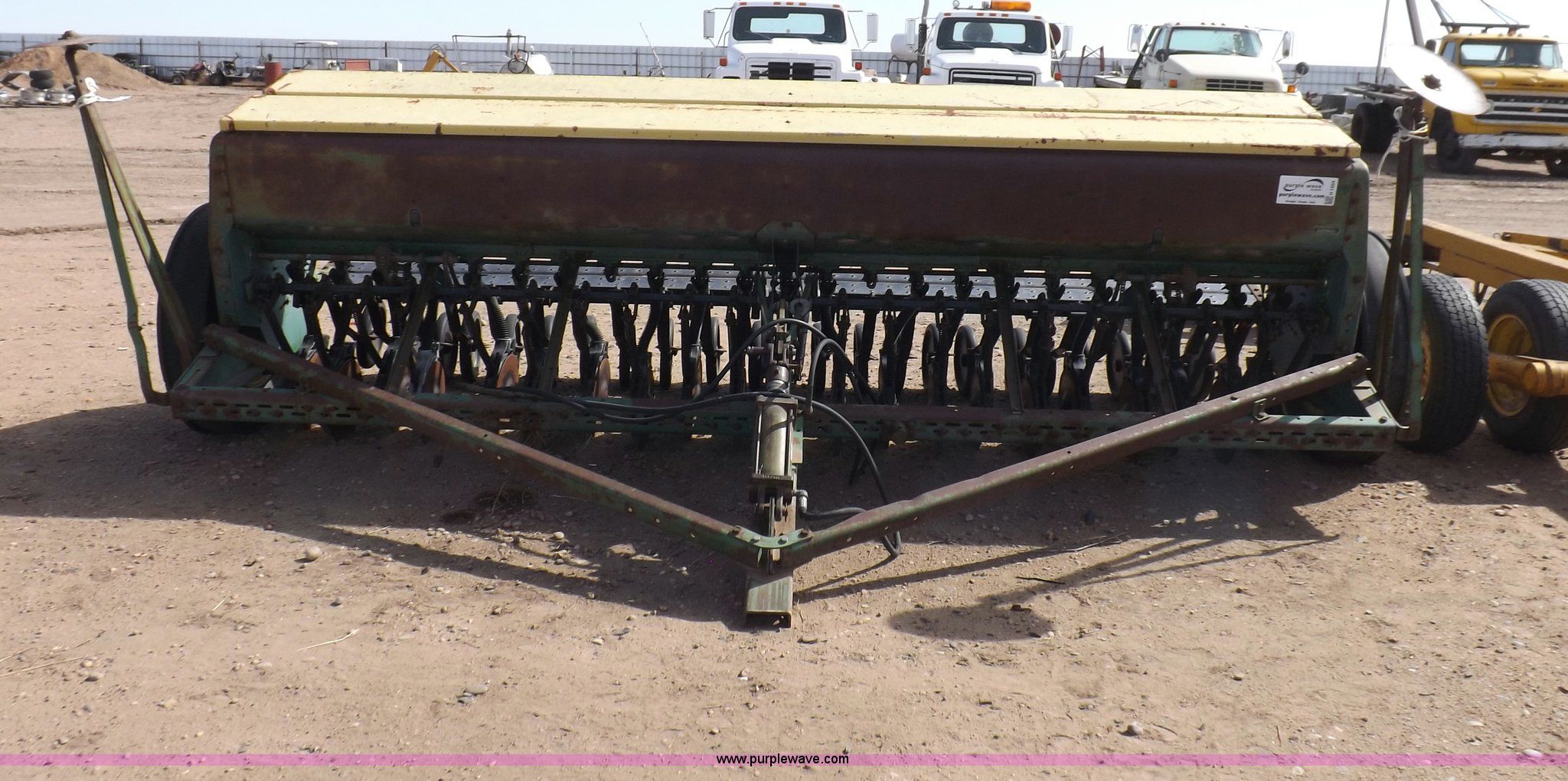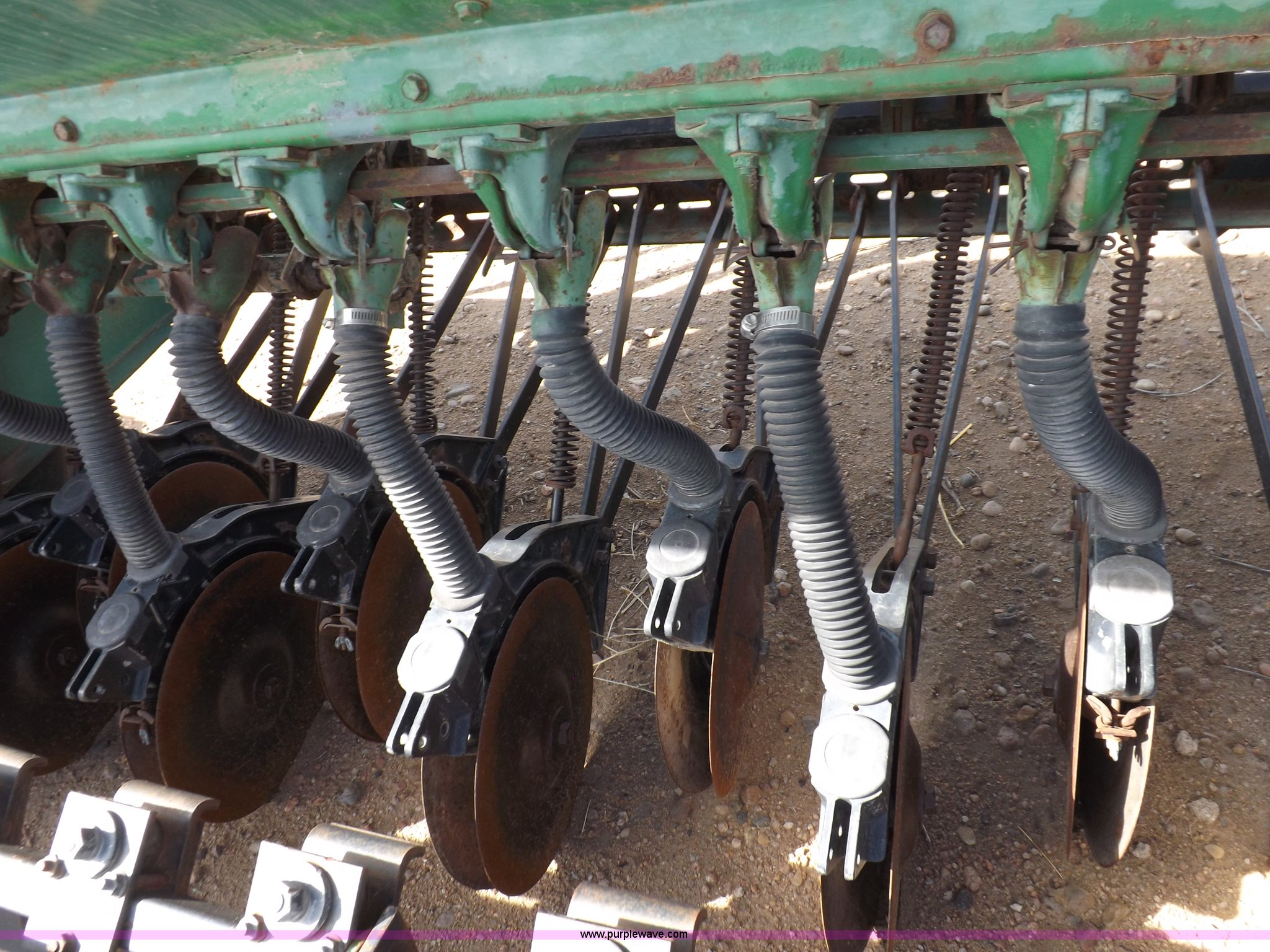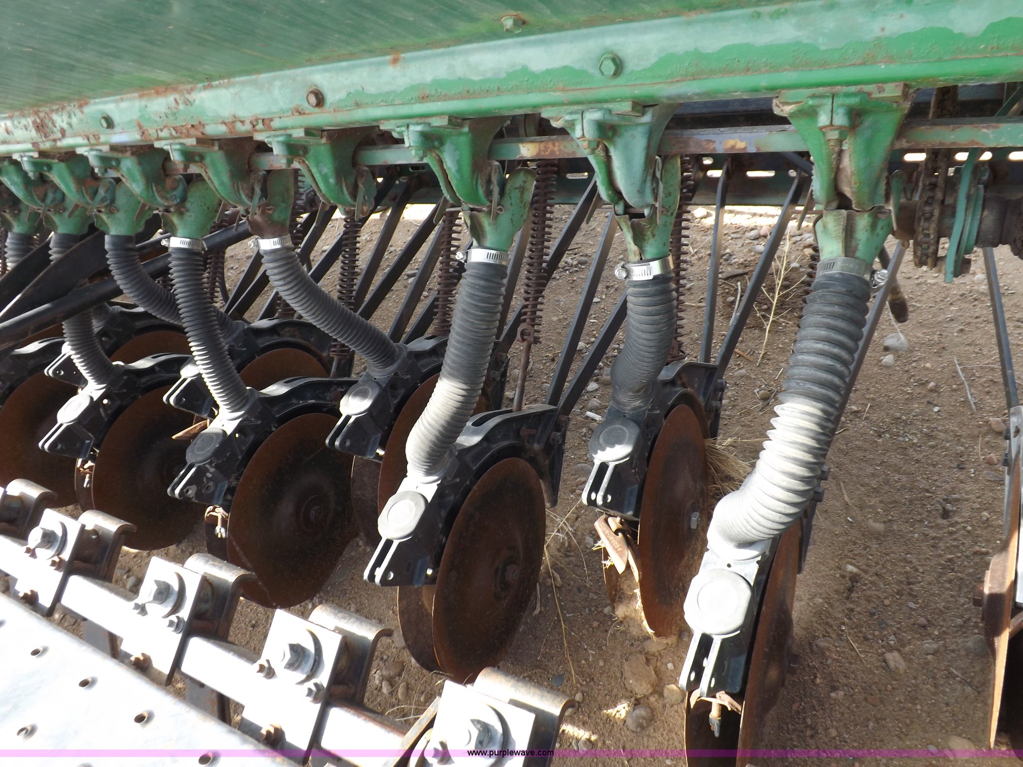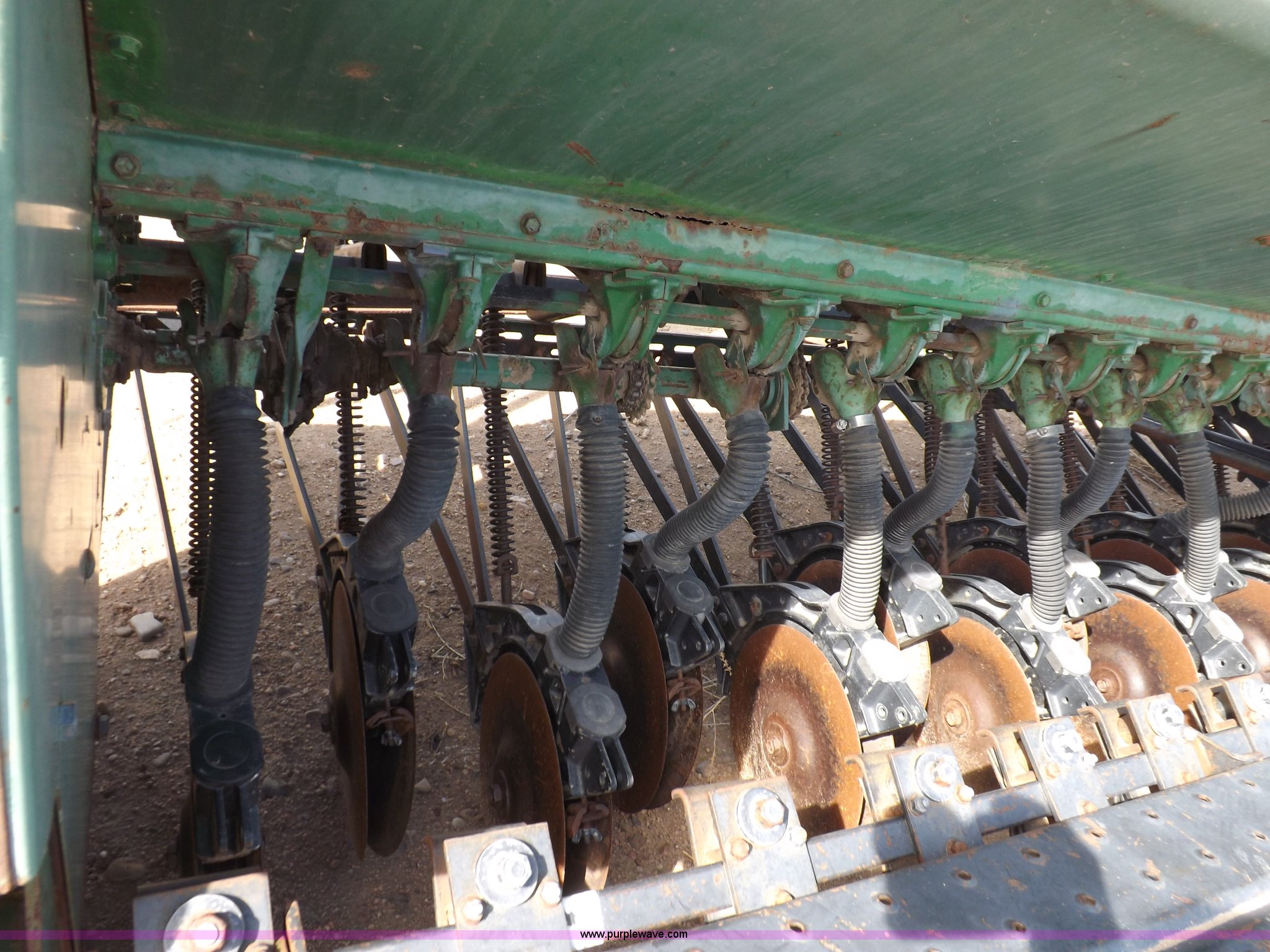 Purple Wave is selling a used Grain Drill or Seeder in Kansas. This item is a John Deere 8300 drill with the following: 13'4"W toolbar, 21 rows, 7" spacing, Bulk fill, Mechanical delivery, 2" x 12" press wheels, 14" openers, 7.50-20 tires, Serial 040897N