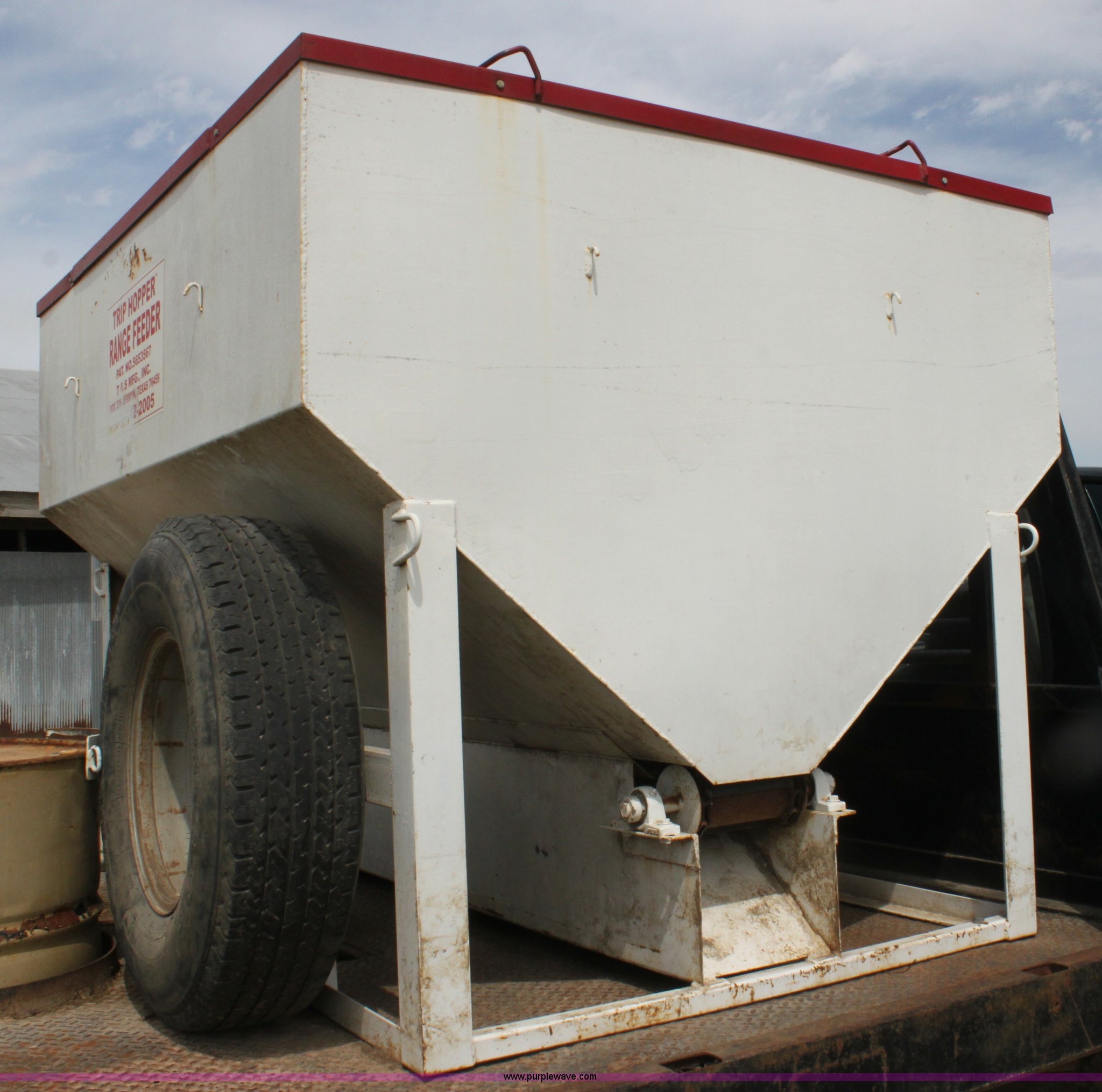T&S Manufacturing trip hopper cube feeder. Model P-856, 72"L x 60"W x 56"H, 1/2 HP motor, 1,800 RPM, 12V power, 3,000 lbs capacity, Spare tire mount. Eureka, KS 67045