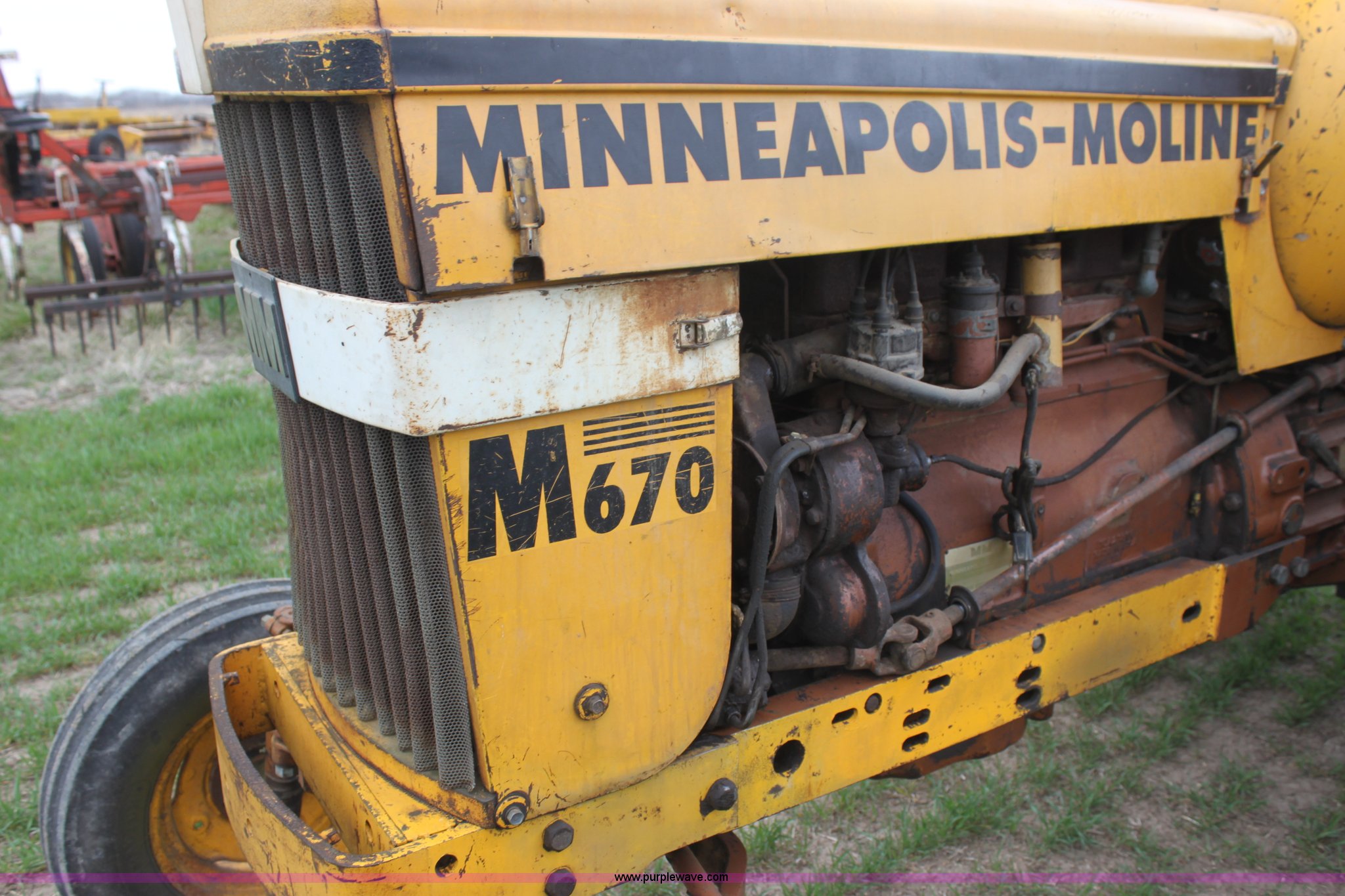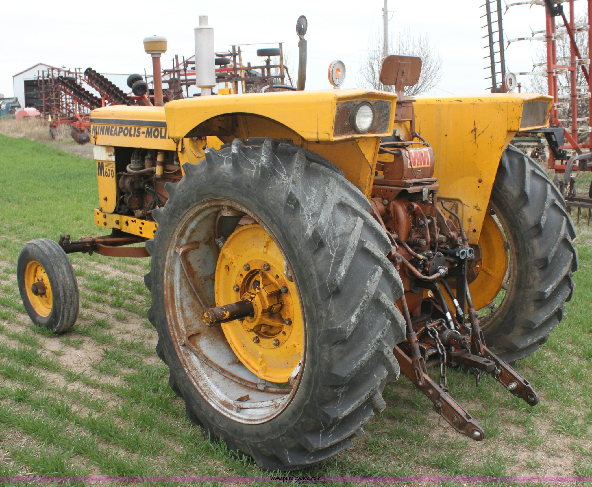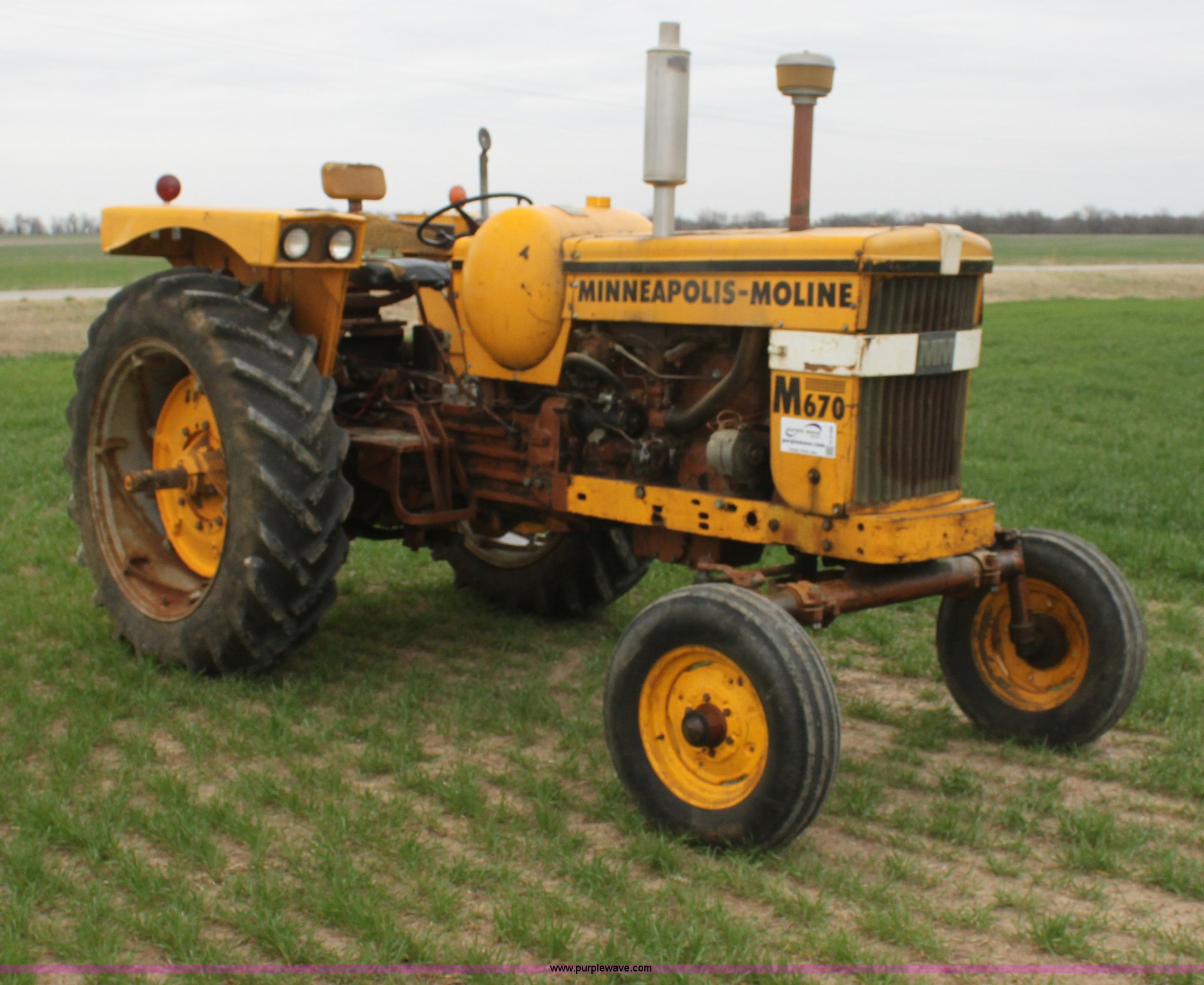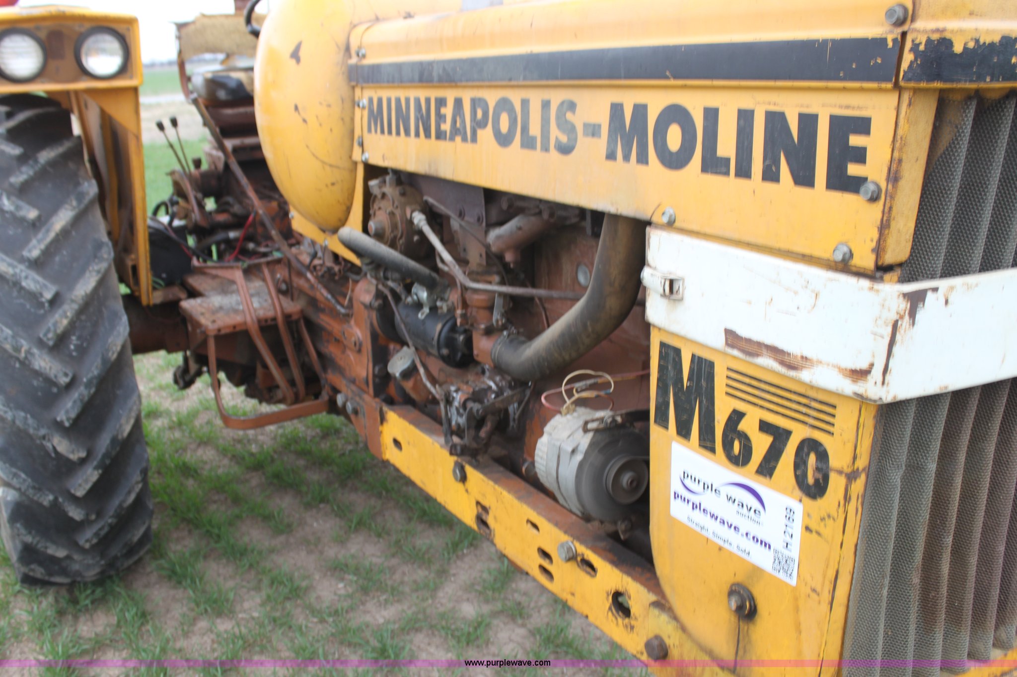 Purple Wave is selling a used Tractor in Kansas. This item is a 1965 Minneapolis Moline M670 tractor with the following: 8,734 hours on meter, Four cylinder LP engine, Model 336A-4, Serial 293D0779, 10F-2R gears, Two range amplitorque, Spring suspension seat, Power steering, Three point, 540 PTO, Draw bar, (2) rear hydraulic remotes, 6.50-16 front tires, 15.5-38 rear tires, Recently replaced muffler, PTO shaft is broken, Parts to repair broken shaft are included, Serial 29900725