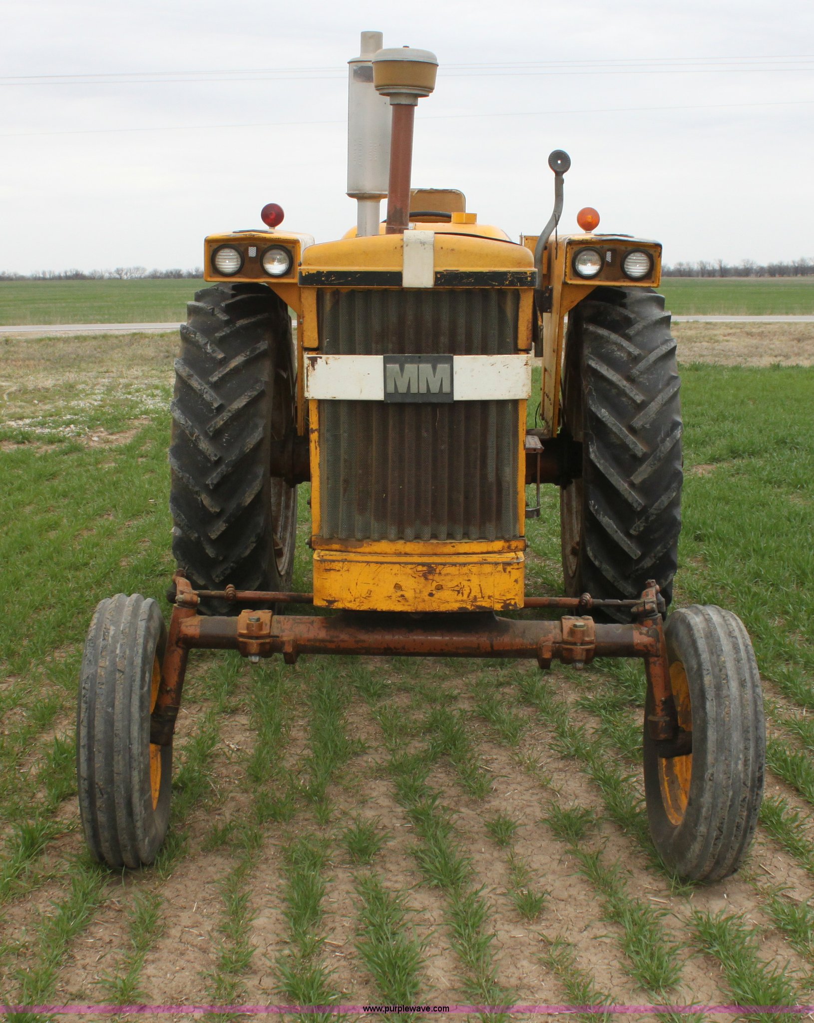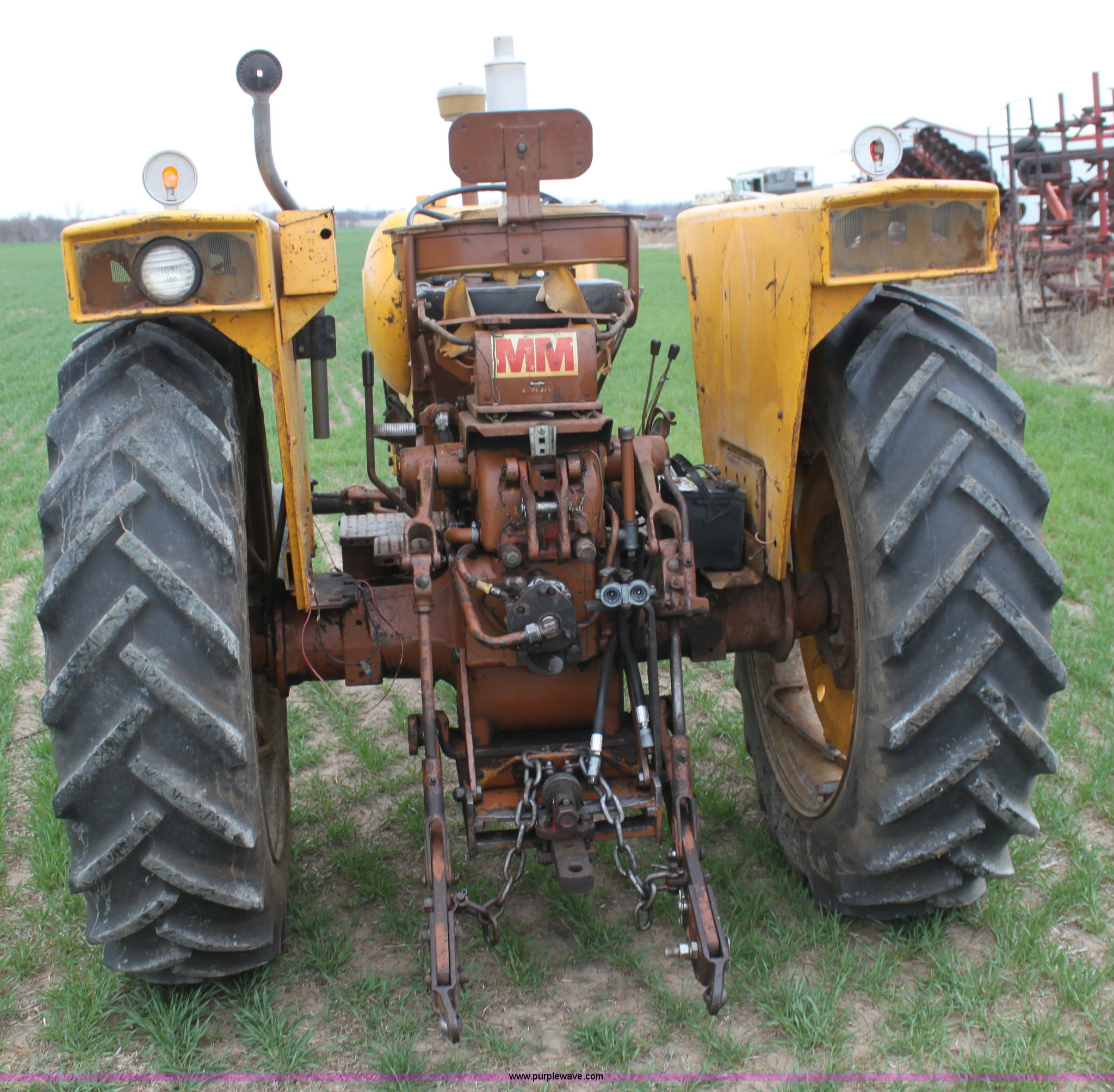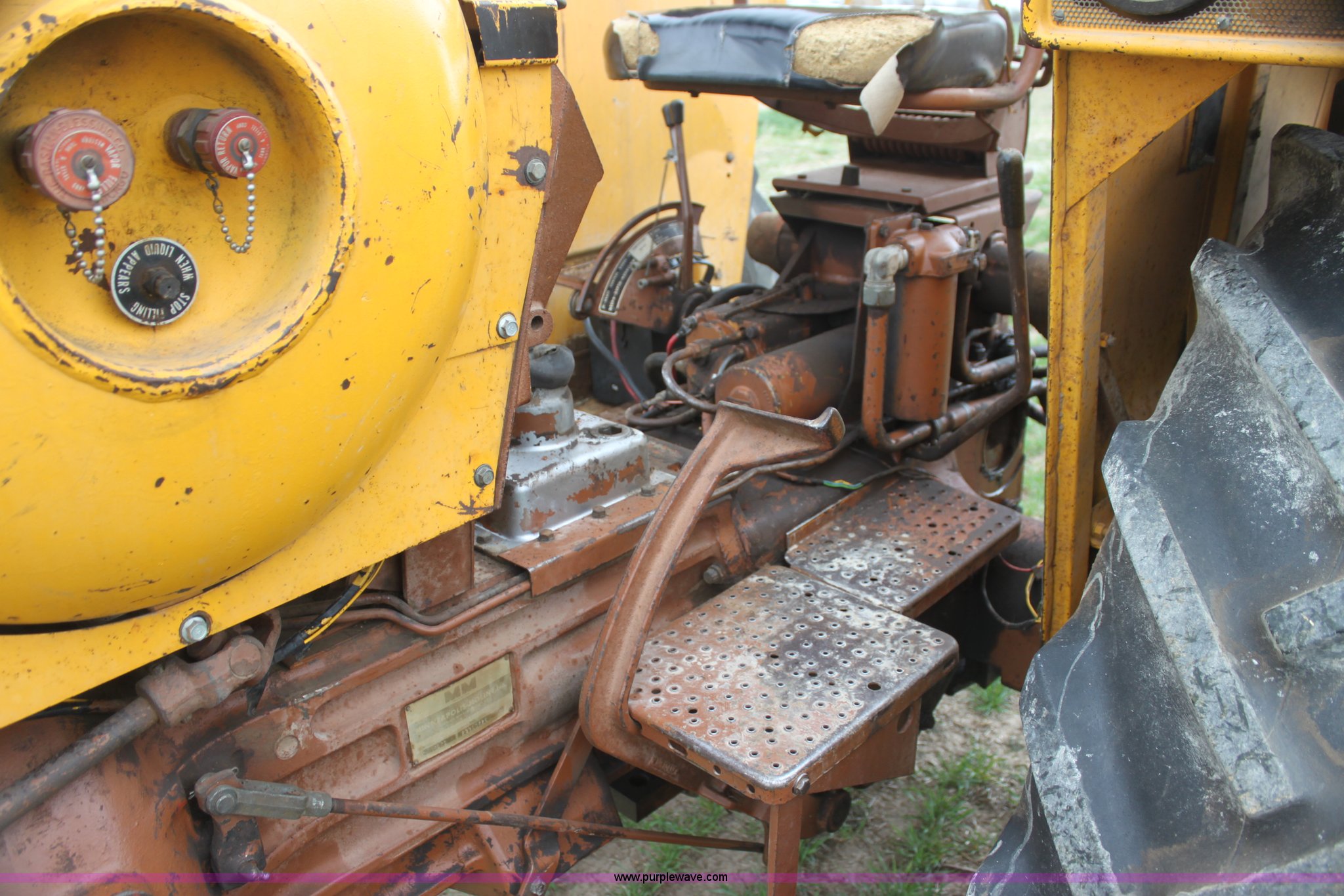 Purple Wave is selling a used Tractor in Kansas. This item is a 1965 Minneapolis Moline M670 tractor with the following: 8,734 hours on meter, Four cylinder LP engine, Model 336A-4, Serial 293D0779, 10F-2R gears, Two range amplitorque, Spring suspension seat, Power steering, Three point, 540 PTO, Draw bar, (2) rear hydraulic remotes, 6.50-16 front tires, 15.5-38 rear tires, Recently replaced muffler, PTO shaft is broken, Parts to repair broken shaft are included, Serial 29900725
